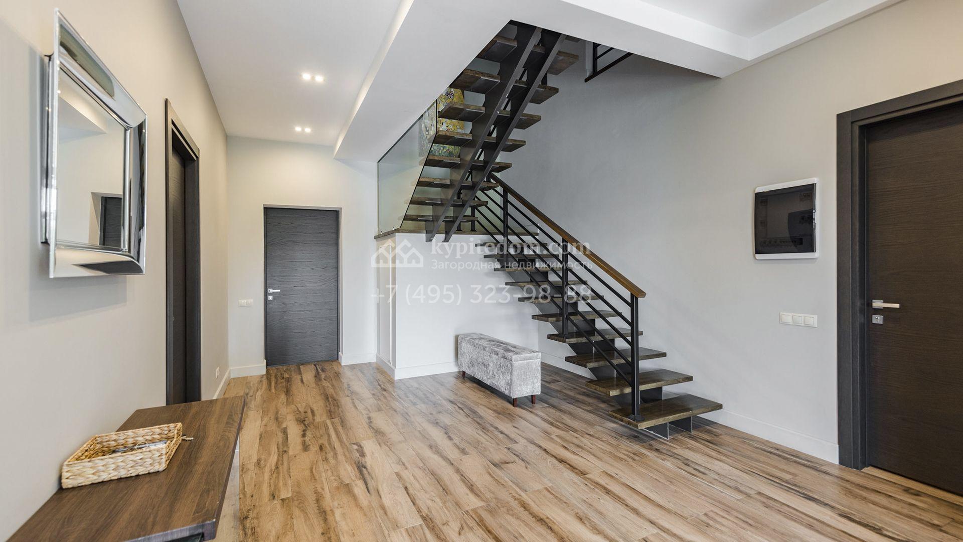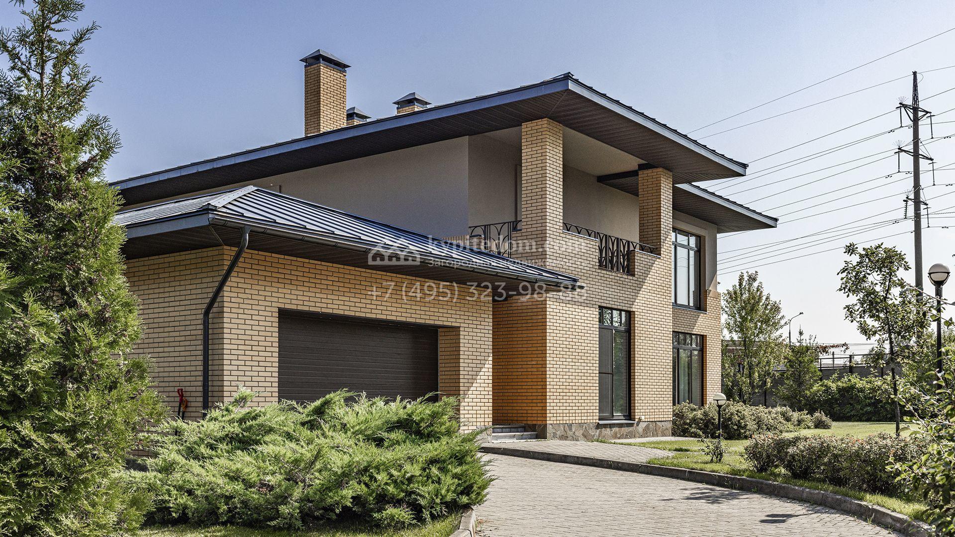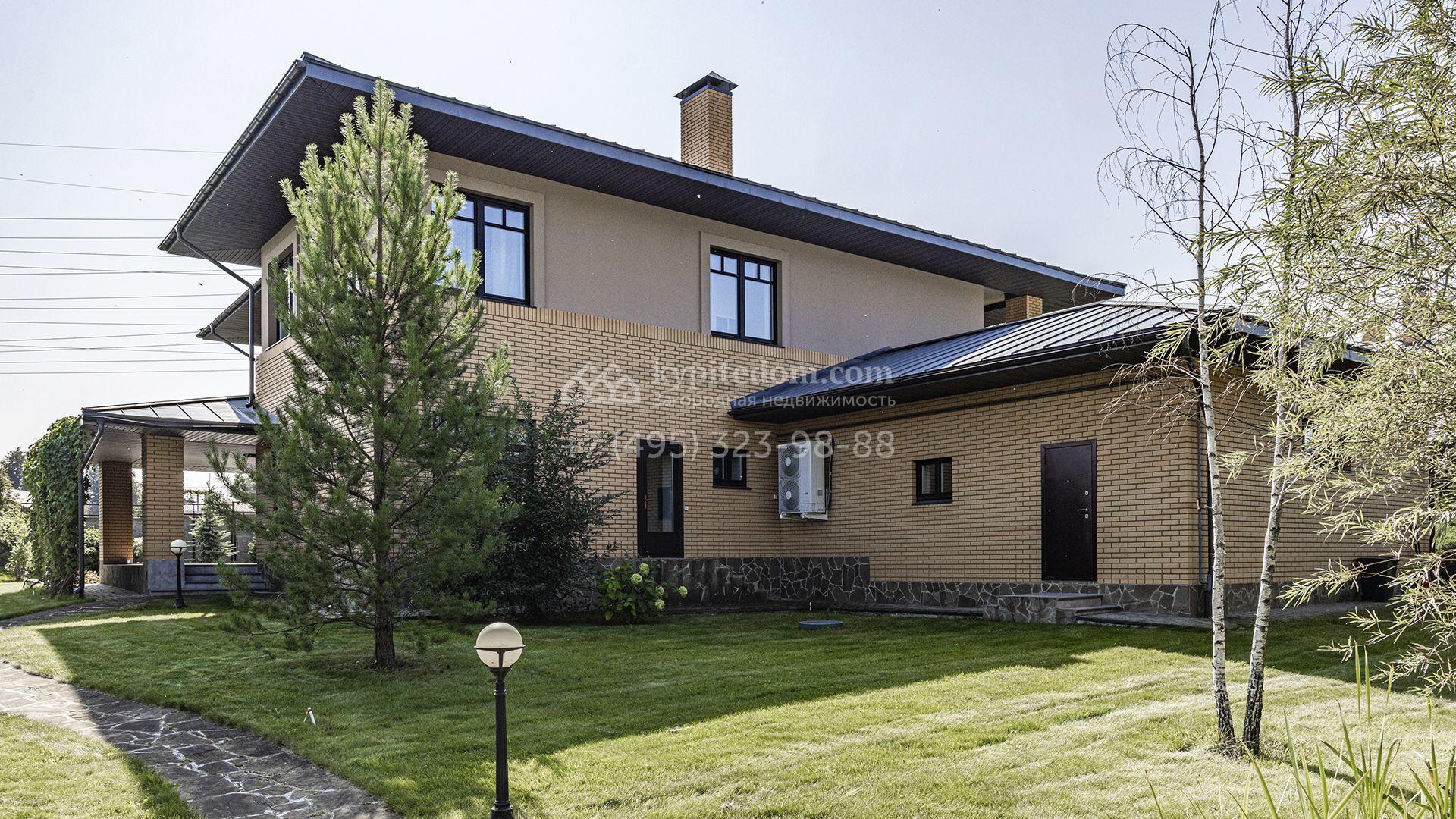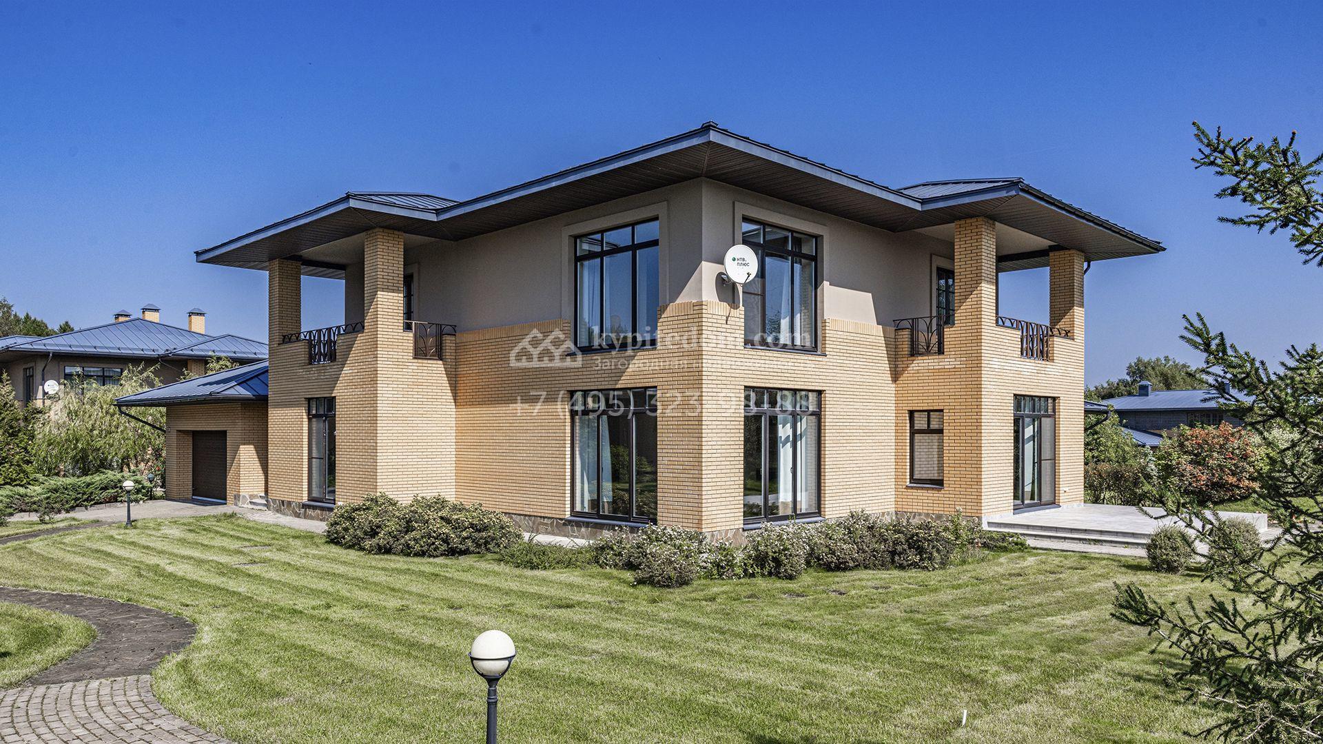 Коттедж в стиле Ллойда Райта площадью 409 м² на участке 19 соток с ландшафтным дизайном. Двухцветный серо-бежевый фасад с большими панорамными окнами дополнен навесом и балконом. Внутри выполнена отделка «под ключ» в сдержанных тонах в современном стиле — на первом этаже просторная зона гостиной-столовой-кухни с выходом на террасу, а также кабинет и помещения для персонала со спальней. На втором этаже главная спальня с приватной ванной и гардеробной, и три отдельные спальни. Гараж пристроен к дому. На участке высажен газон, растут декоративные растения.