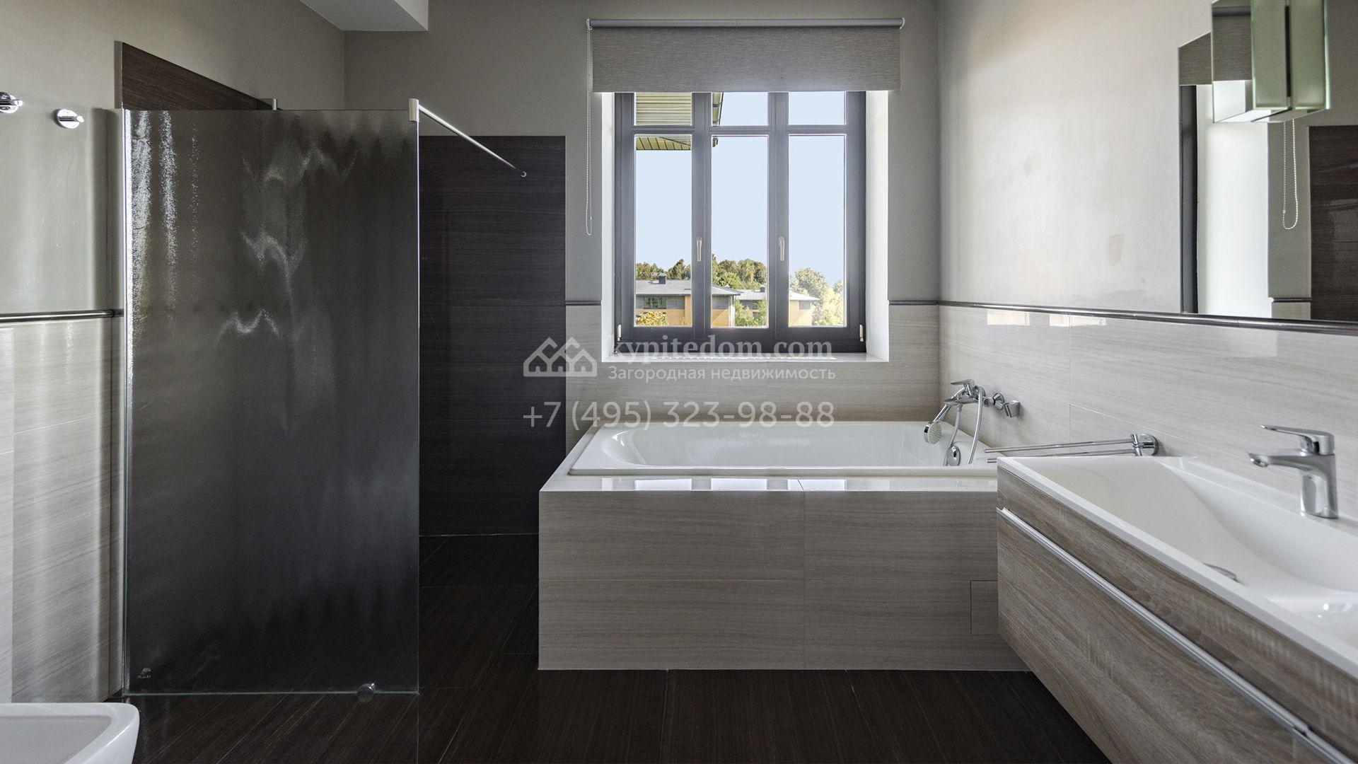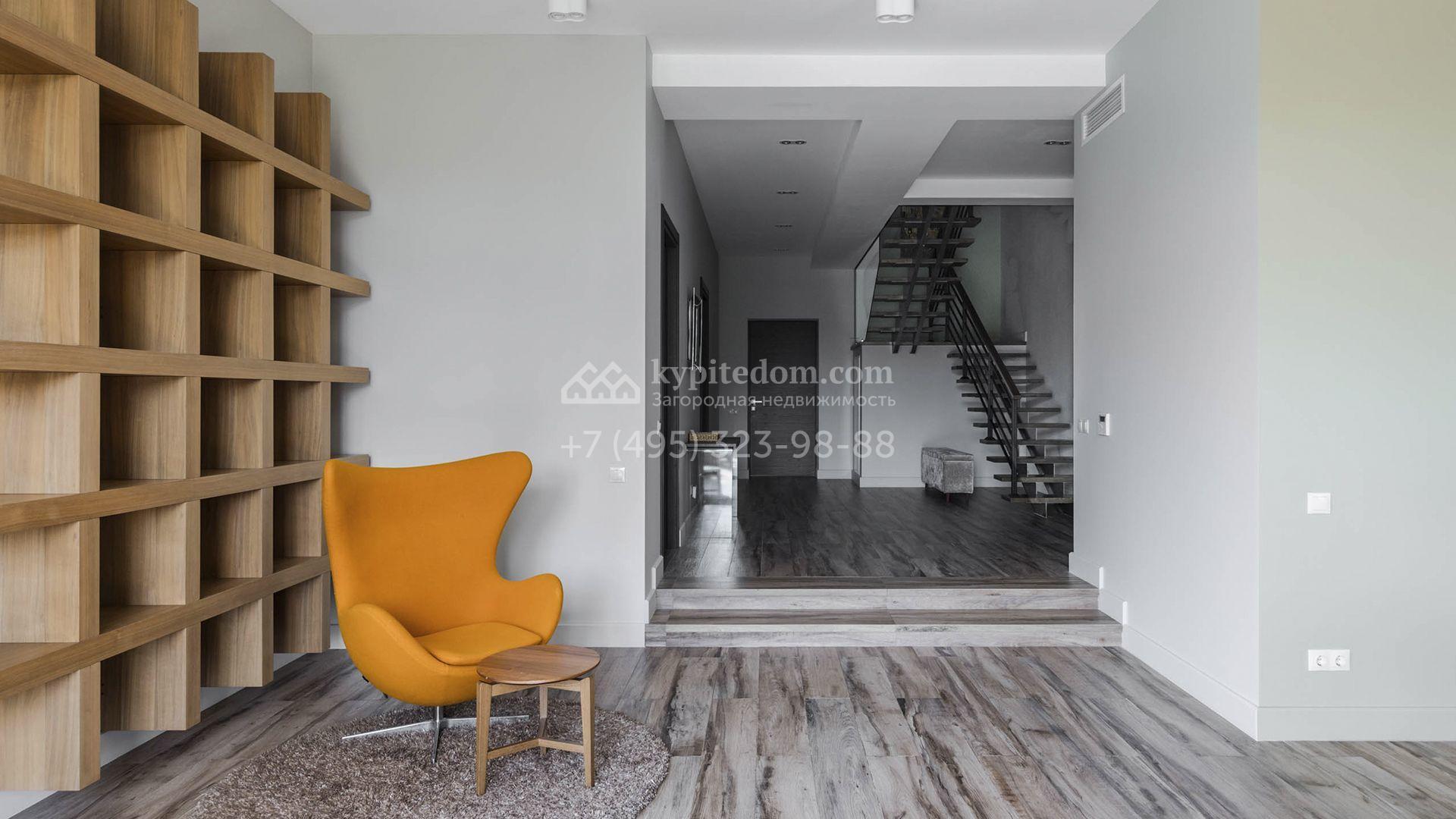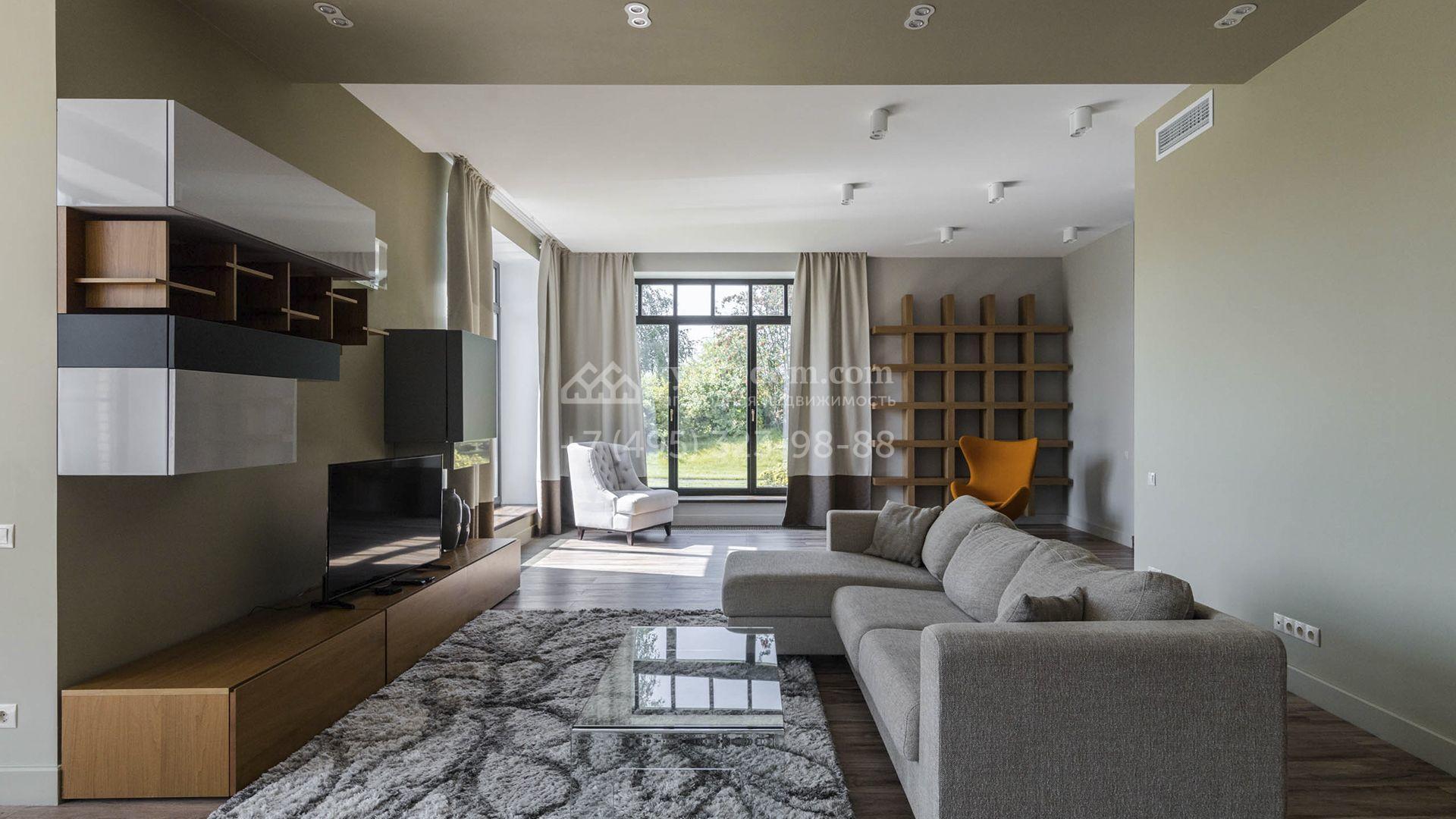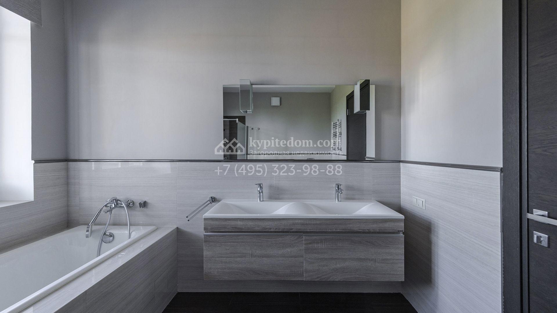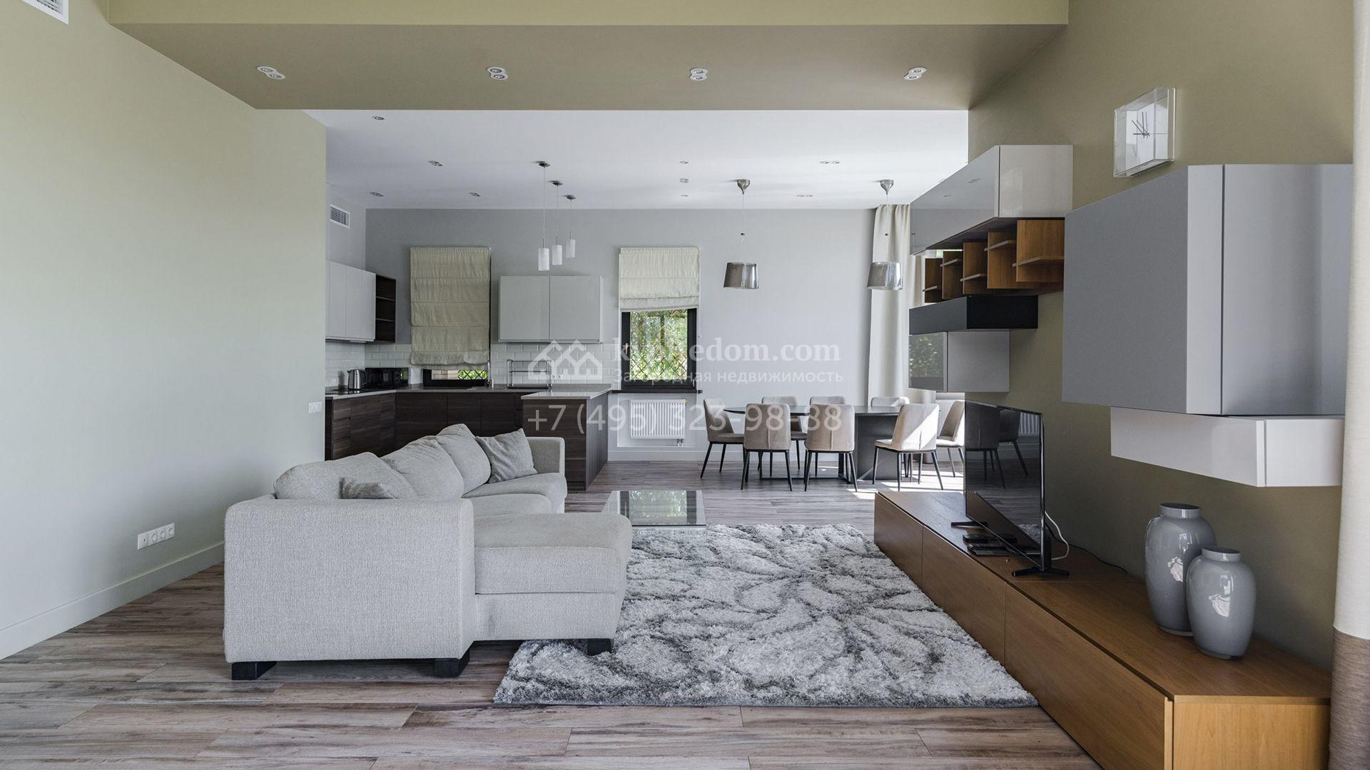 Коттедж в стиле Ллойда Райта площадью 409 м² на участке 19 соток с ландшафтным дизайном. Двухцветный серо-бежевый фасад с большими панорамными окнами дополнен навесом и балконом. Внутри выполнена отделка «под ключ» в сдержанных тонах в современном стиле — на первом этаже просторная зона гостиной-столовой-кухни с выходом на террасу, а также кабинет и помещения для персонала со спальней. На втором этаже главная спальня с приватной ванной и гардеробной, и три отдельные спальни. Гараж пристроен к дому. На участке высажен газон, растут декоративные растения.