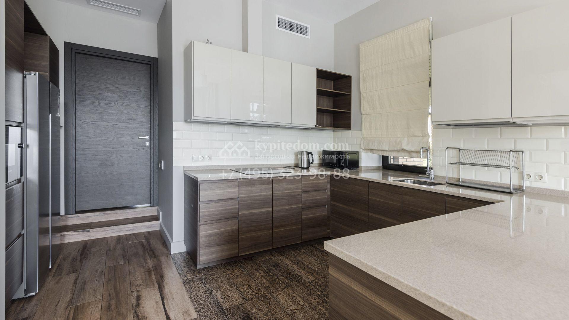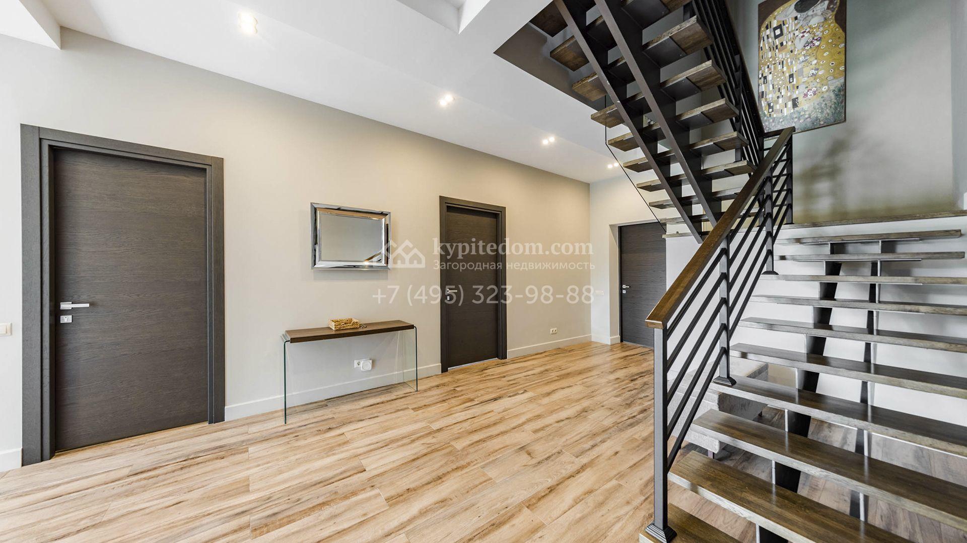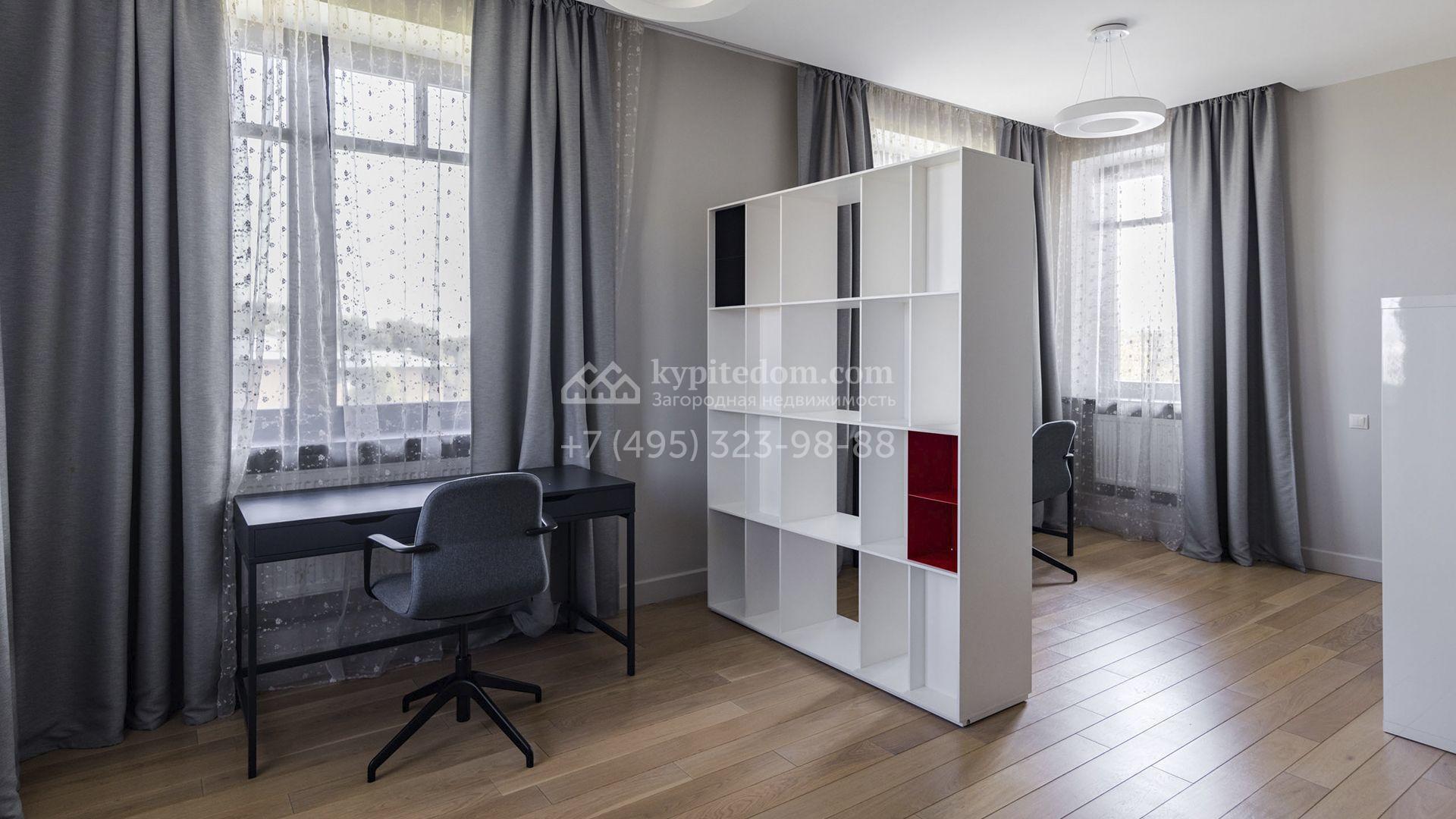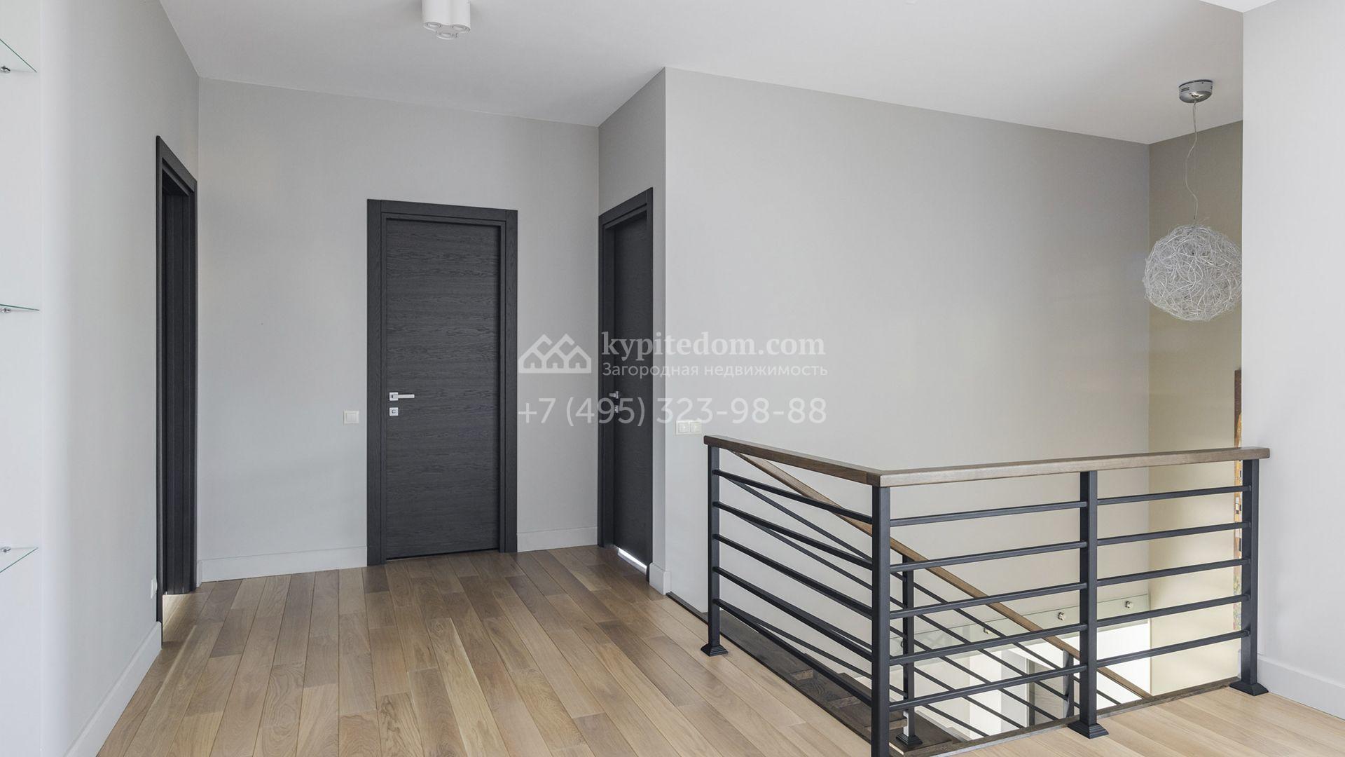 Коттедж в стиле Ллойда Райта площадью 409 м² на участке 19 соток с ландшафтным дизайном. Двухцветный серо-бежевый фасад с большими панорамными окнами дополнен навесом и балконом. Внутри выполнена отделка «под ключ» в сдержанных тонах в современном стиле — на первом этаже просторная зона гостиной-столовой-кухни с выходом на террасу, а также кабинет и помещения для персонала со спальней. На втором этаже главная спальня с приватной ванной и гардеробной, и три отдельные спальни. Гараж пристроен к дому. На участке высажен газон, растут декоративные растения.