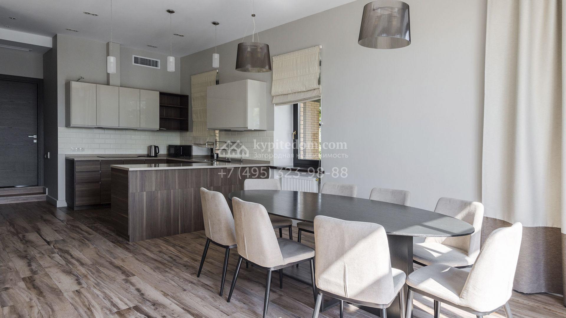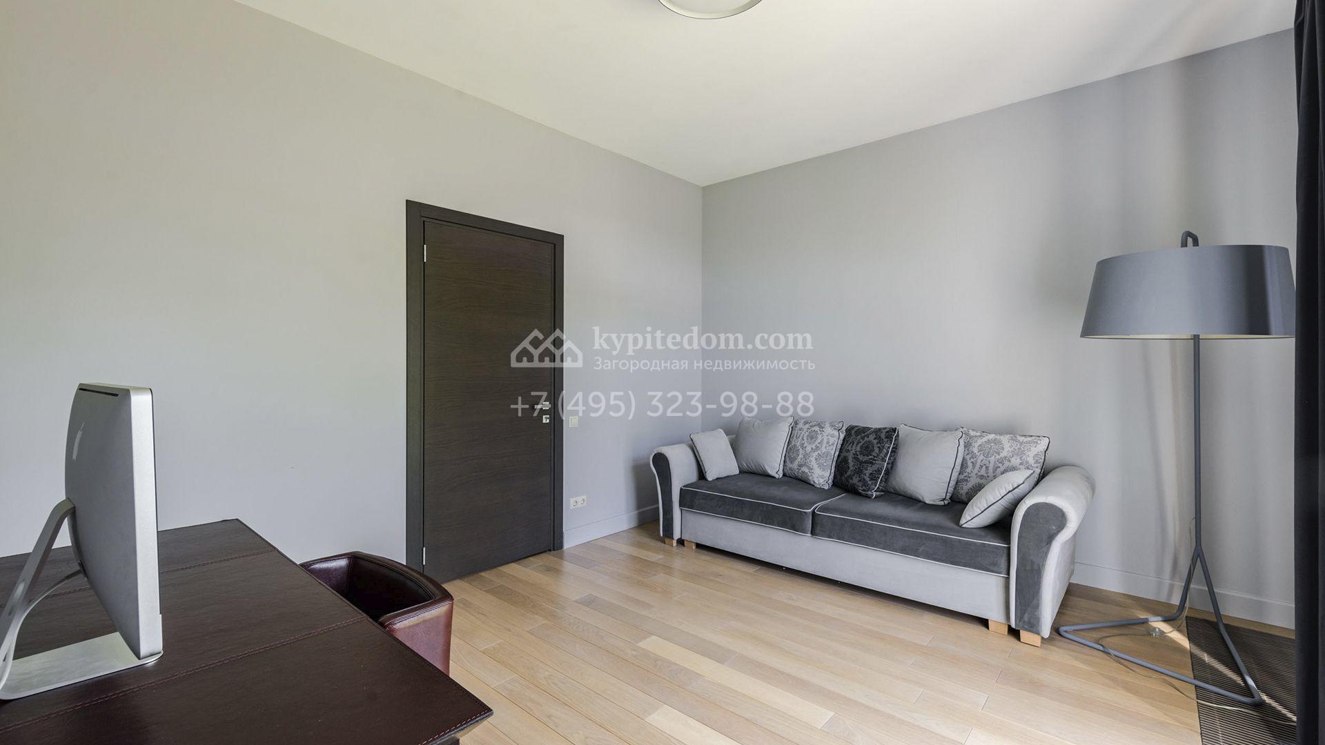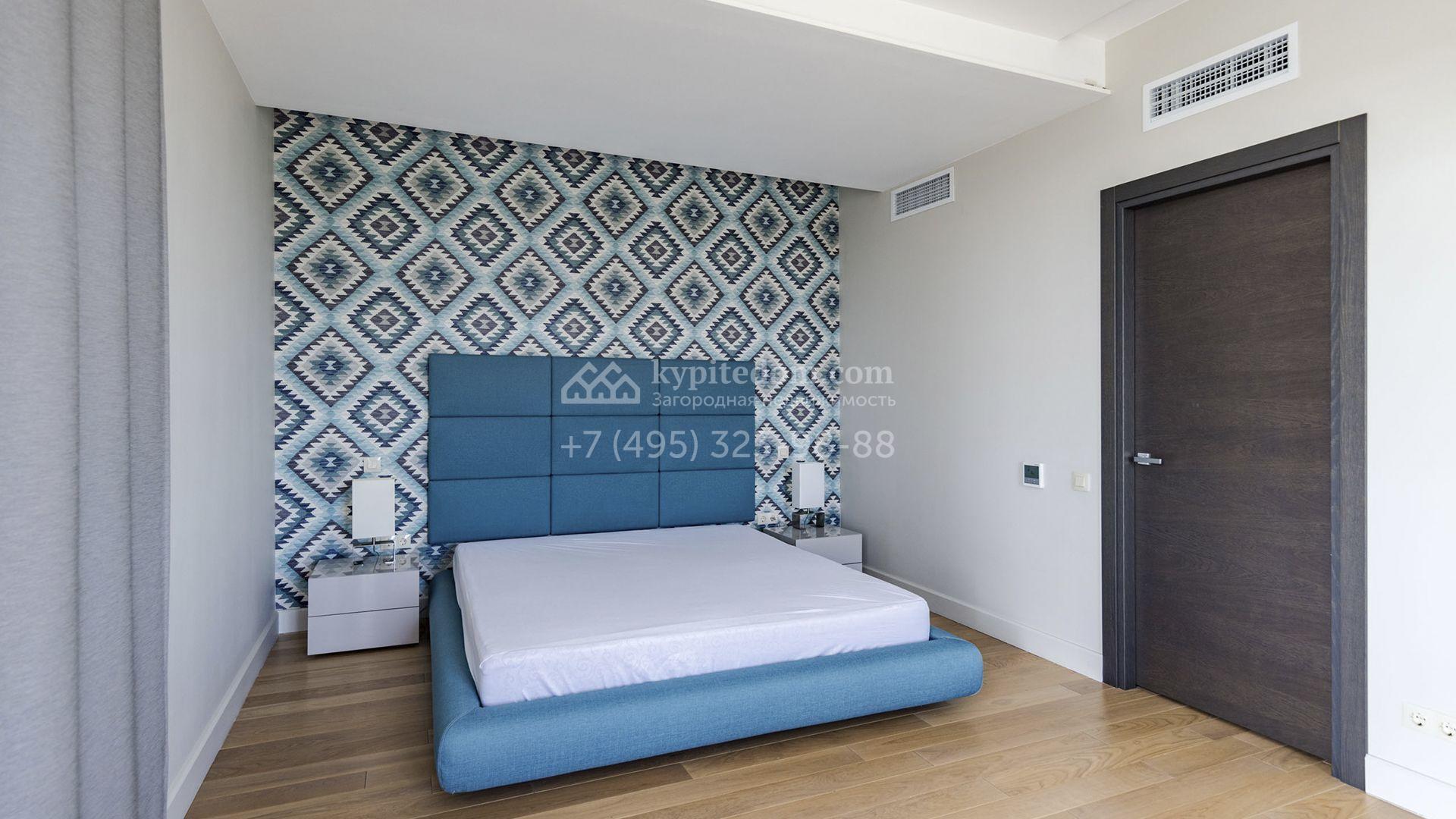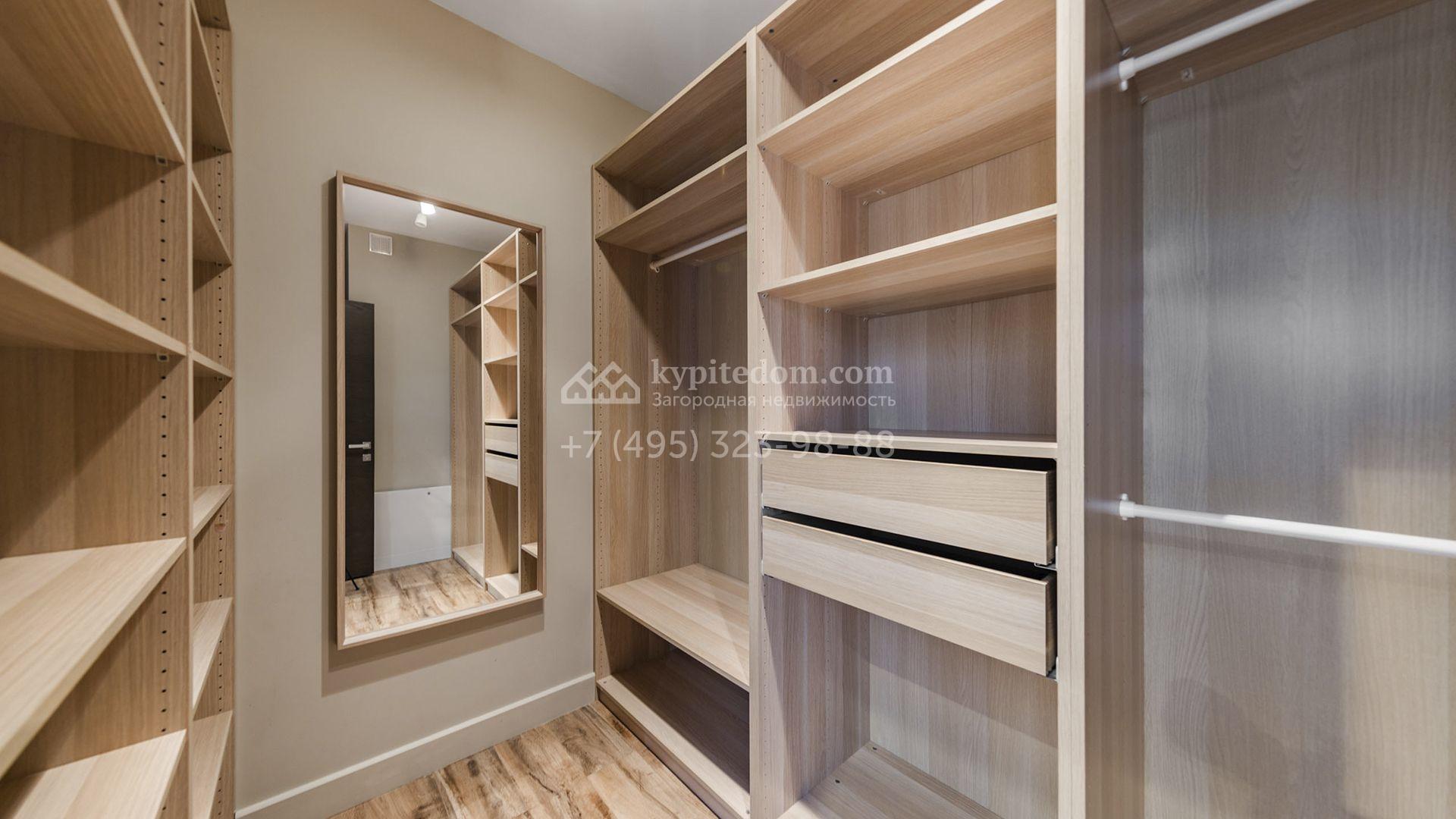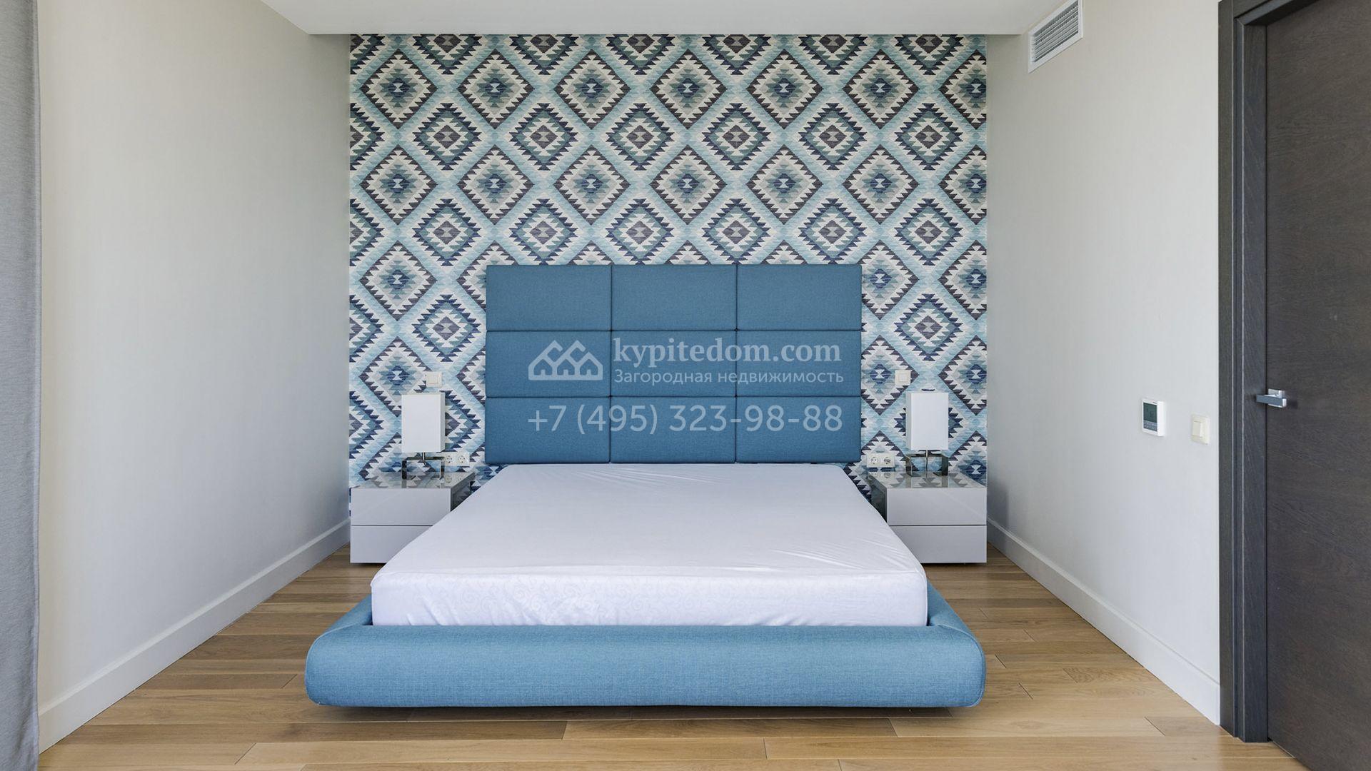 Коттедж в стиле Ллойда Райта площадью 409 м² на участке 19 соток с ландшафтным дизайном. Двухцветный серо-бежевый фасад с большими панорамными окнами дополнен навесом и балконом. Внутри выполнена отделка «под ключ» в сдержанных тонах в современном стиле — на первом этаже просторная зона гостиной-столовой-кухни с выходом на террасу, а также кабинет и помещения для персонала со спальней. На втором этаже главная спальня с приватной ванной и гардеробной, и три отдельные спальни. Гараж пристроен к дому. На участке высажен газон, растут декоративные растения.