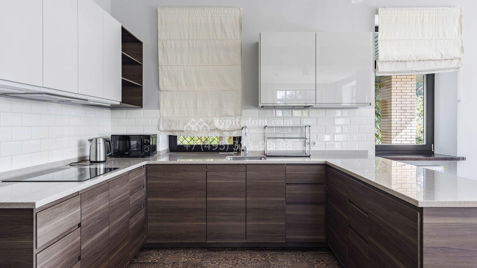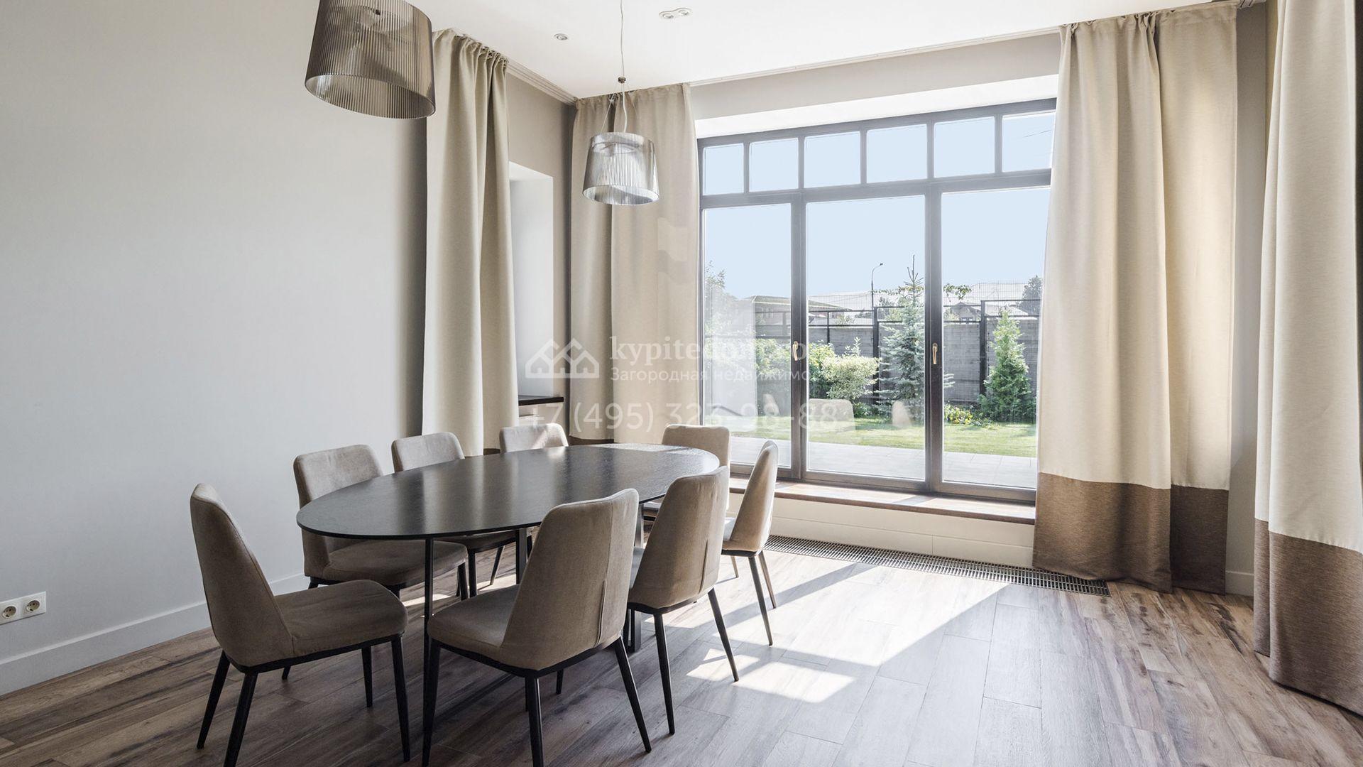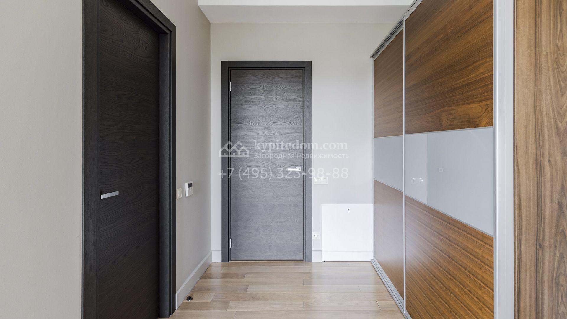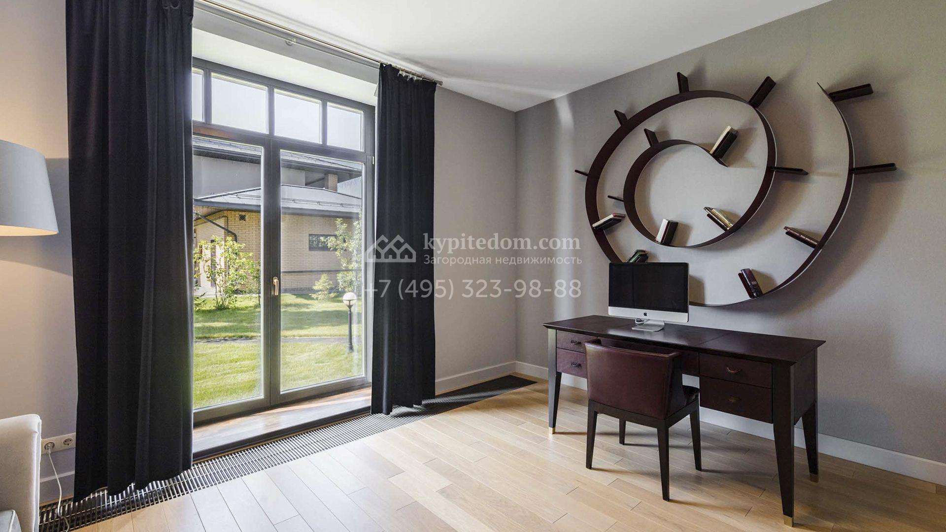 Коттедж в стиле Ллойда Райта площадью 409 м² на участке 19 соток с ландшафтным дизайном. Двухцветный серо-бежевый фасад с большими панорамными окнами дополнен навесом и балконом. Внутри выполнена отделка «под ключ» в сдержанных тонах в современном стиле — на первом этаже просторная зона гостиной-столовой-кухни с выходом на террасу, а также кабинет и помещения для персонала со спальней. На втором этаже главная спальня с приватной ванной и гардеробной, и три отдельные спальни. Гараж пристроен к дому. На участке высажен газон, растут декоративные растения.