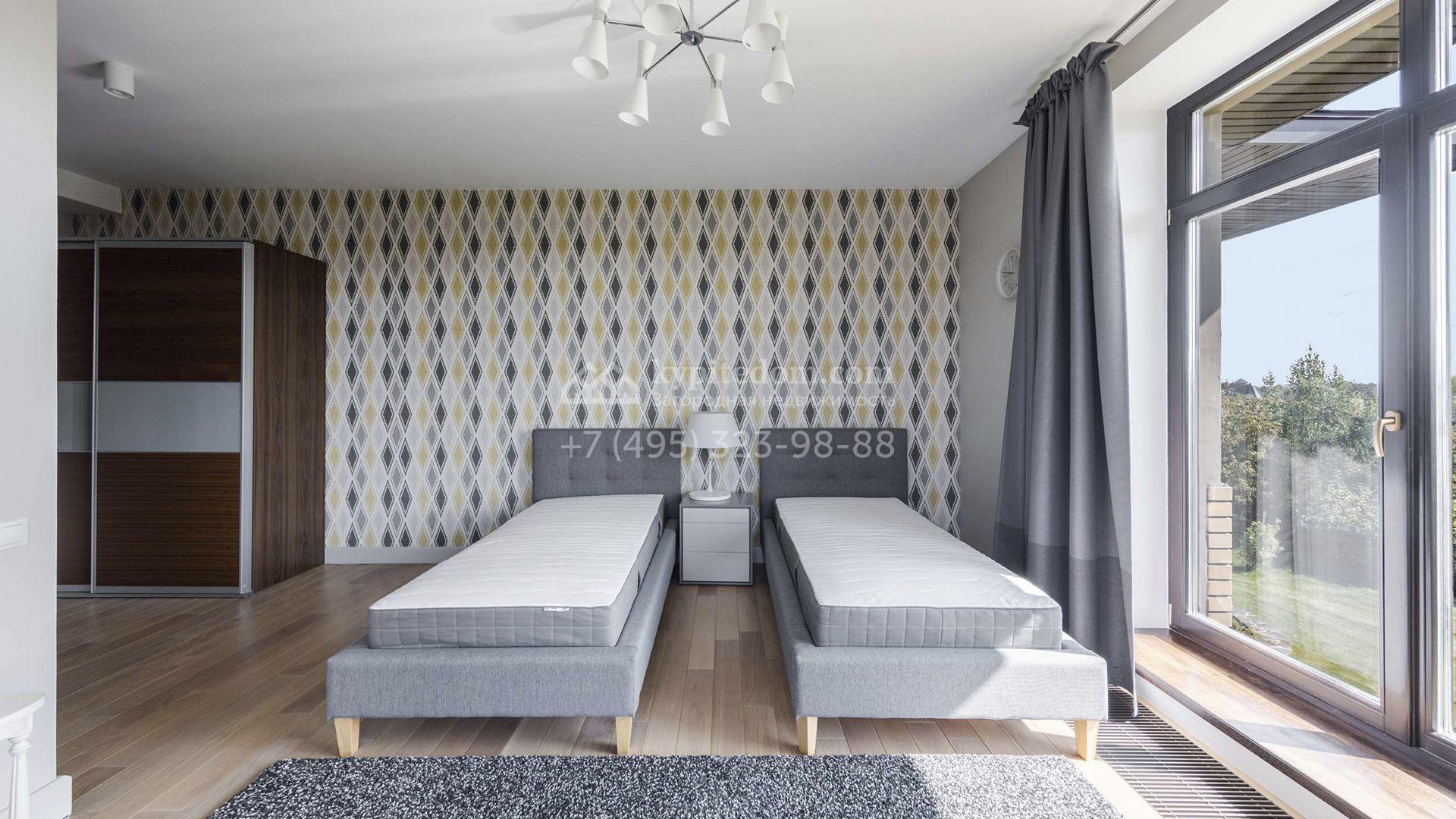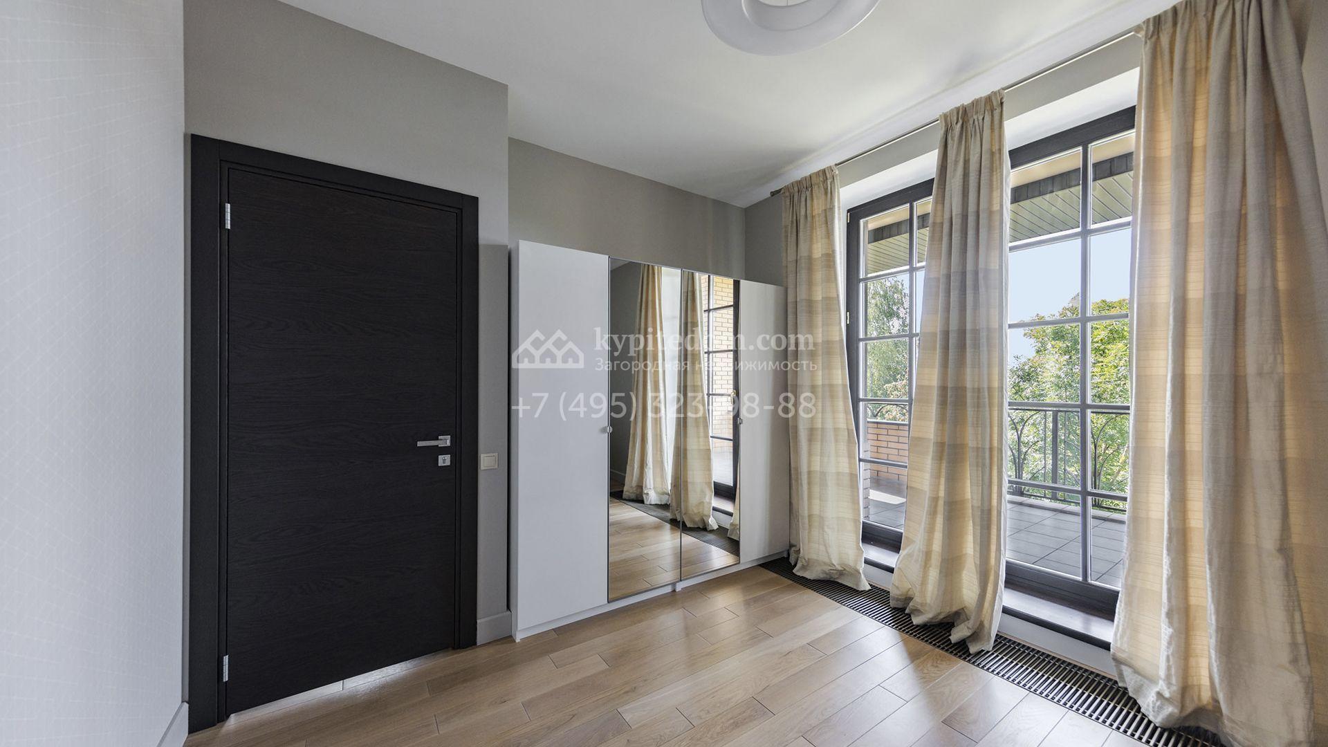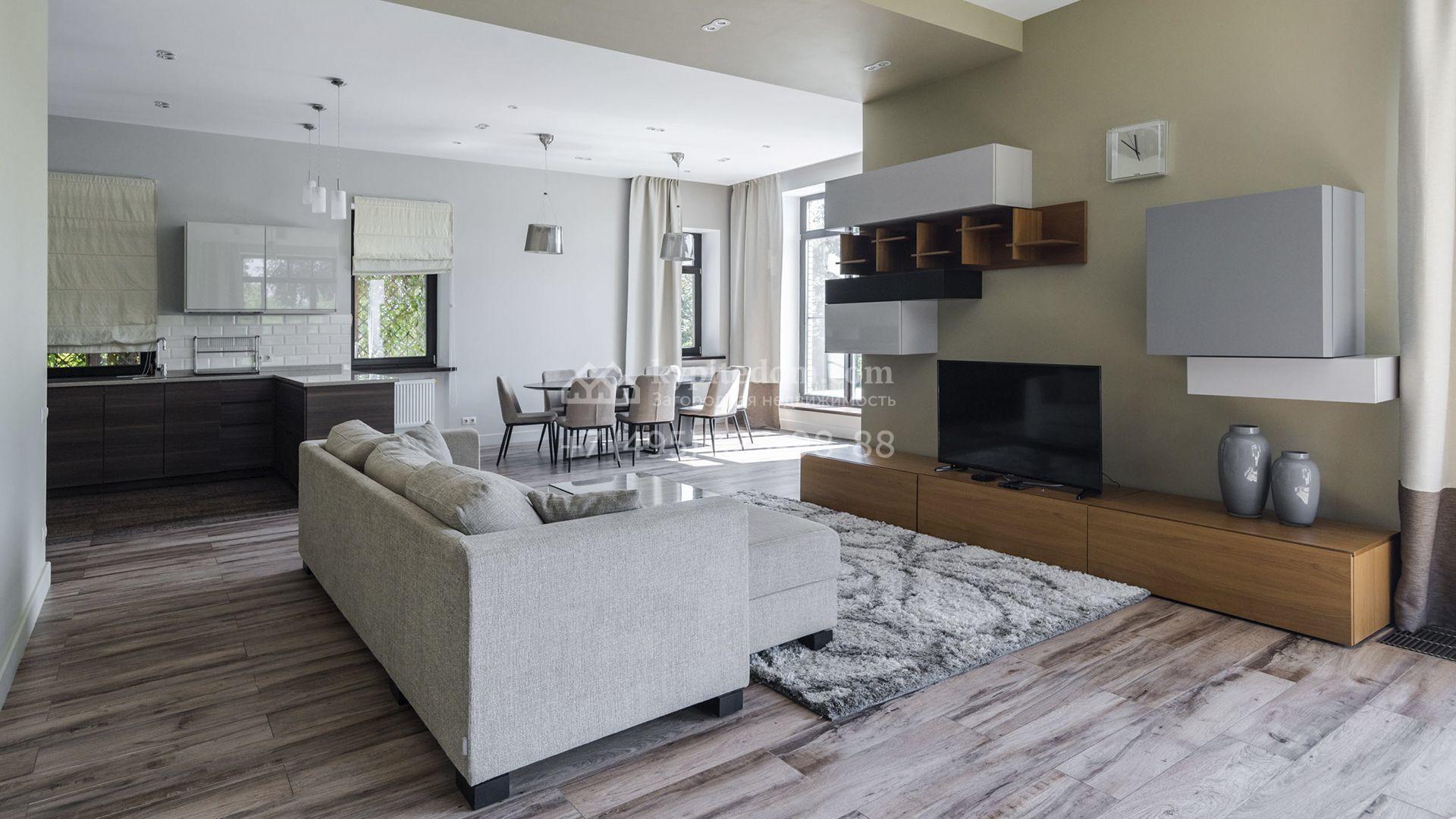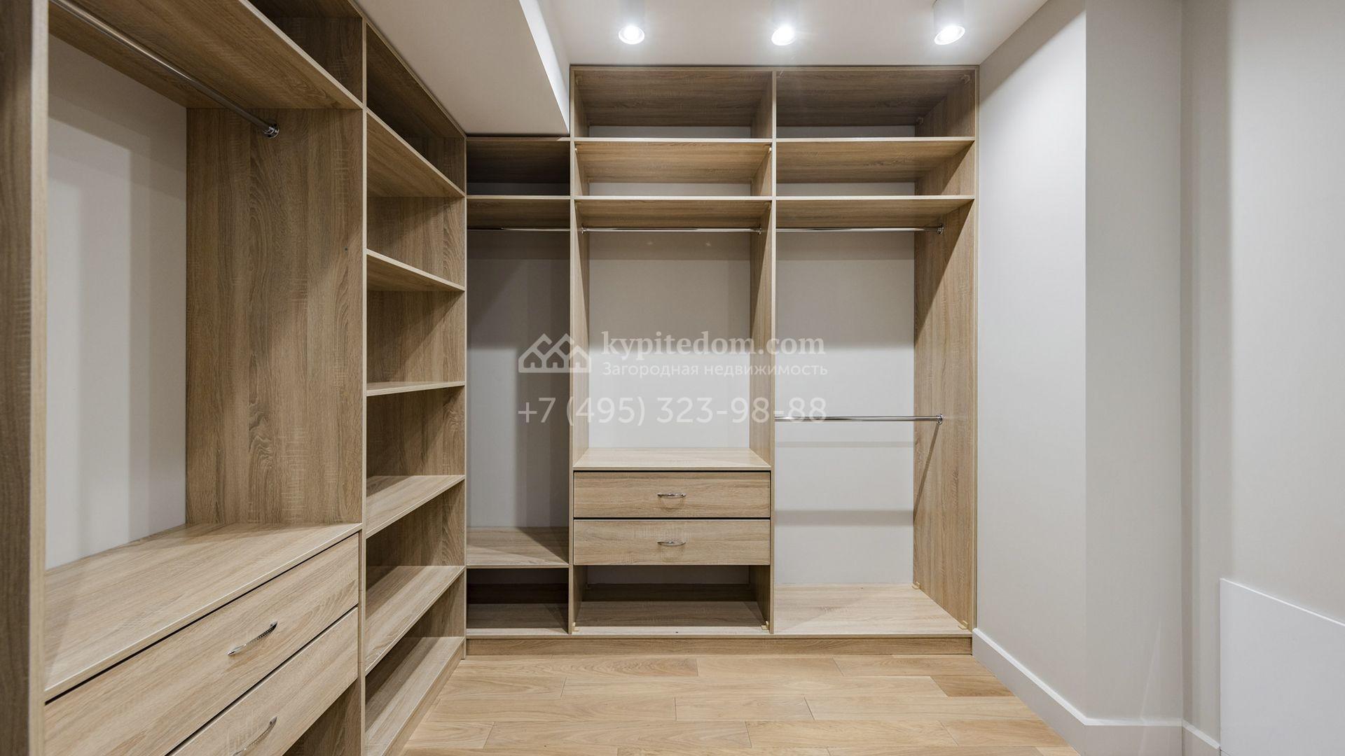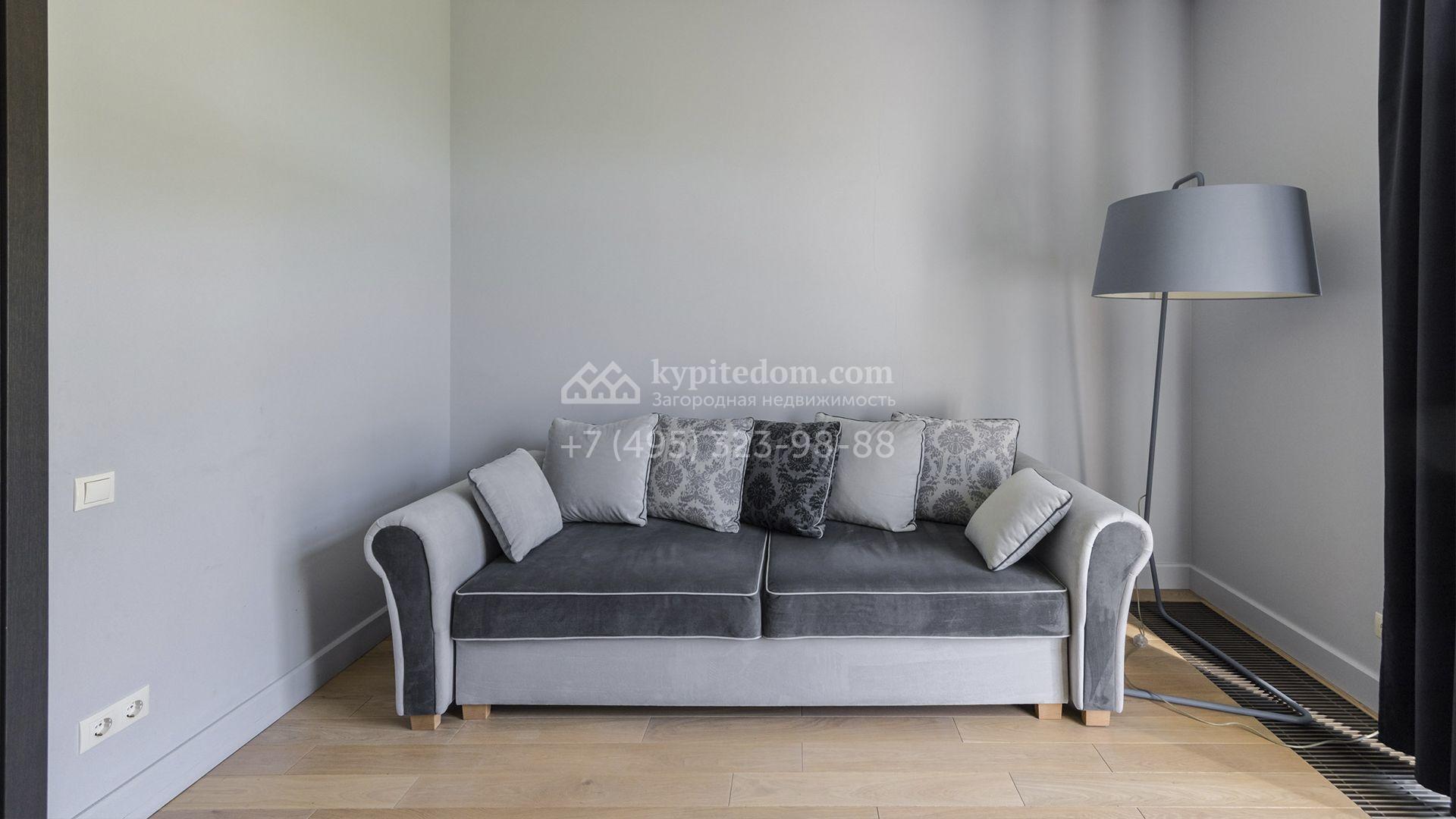 Коттедж в стиле Ллойда Райта площадью 409 м² на участке 19 соток с ландшафтным дизайном. Двухцветный серо-бежевый фасад с большими панорамными окнами дополнен навесом и балконом. Внутри выполнена отделка «под ключ» в сдержанных тонах в современном стиле — на первом этаже просторная зона гостиной-столовой-кухни с выходом на террасу, а также кабинет и помещения для персонала со спальней. На втором этаже главная спальня с приватной ванной и гардеробной, и три отдельные спальни. Гараж пристроен к дому. На участке высажен газон, растут декоративные растения.
