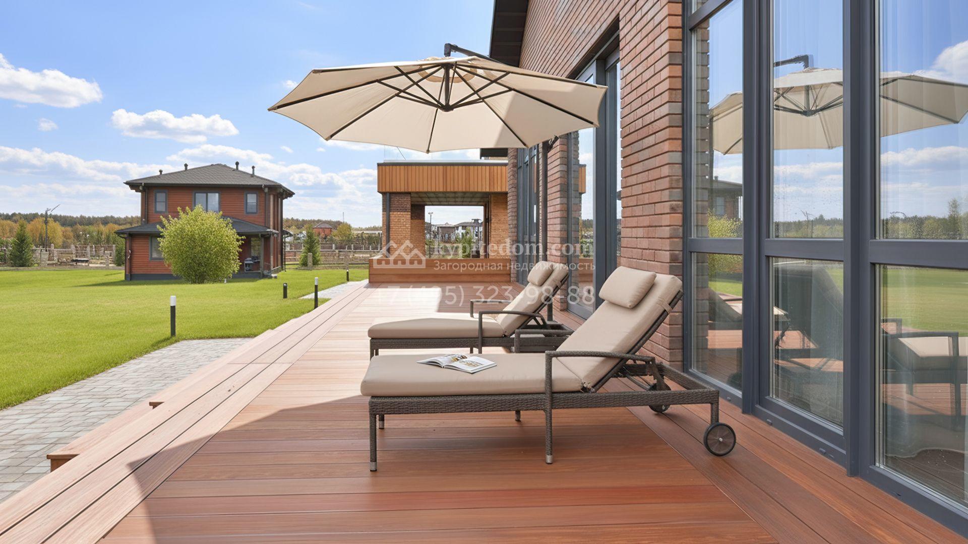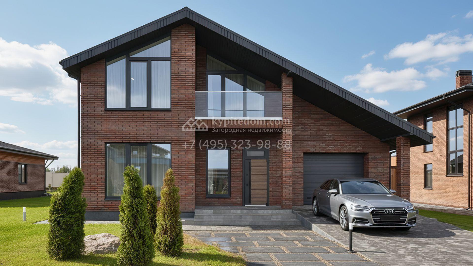 Двухуровневый коттедж площадью 226 м² построен на участке 10 соток по эксклюзивному проекту «Тростен». Архитектура отличается выразительной геометрией: асимметричная крыша, глубокие свесы и большие окна, за счёт которых фасад из кирпича в тёплой терракотовой гамме выглядит динамично и современно.