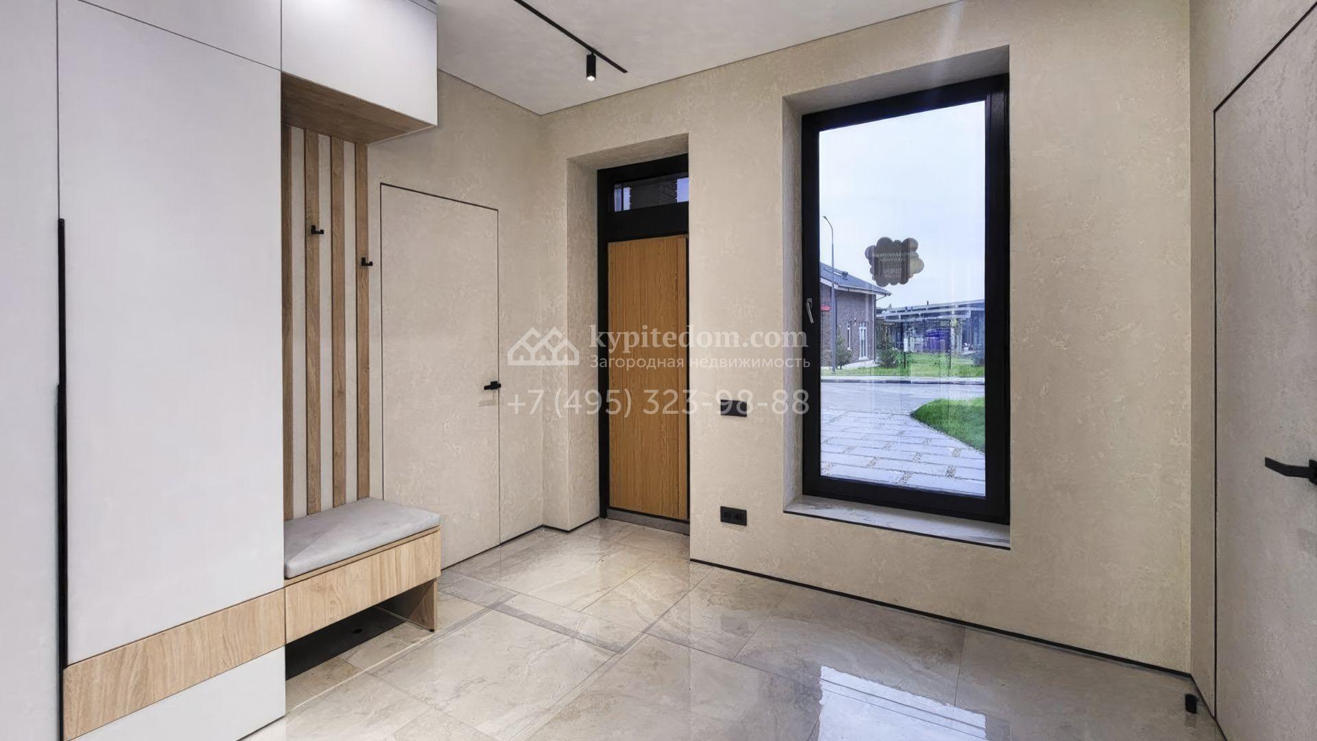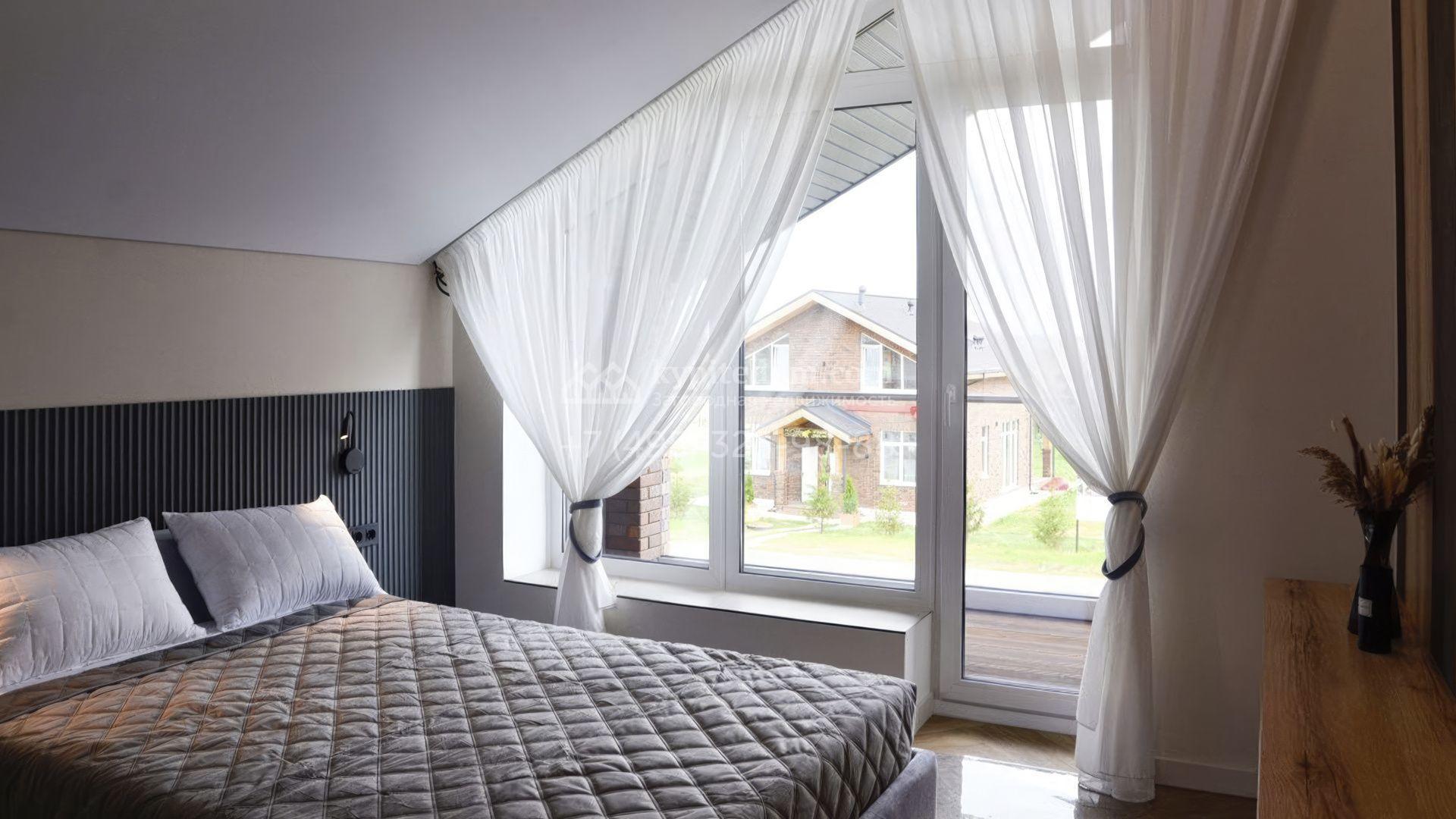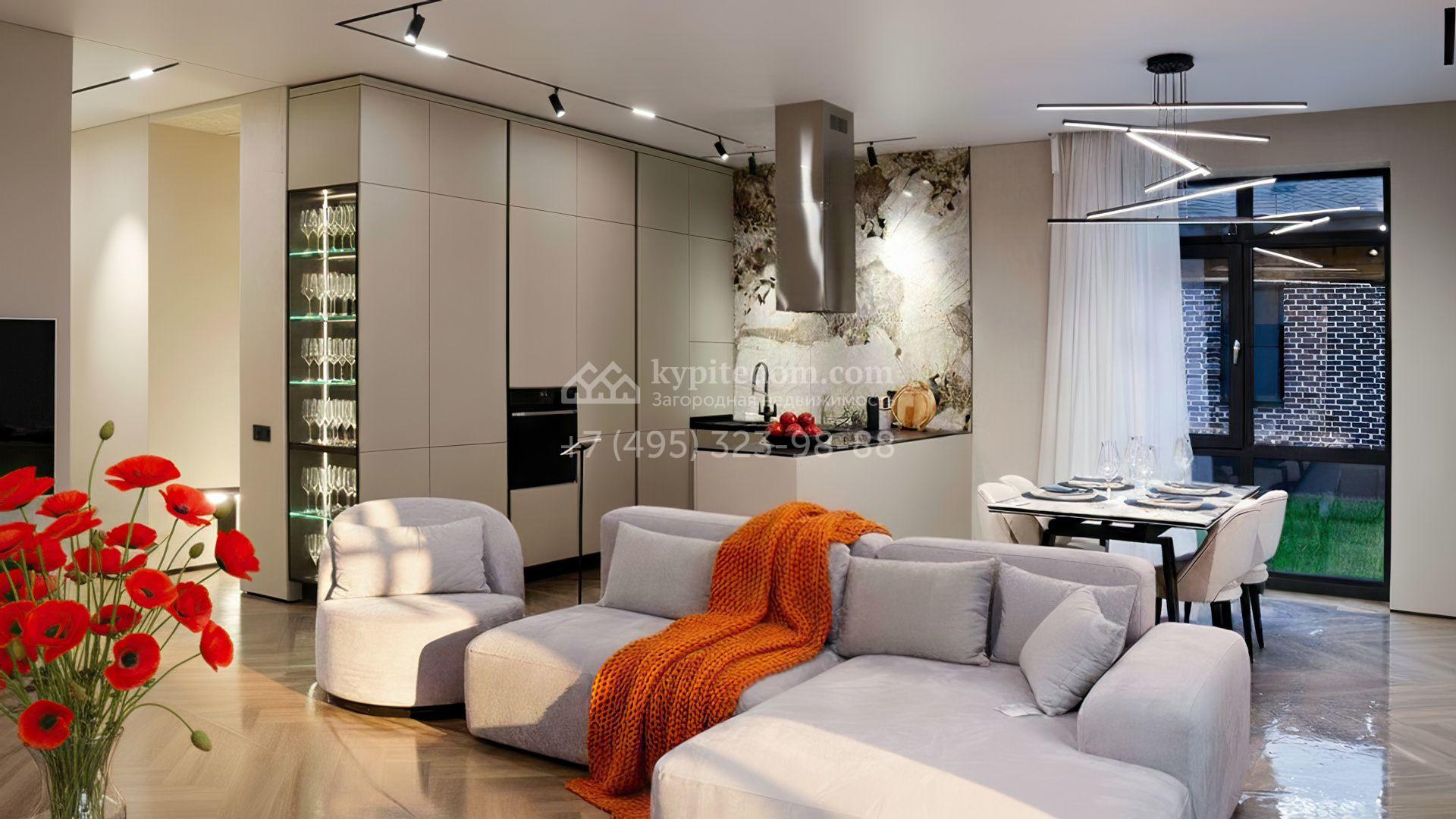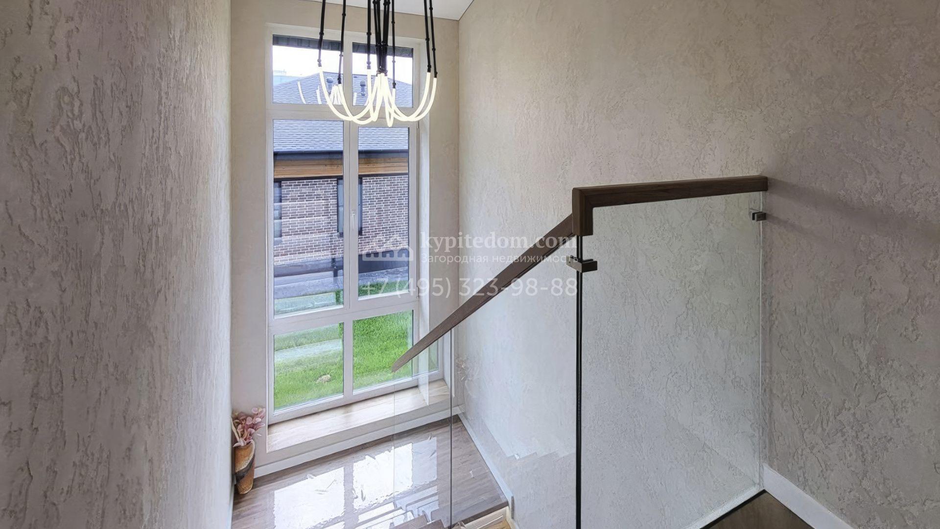 Планировка продумана для жизни большой семьи: на первом уровне находятся просторная кухня-гостиная с игровой зоной и выходом на террасу, кабинет, сауна и гараж. На втором уровне расположены приватные комнаты — 2 мастер-спальни с собственными гардеробными и ванными, а также ещё 2 спальни с индивидуальными санузлами. Участок облагорожен: уложен газон, высажены декоративные кустарники, проложены дорожки и организована подсветка.