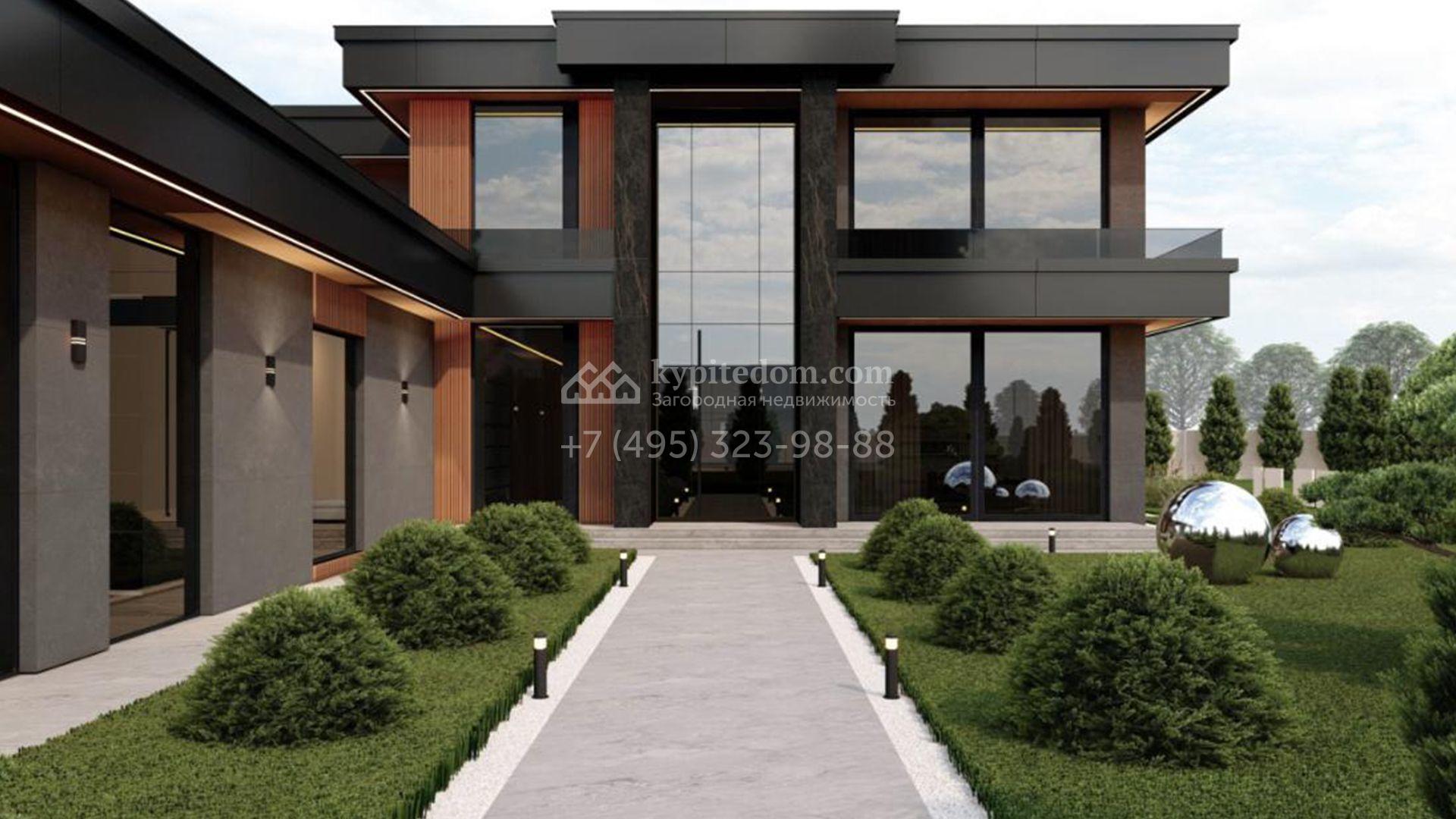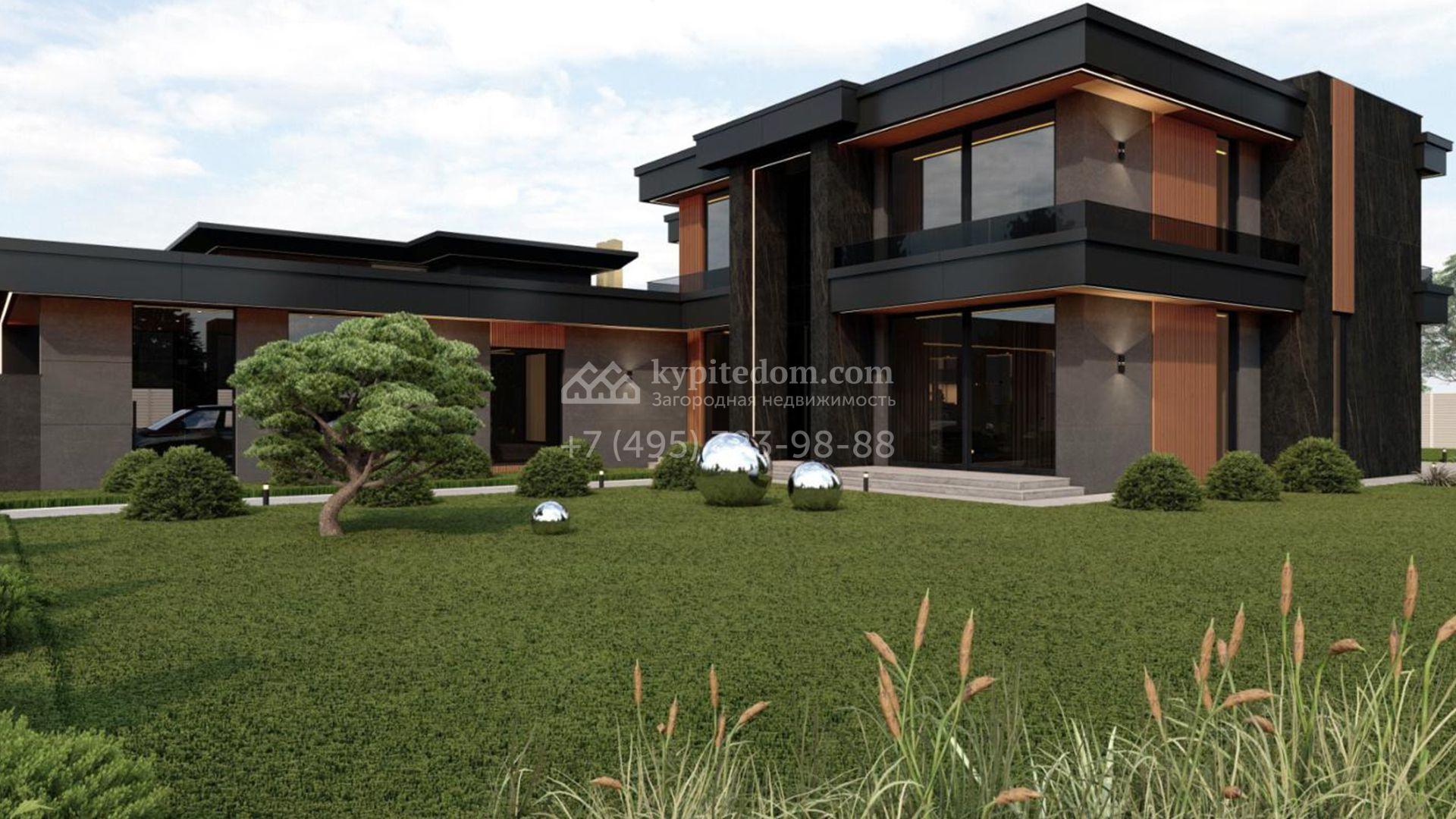 Загородный дом в стиле райт площадью 555 м² расположен на участке 20 соток в центральной части посёлка. Фасад выполнен из итальянской плитки графитового оттенка с текстурой камня, которую смягчает деревянный планкен насыщенного цвета. Контраст материалов формирует выразительный, но тёплый облик, сочетающий строгость линий и природную фактуру.