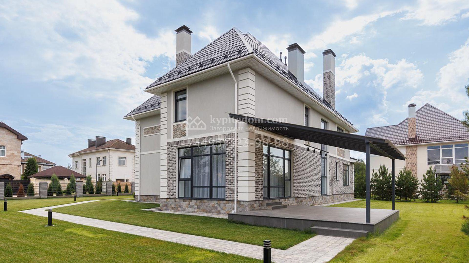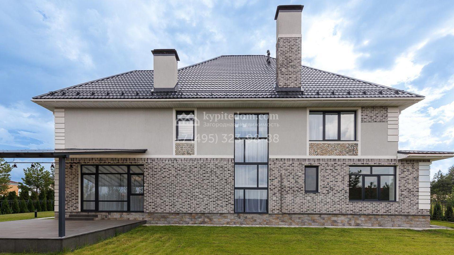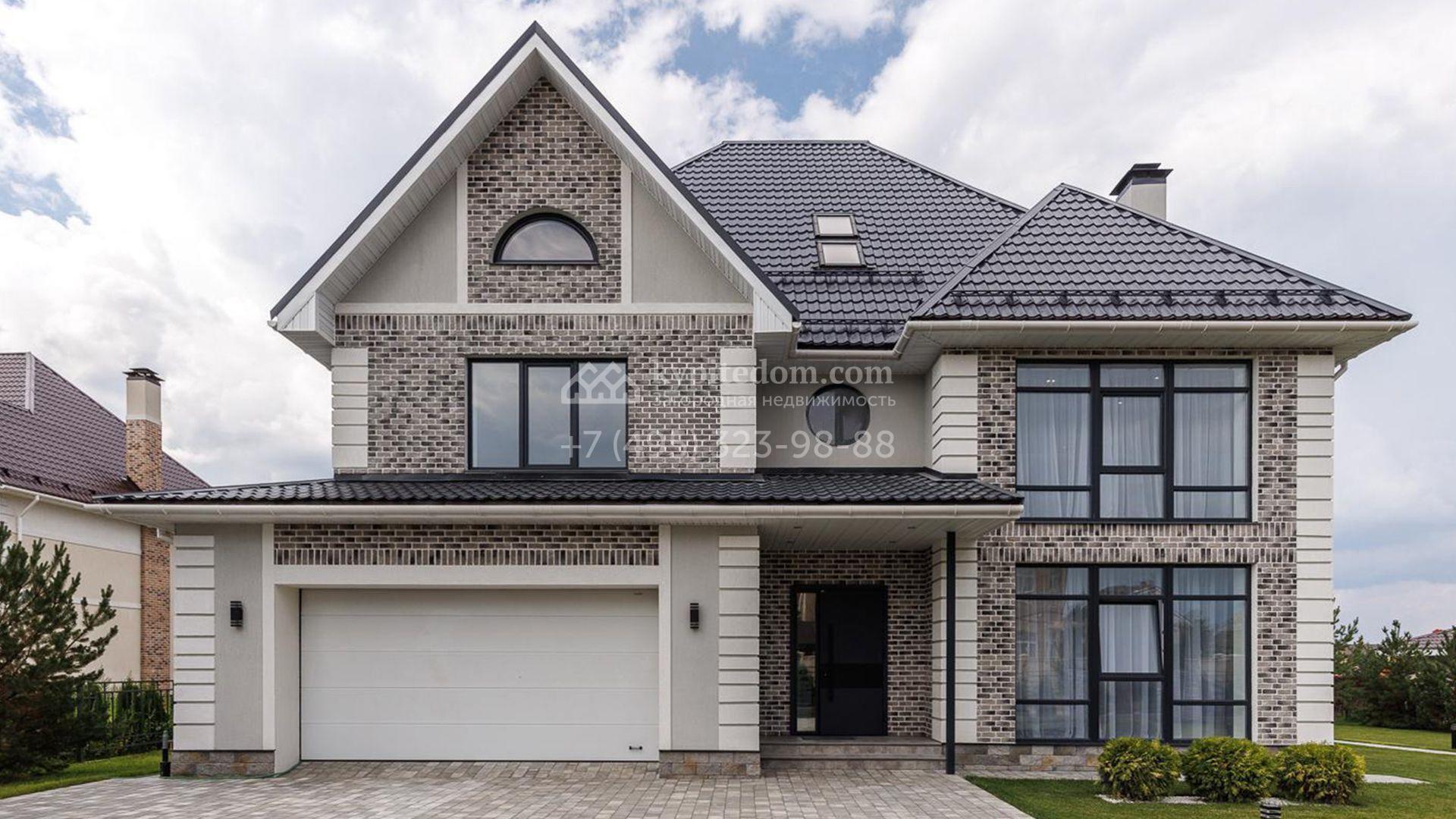 Трехэтажный коттедж площадью 425 м² расположен на полевом участке 13 соток. Здание представлено с чертами европейской архитектуры и отделано клинкерным кирпичом и штукатуркой в серых оттенках. Его фасад отличается выразительными линиями, созданными рустами, декоративными полосами и элементами, сопровождающими панорамные окна.