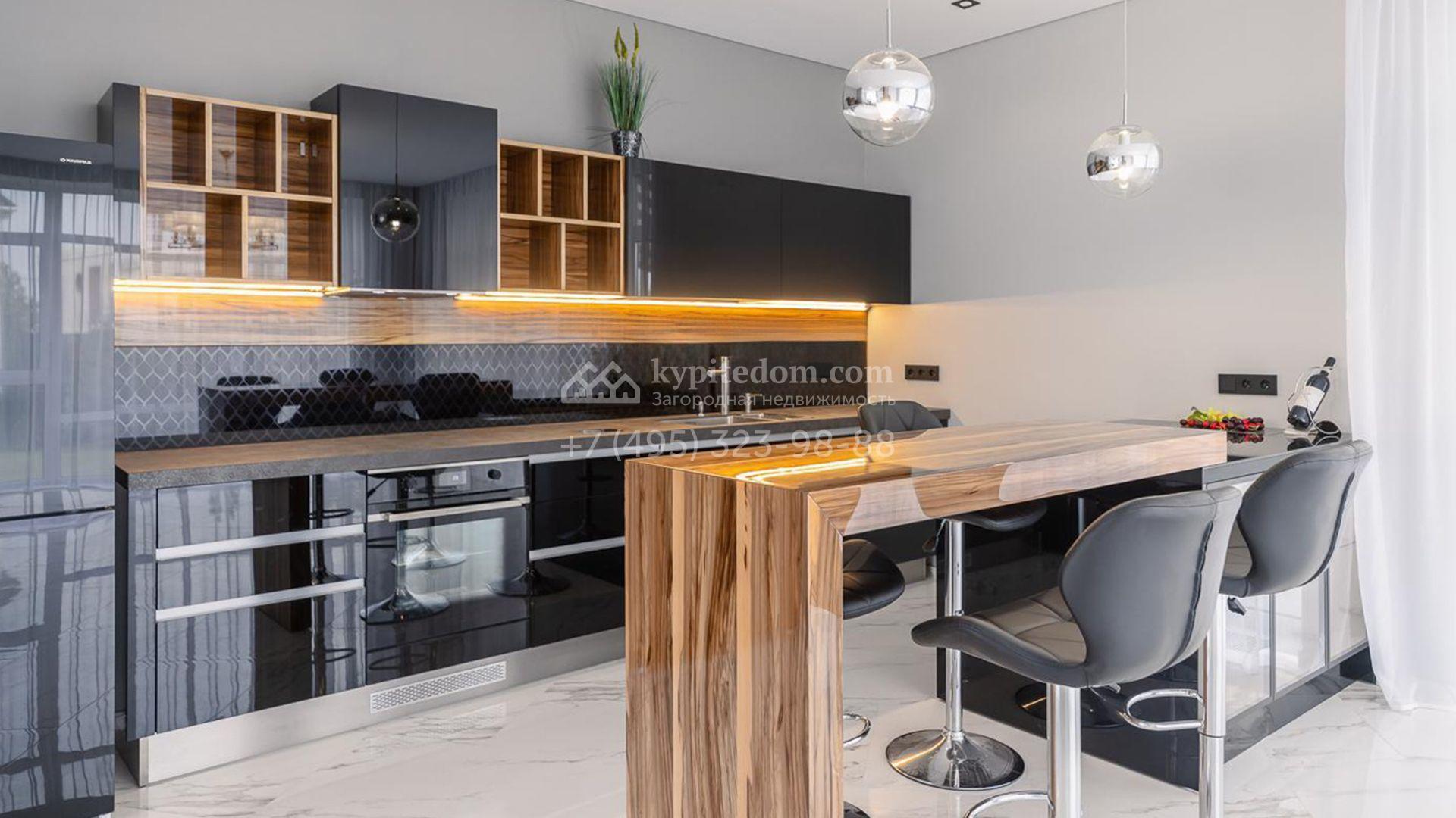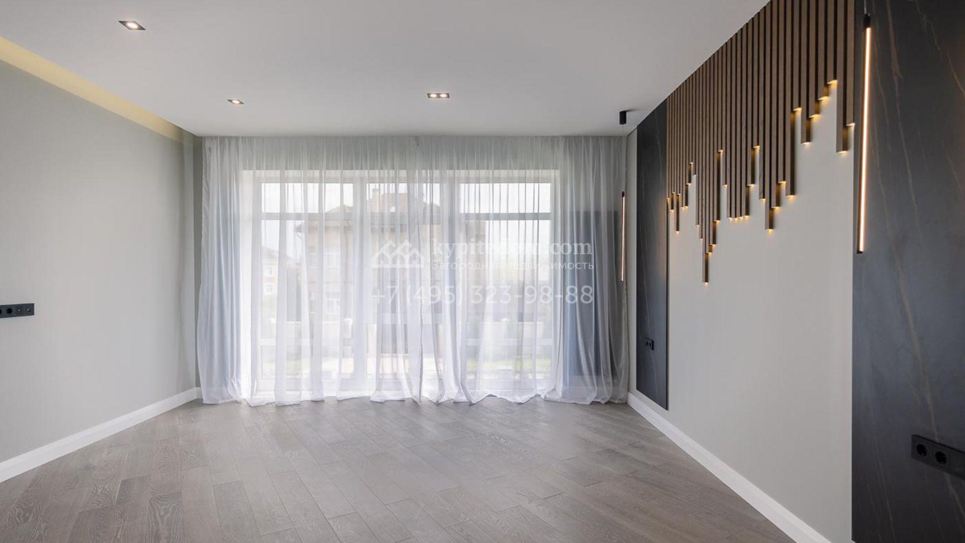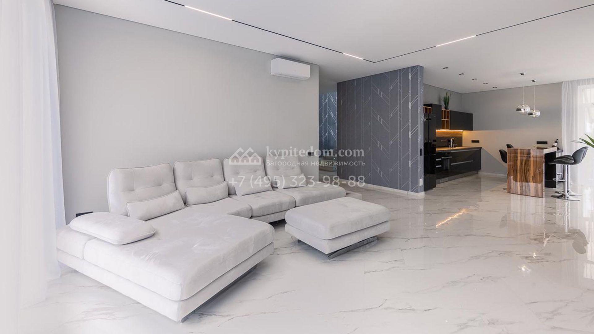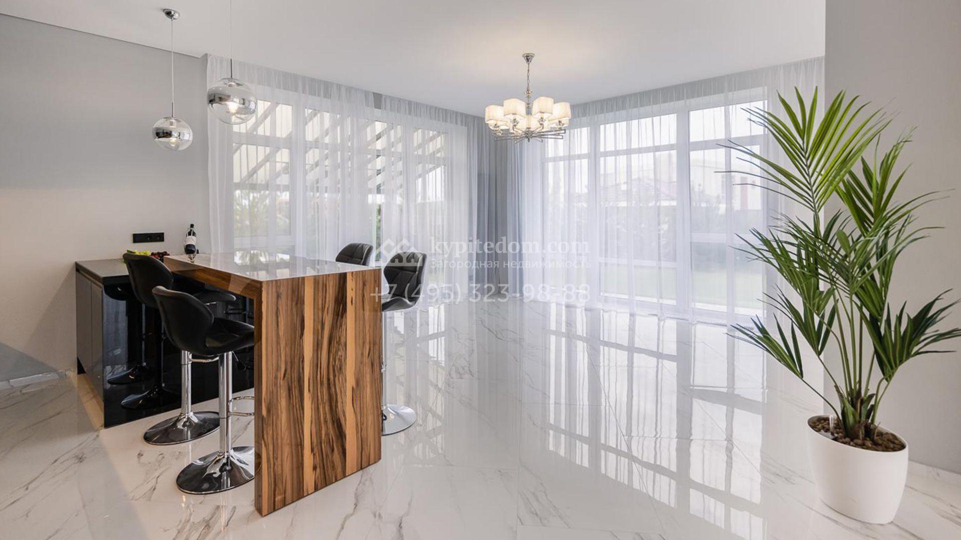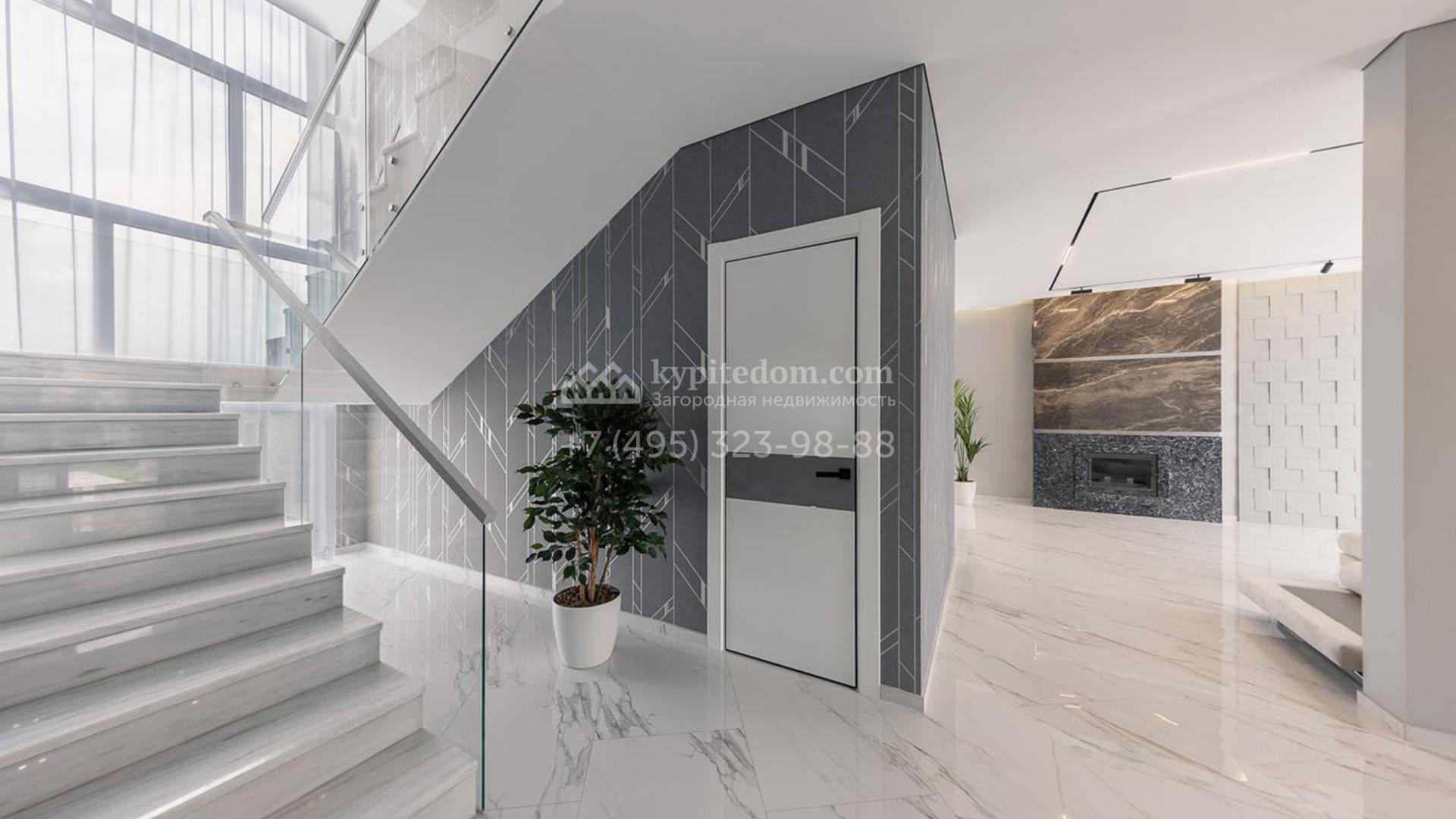 Дизайн интерьеров оформлен в стиле современной классики с использованием высококачественных материалов. На полу выложены паркетная доска, мрамор и керамическая плитка. Для создания уютной атмосферы продуманы различные варианты освещения, включая потолочные, лестничные и пороговые подсветки. Дом частично укомплектован мебелью на заказ от ведущих европейских производителей.