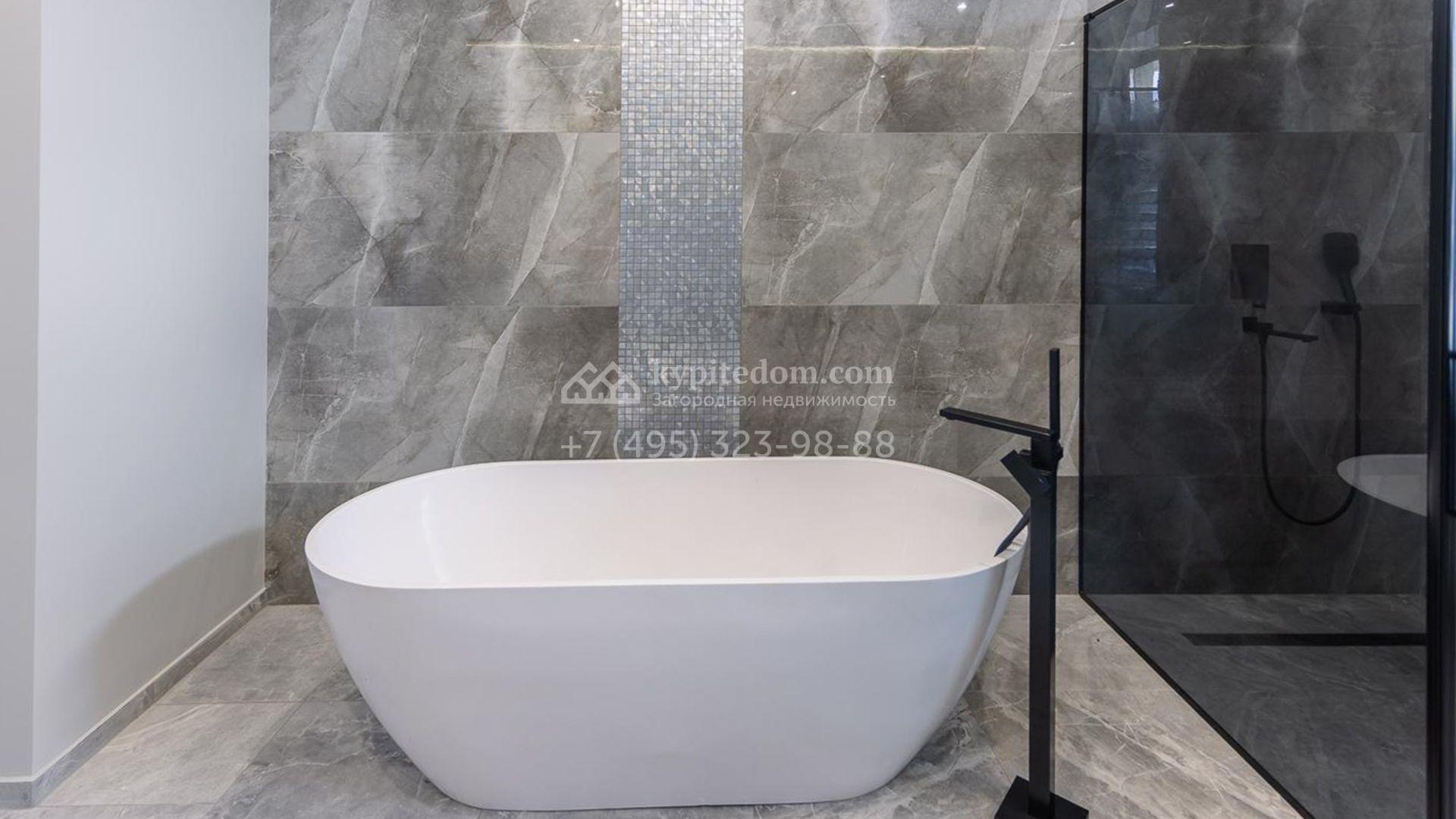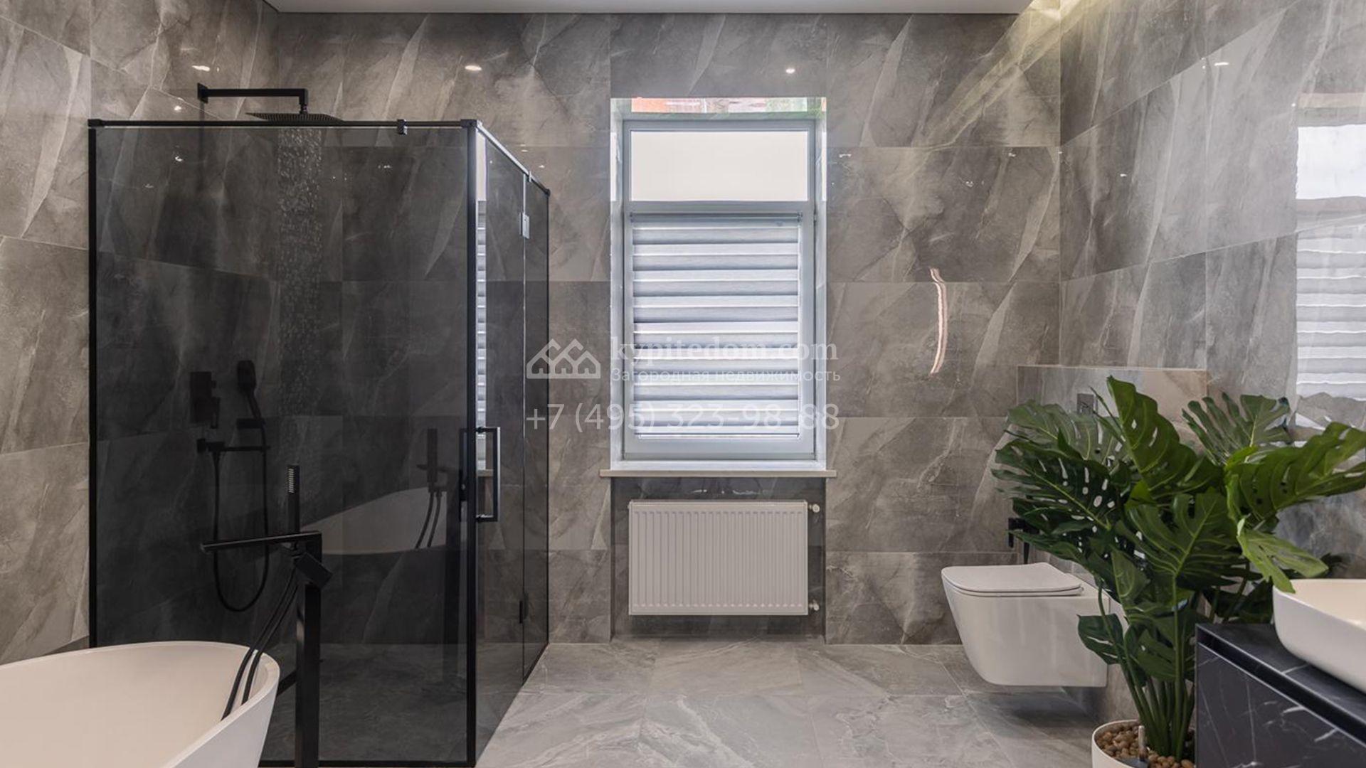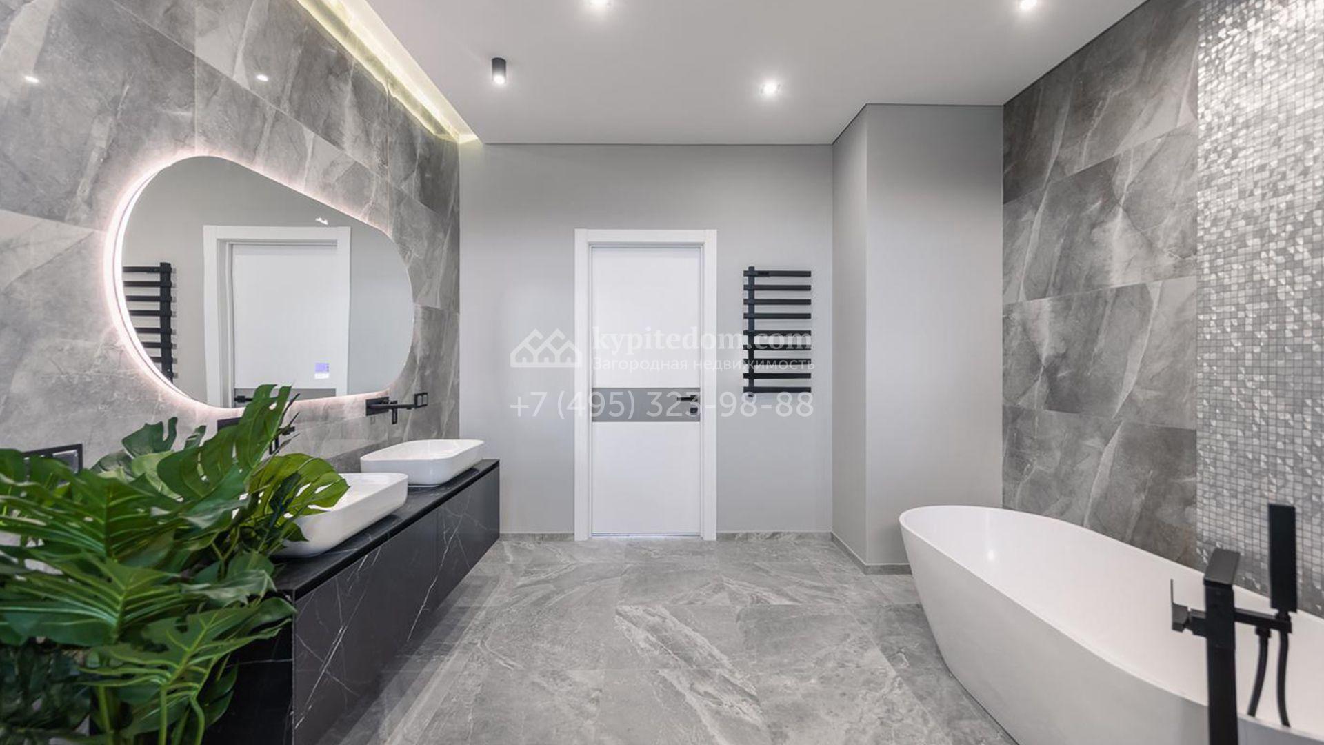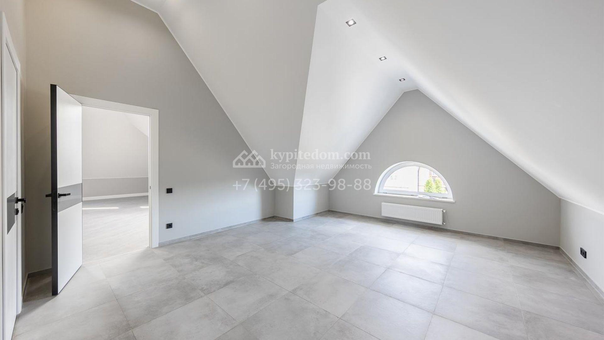 Спланированы 4 спальни, гостиная с каминным залом, кухня-столовая с выходом на террасу, SPA-зона с сауной и комната свободного назначения площадью 75 м² на мансардном этаже, где можно оборудовать игровую, кинотеатр или тренажерный зал. По периметру территории посеян газон, проложены дорожки, установлена система уличного освещения и предусмотрена просторная площадка для въезда.