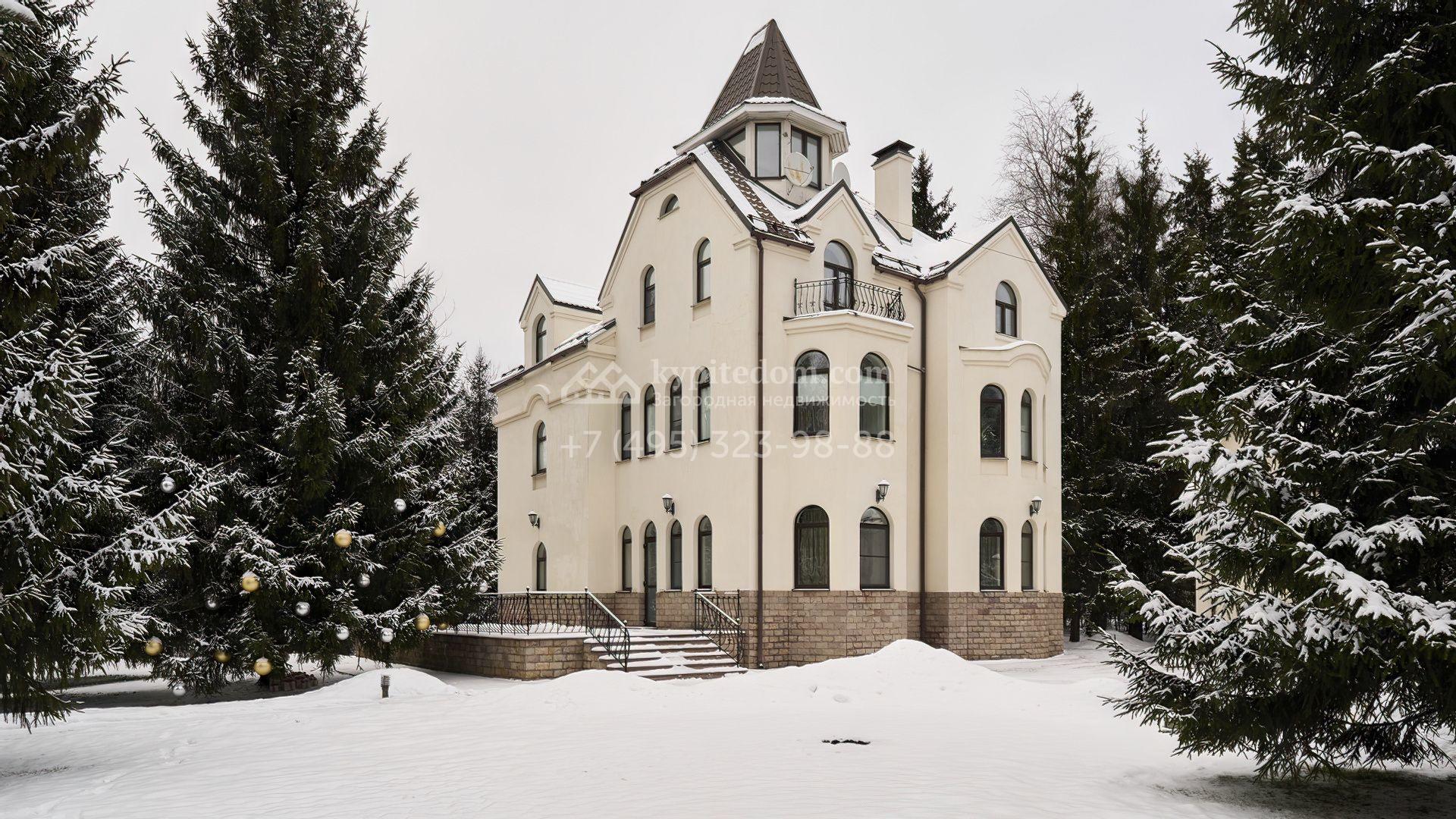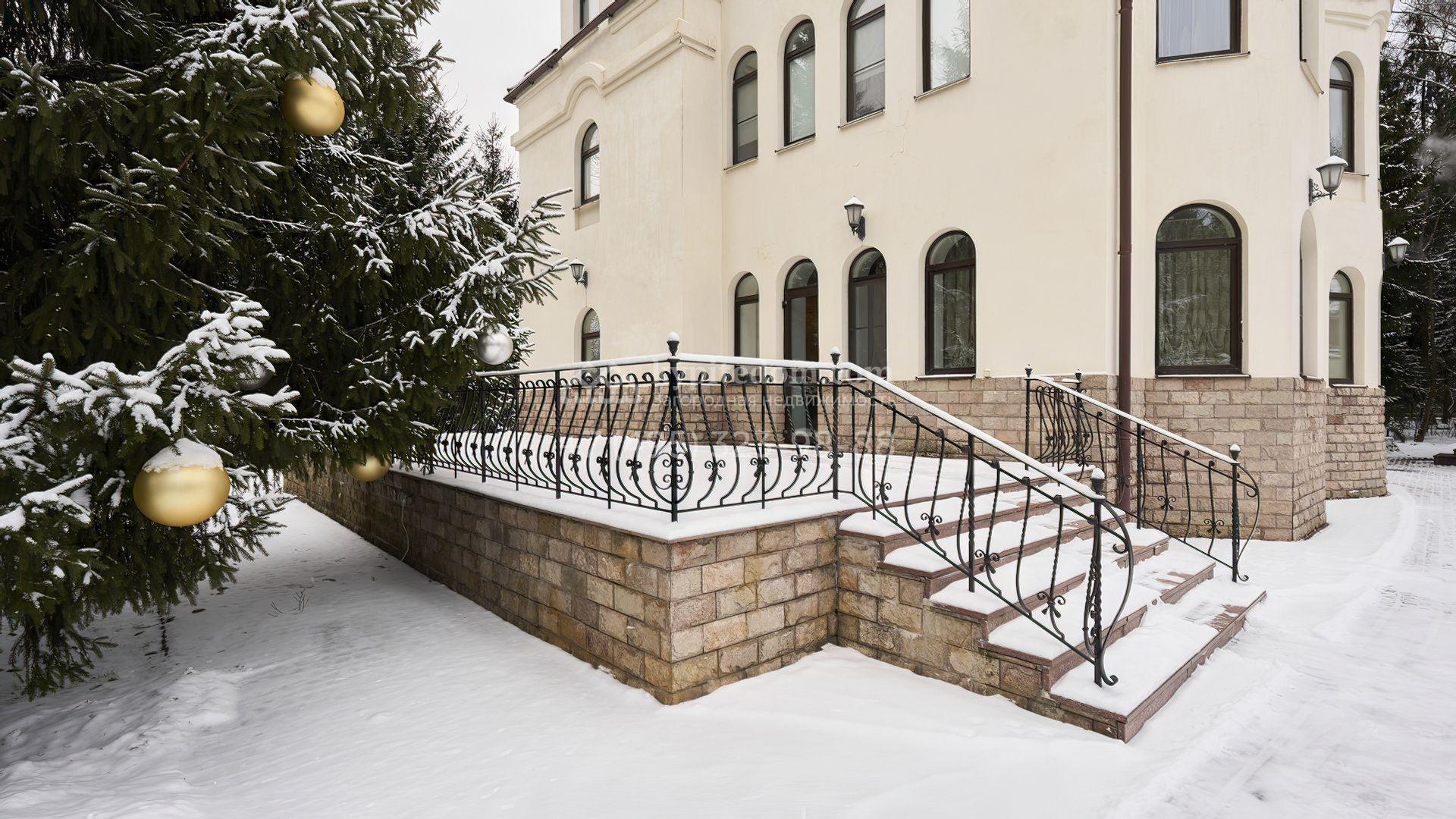 Трехэтажный коттедж площадью 364 м² расположен на участке 160 соток в окружении хвойного леса. Фасад здания выполнен в классическом стиле с элементами неоготики. Большие арочные окна, резные карнизы и фигурные кованные ограждения подчеркивают архитектуру. Кремовый оттенок штукатурки в сочетании с темно-коричневым камнем создают гармоничный контраст.