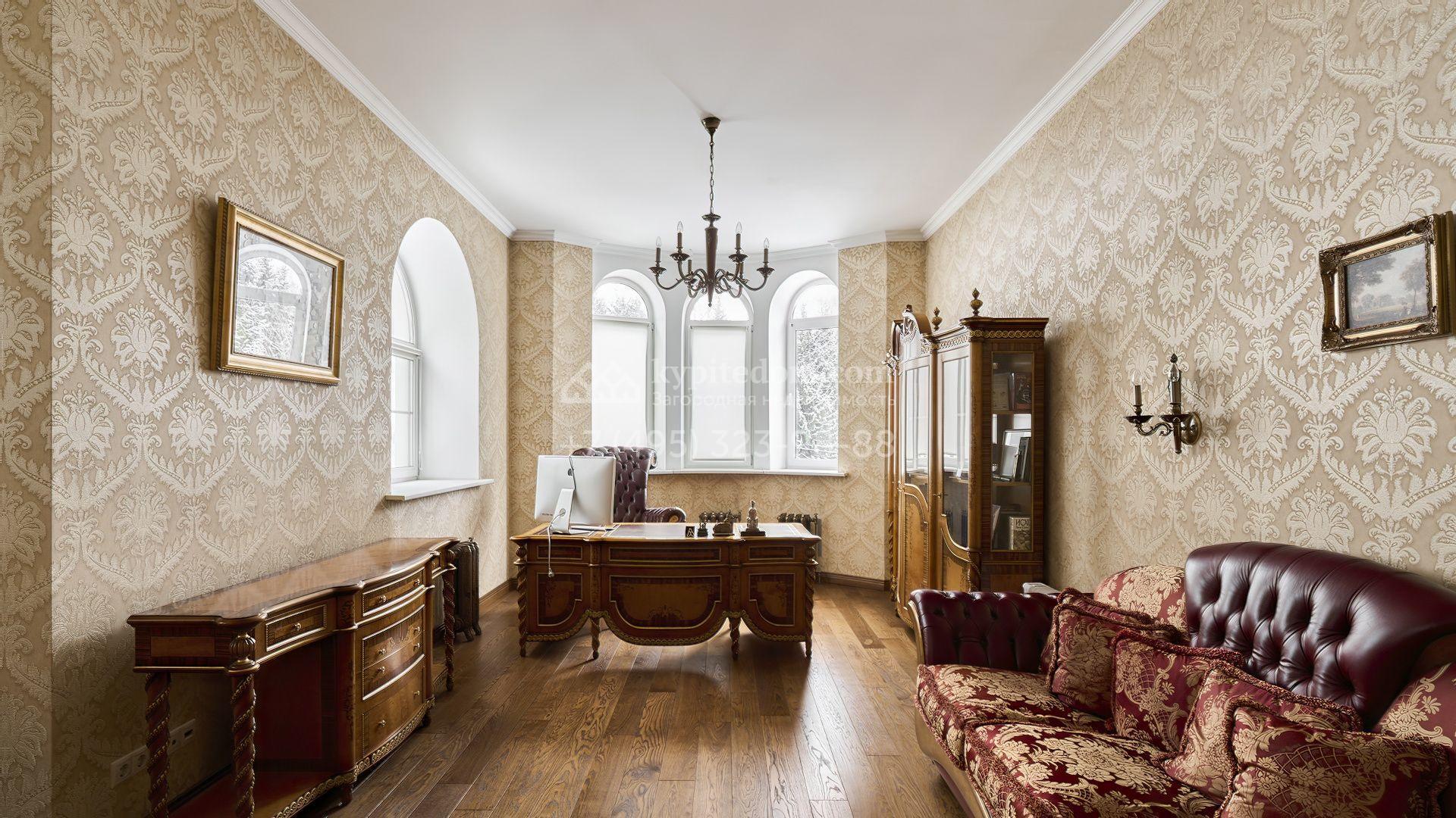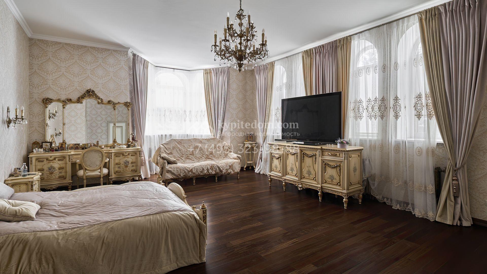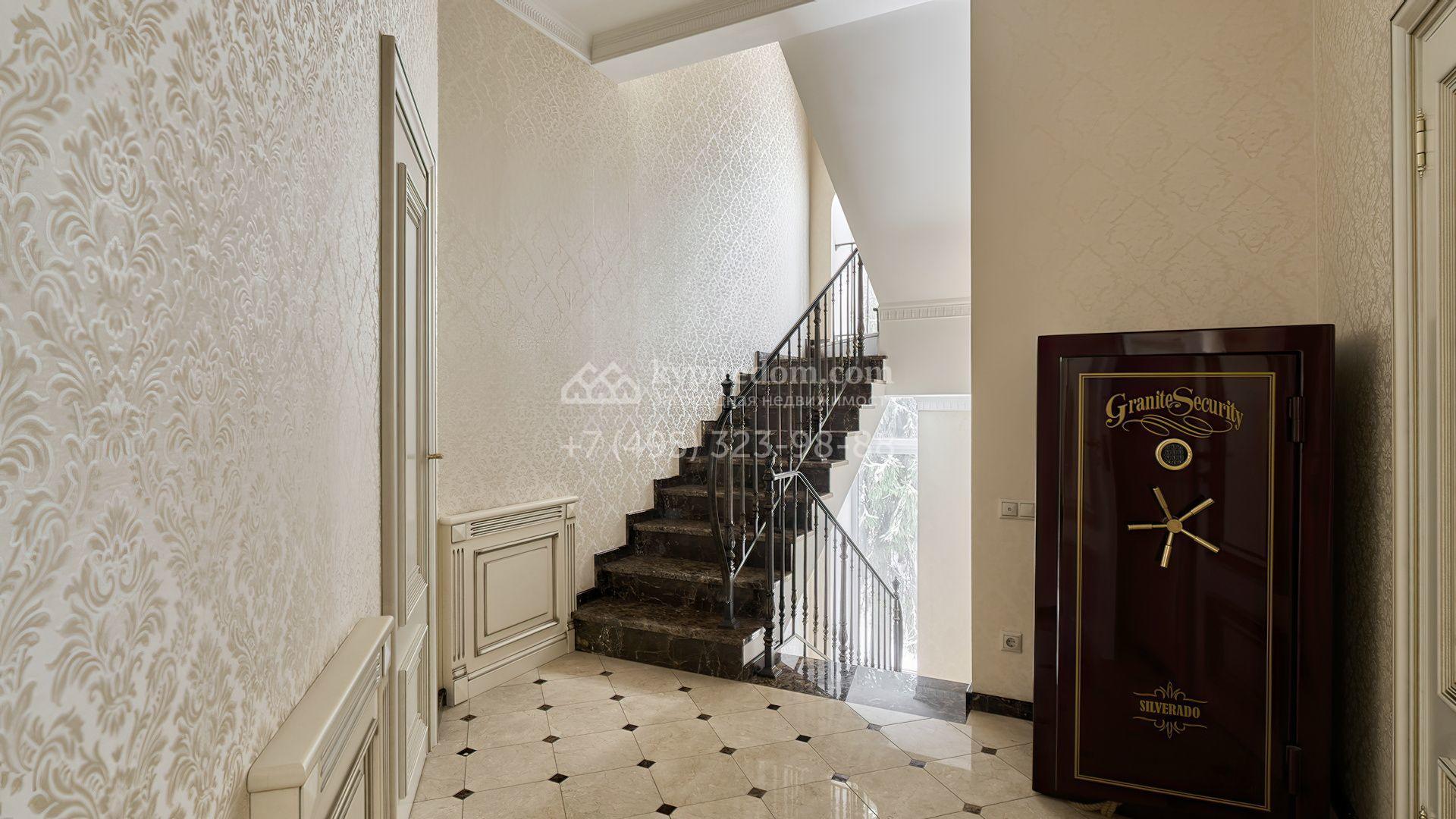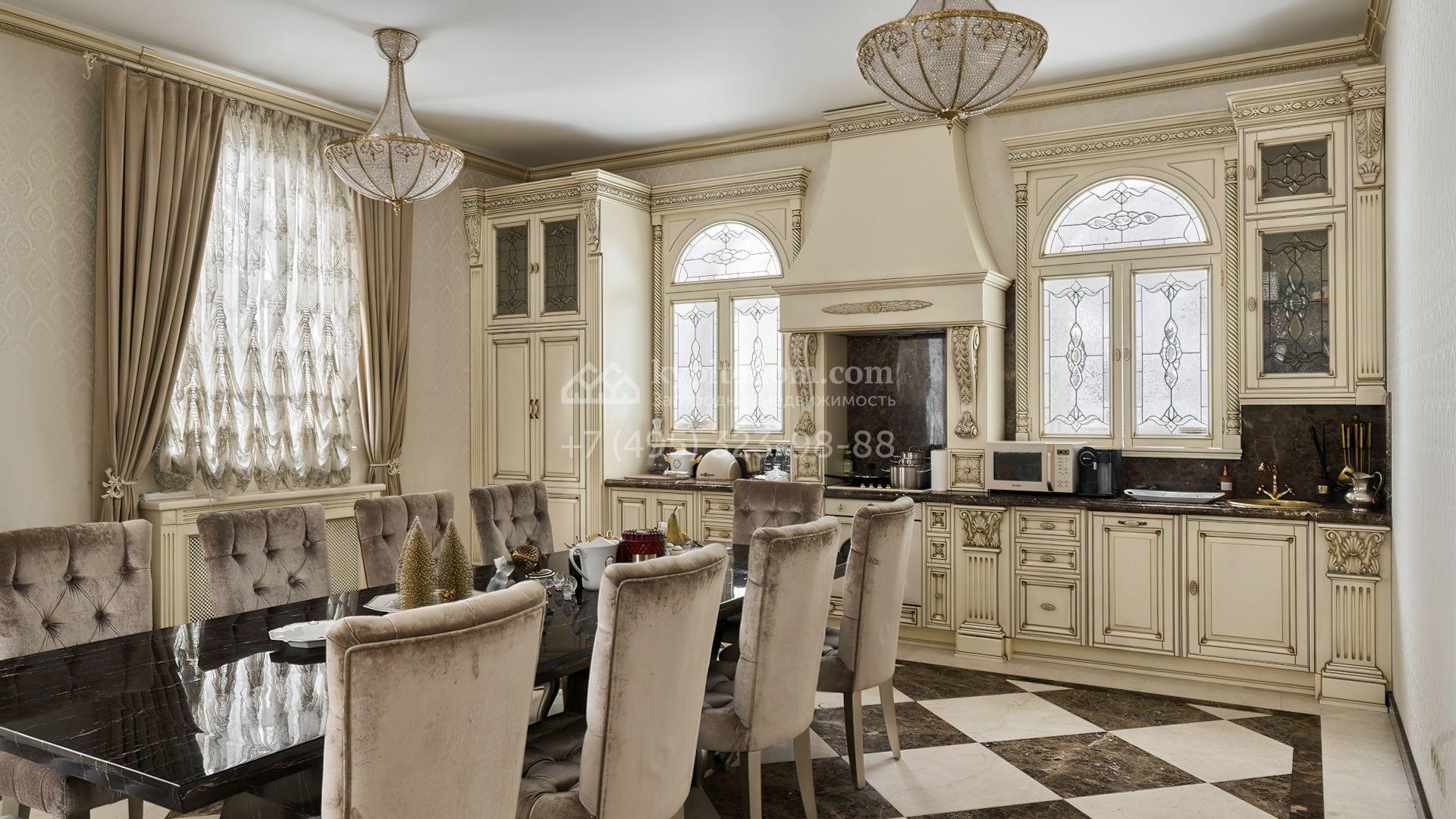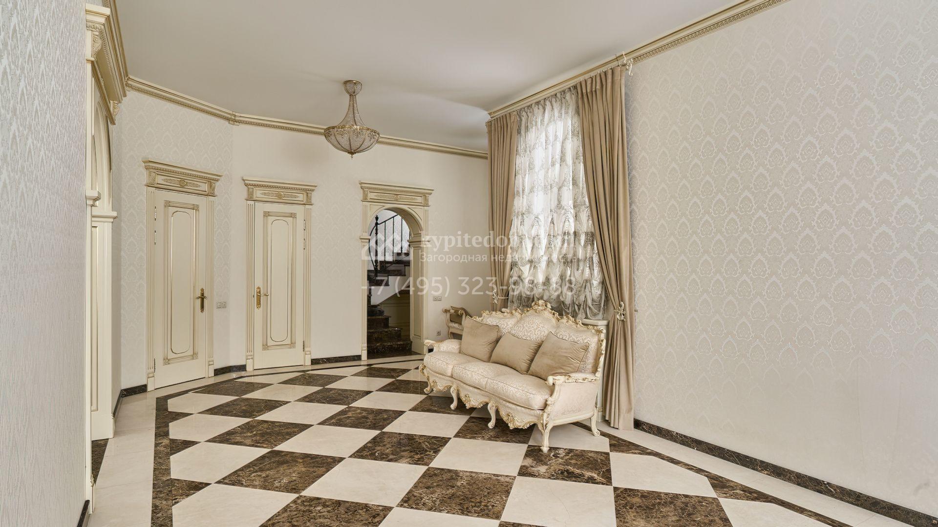 Внутреннее оформление выполнено с авторским подходом и выдержано в общей стилистике с домом. Для отделки использованы высококачественные и натуральные материалы — на полу выложены паркетная доска и плитка с мраморной фактурой. Потолки и стены украшены декоративными молдингами с позолоченными вставками, а арки и двери поддерживают тот же эстетический стиль.