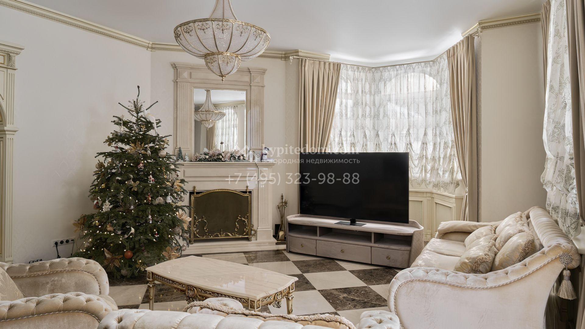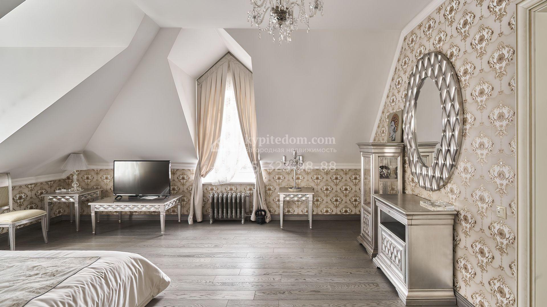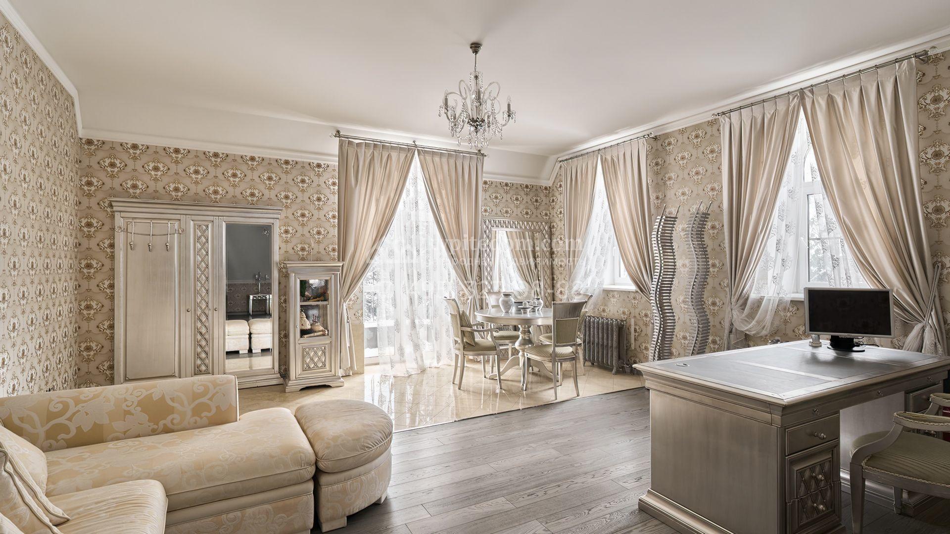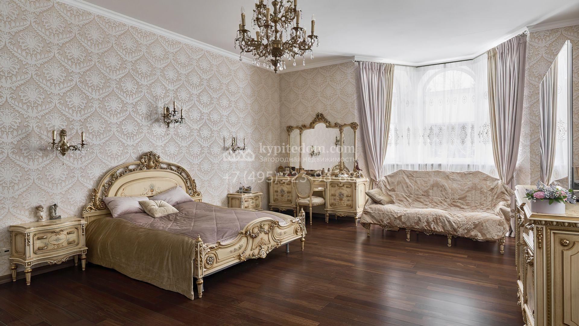 Внутреннее оформление выполнено с авторским подходом и выдержано в общей стилистике с домом. Для отделки использованы высококачественные и натуральные материалы — на полу выложены паркетная доска и плитка с мраморной фактурой. Потолки и стены украшены декоративными молдингами с позолоченными вставками, а арки и двери поддерживают тот же эстетический стиль.