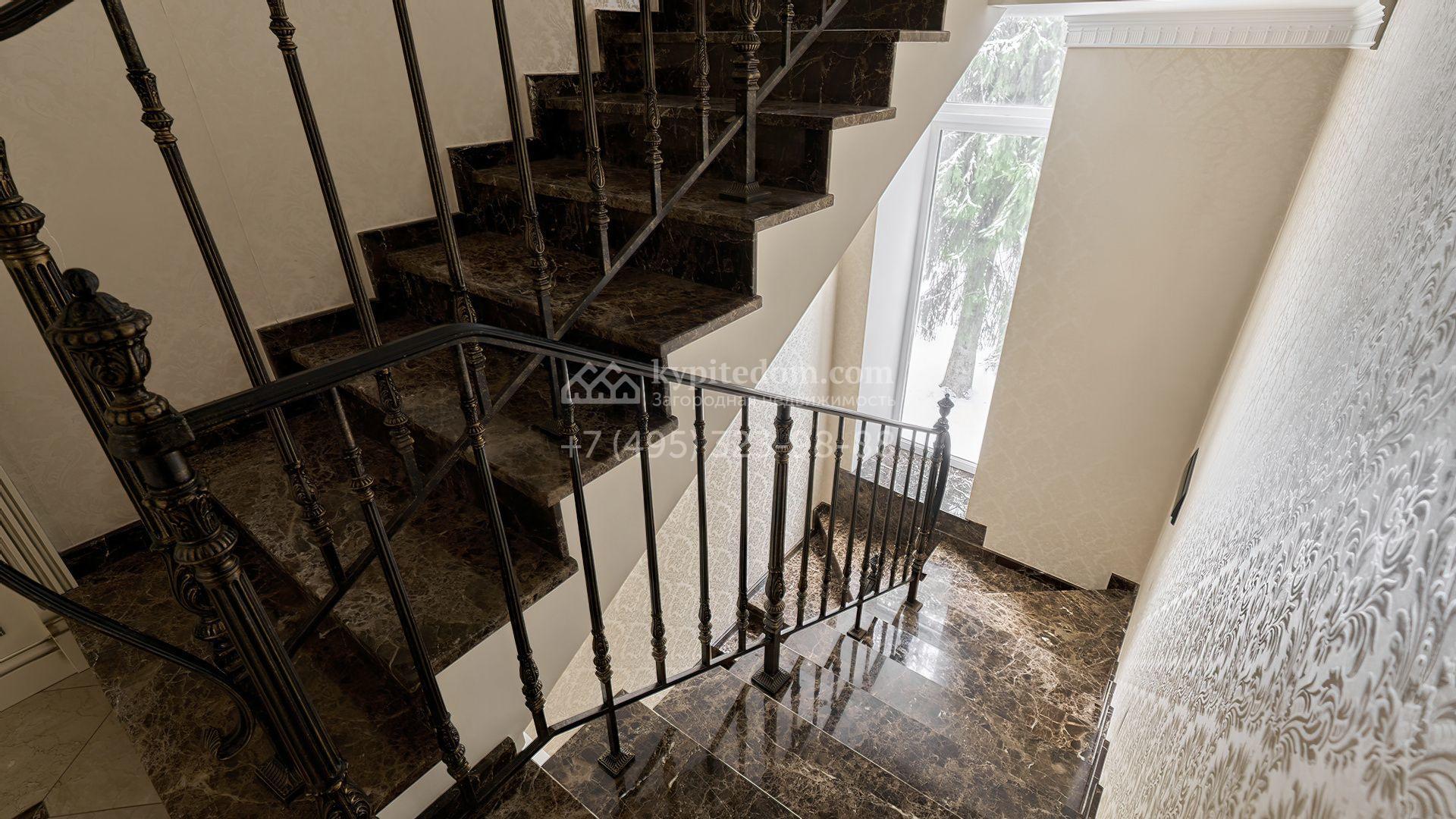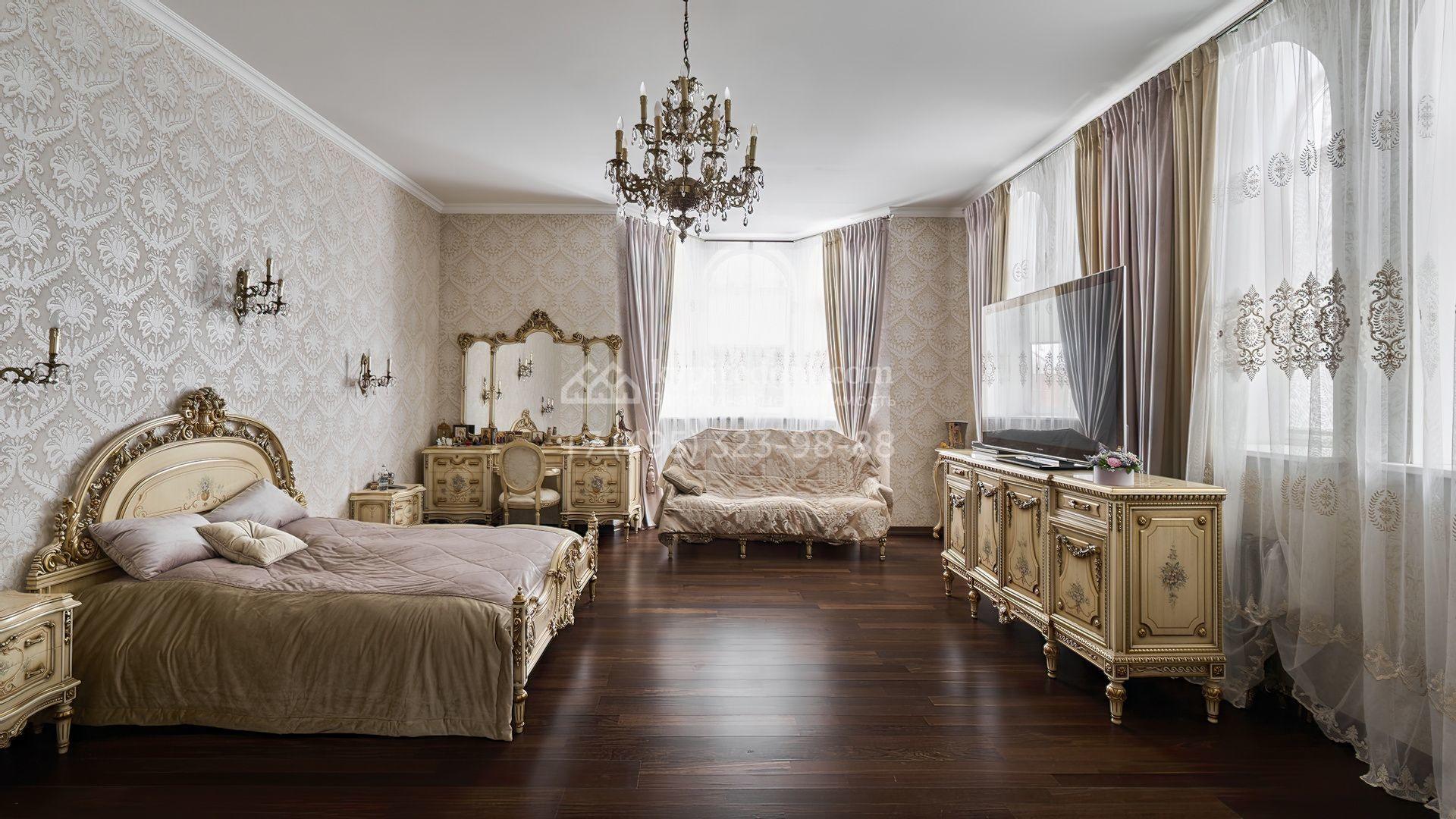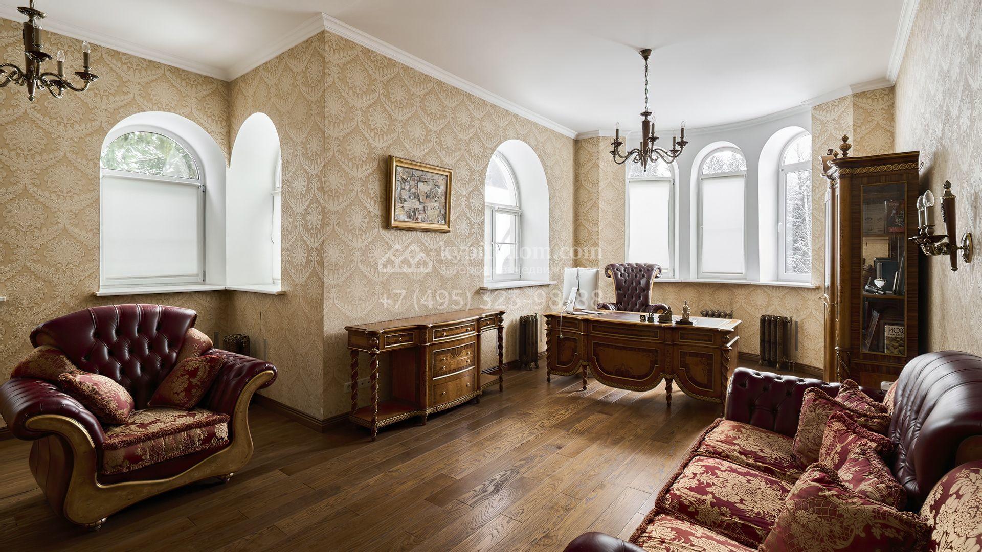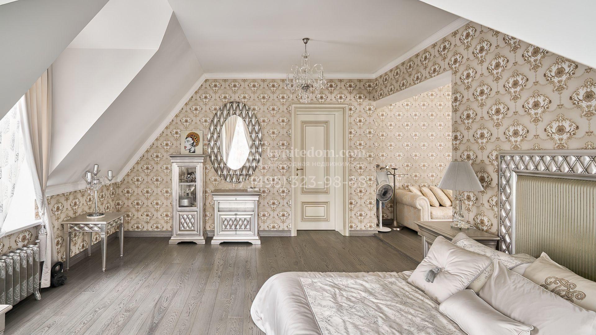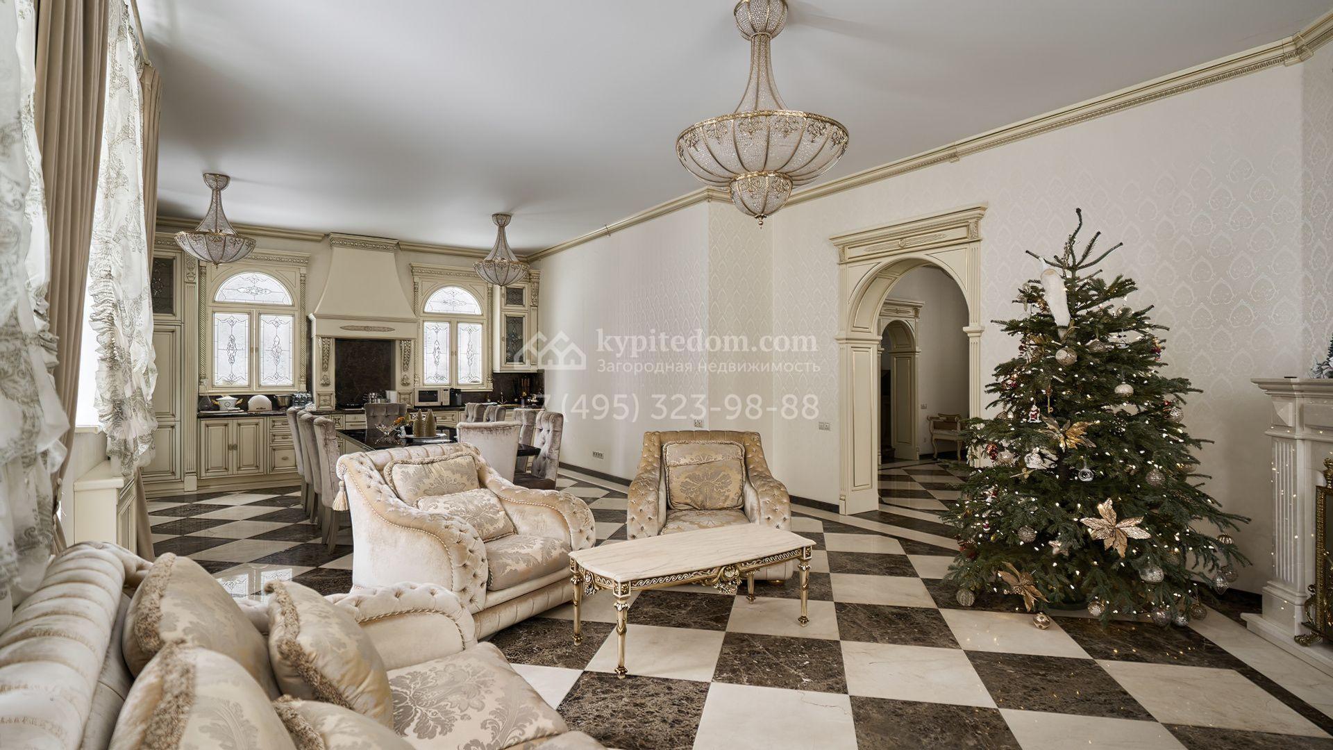 Внутреннее оформление выполнено с авторским подходом и выдержано в общей стилистике с домом. Для отделки использованы высококачественные и натуральные материалы — на полу выложены паркетная доска и плитка с мраморной фактурой. Потолки и стены украшены декоративными молдингами с позолоченными вставками, а арки и двери поддерживают тот же эстетический стиль.