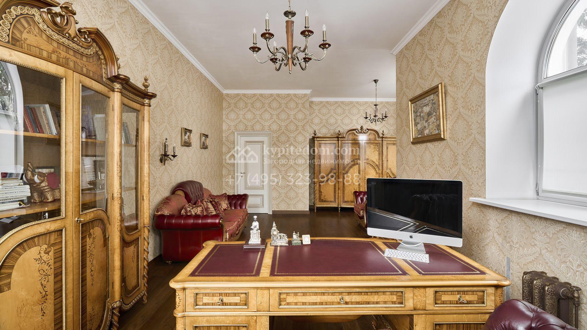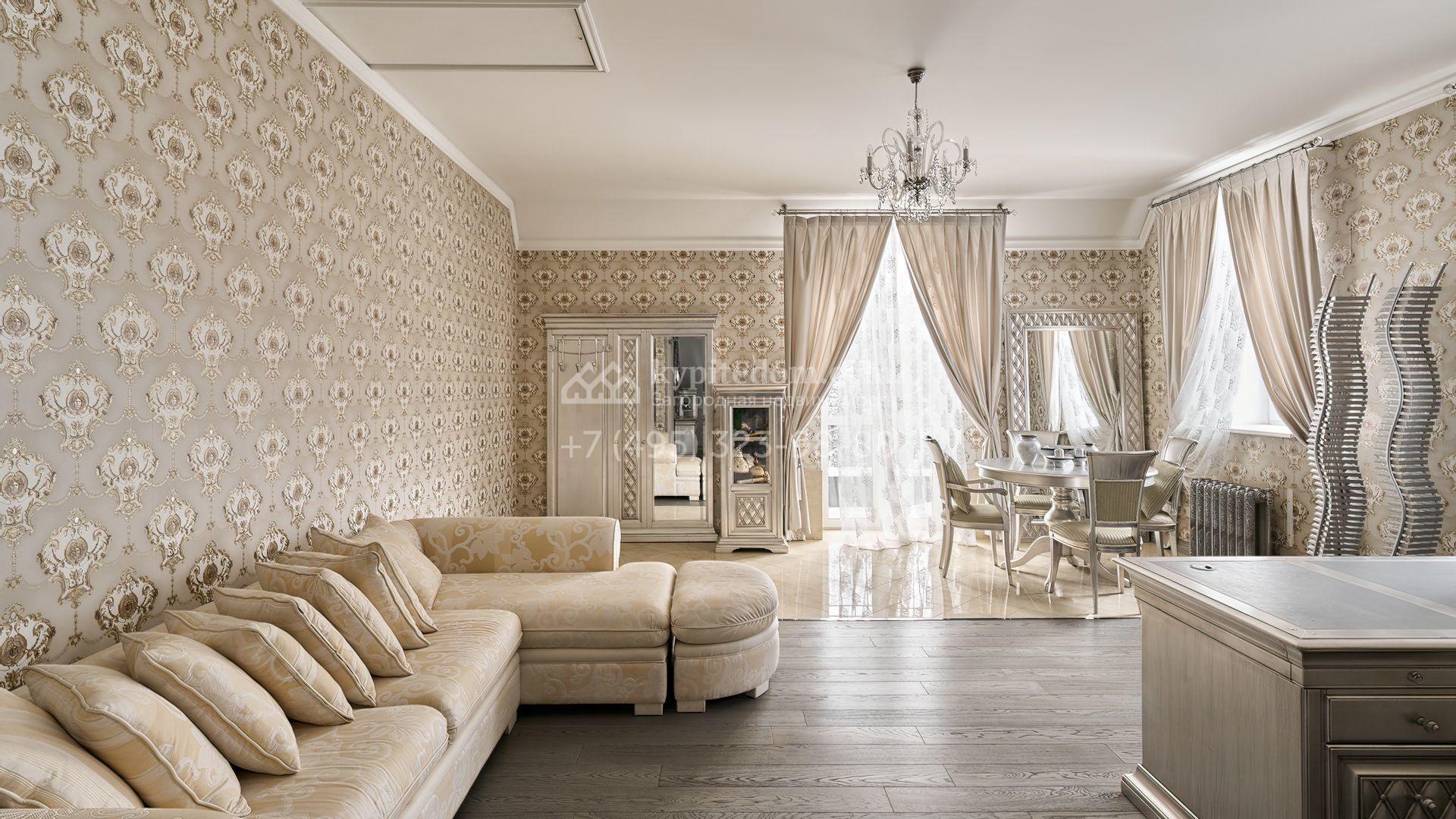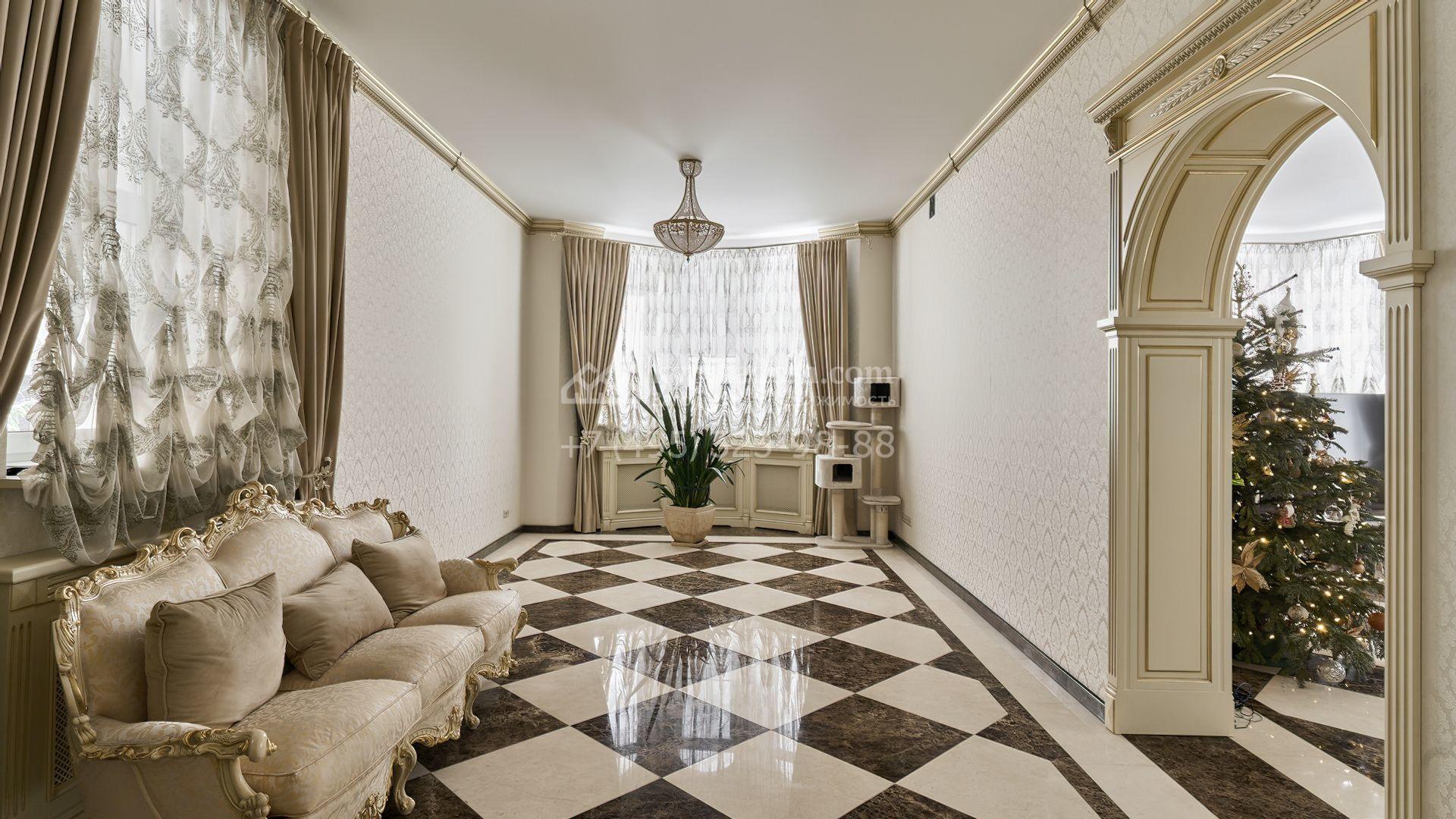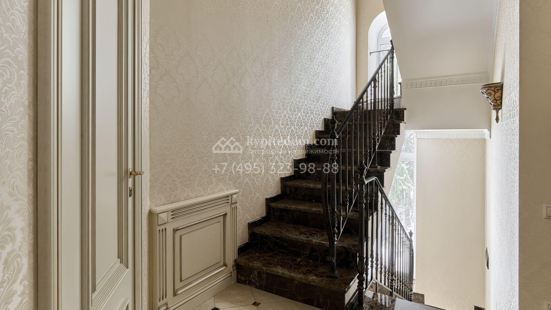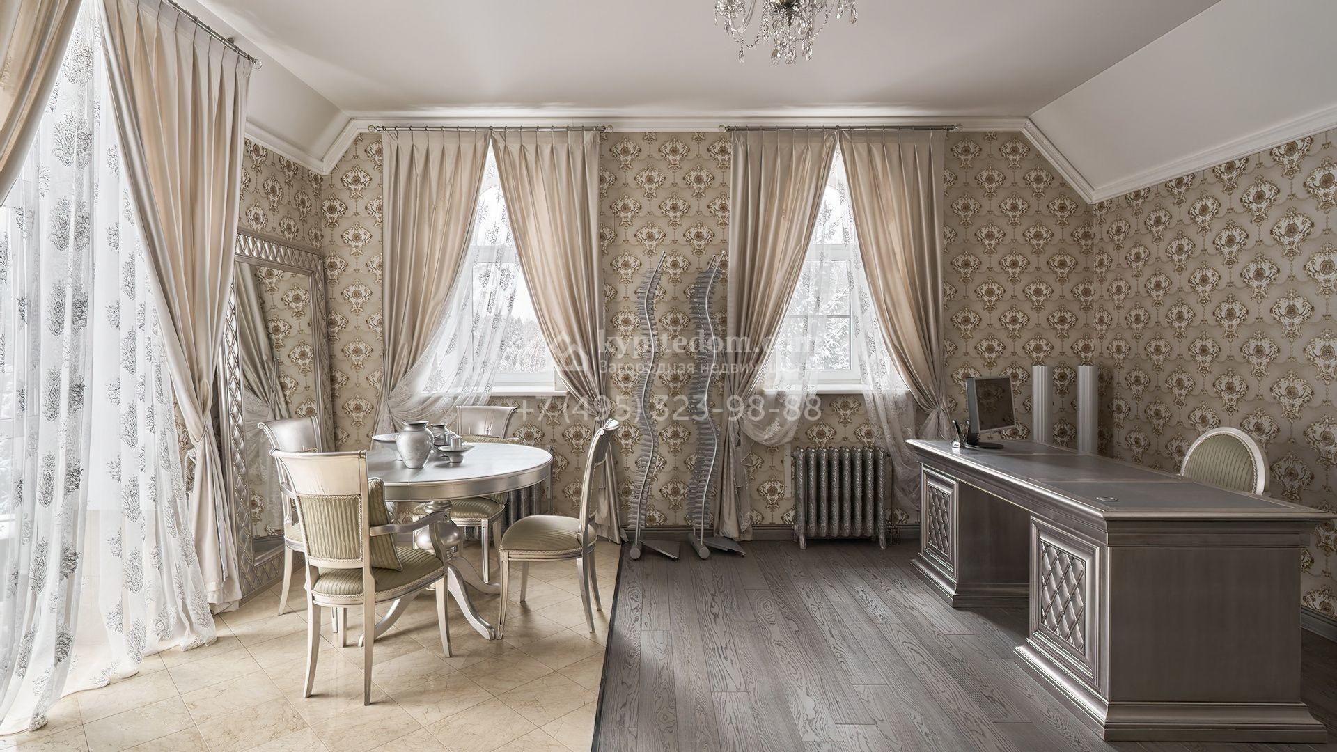 Внутреннее оформление выполнено с авторским подходом и выдержано в общей стилистике с домом. Для отделки использованы высококачественные и натуральные материалы — на полу выложены паркетная доска и плитка с мраморной фактурой. Потолки и стены украшены декоративными молдингами с позолоченными вставками, а арки и двери поддерживают тот же эстетический стиль.
