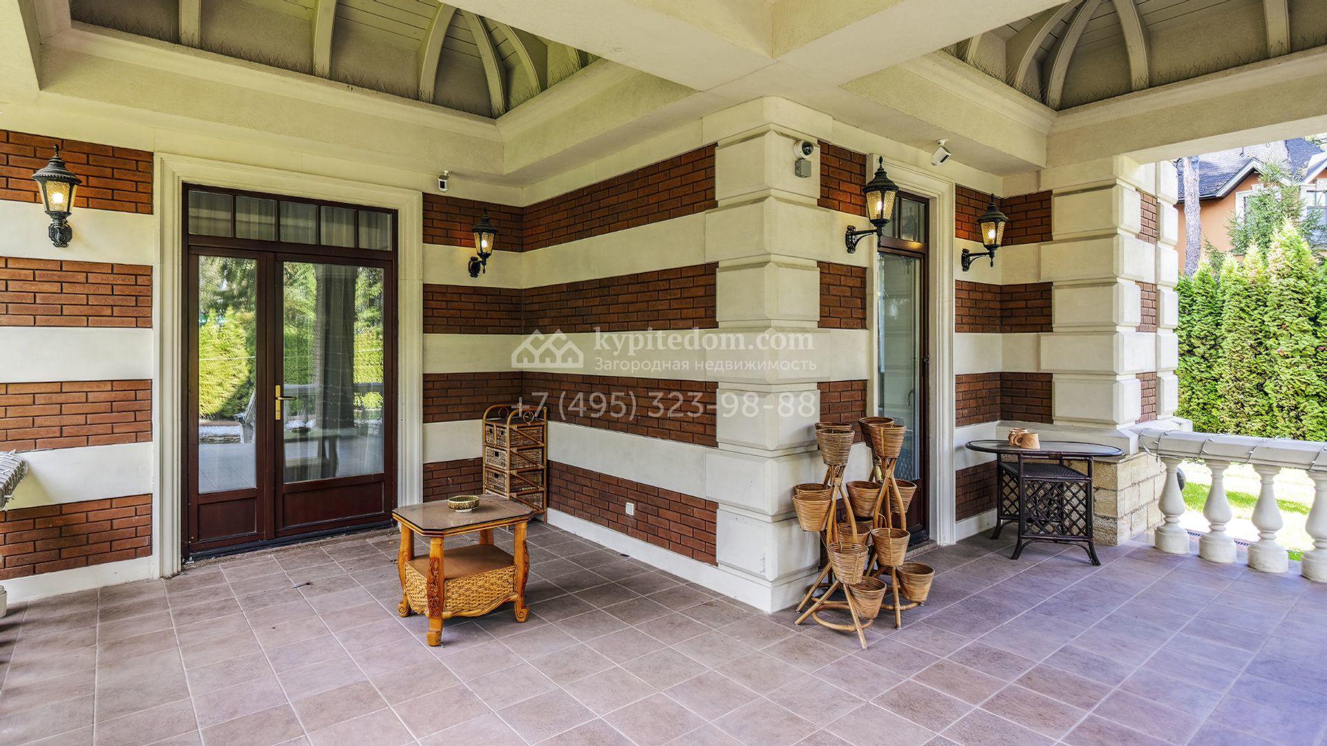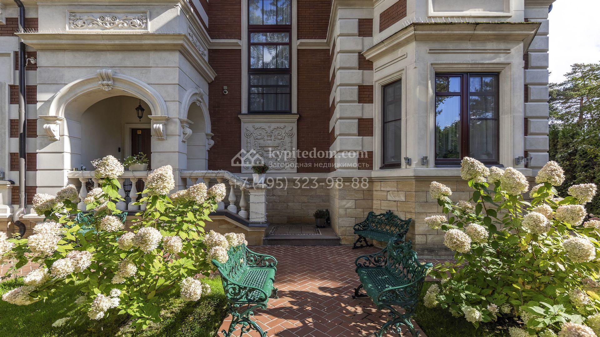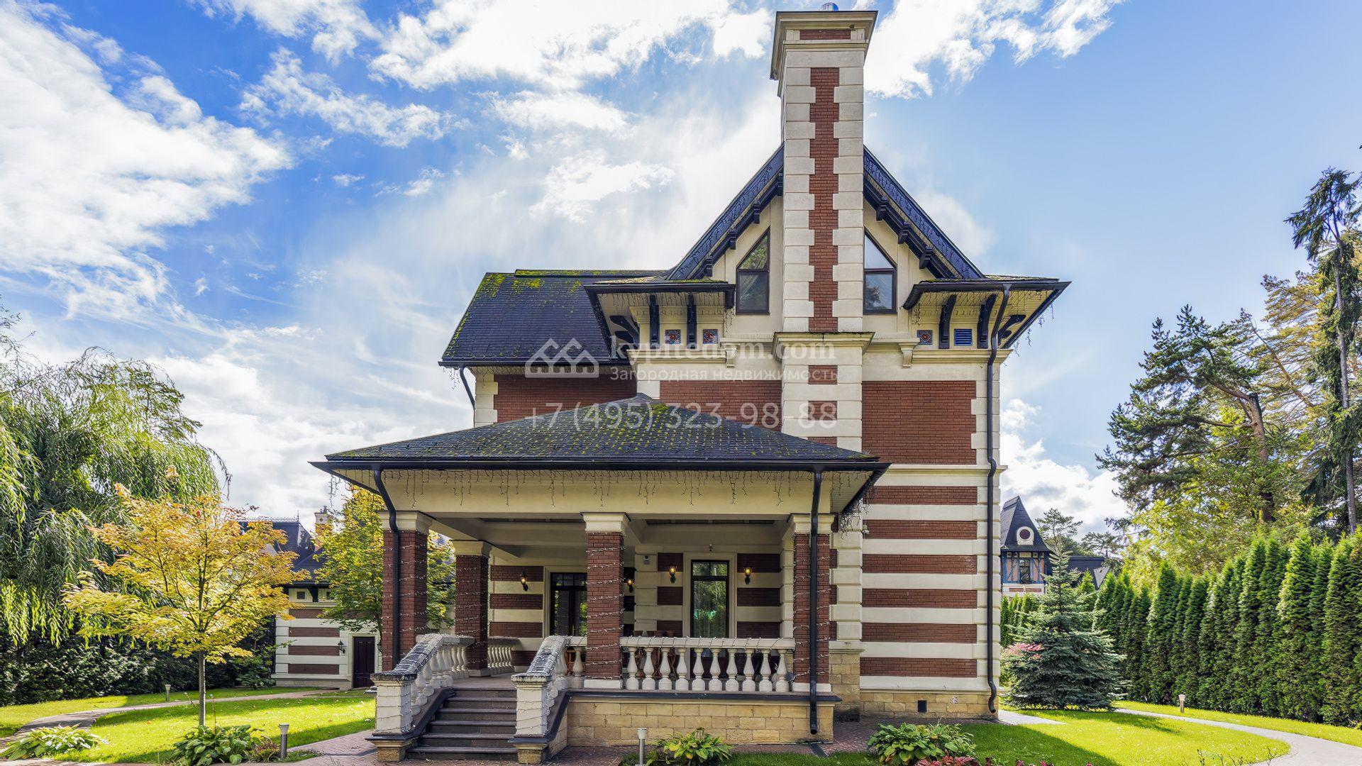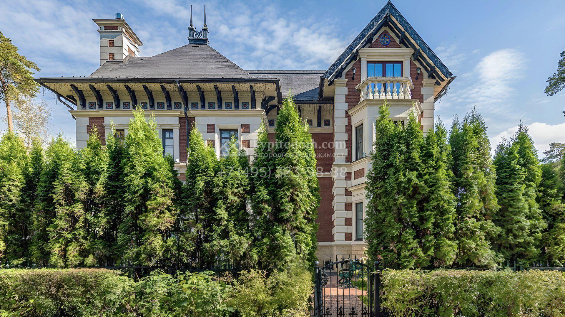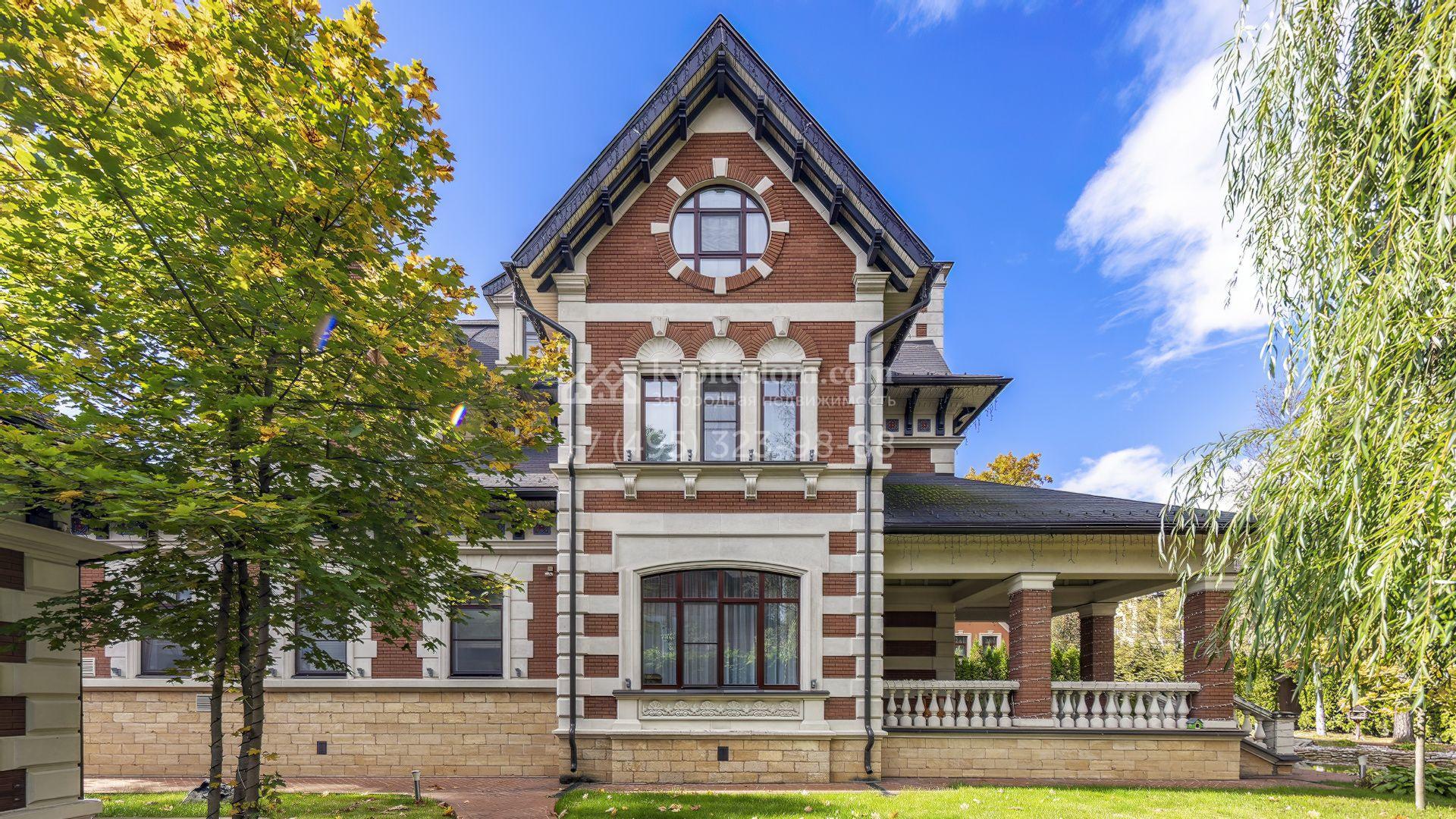 Загородный дом площадью 365 м² расположен на участке 18,3 сотки рядом с лесным массивом. Архитектура выдержана в нормандском стиле — фасад объединяет терракотовый кирпич с натуральным камнем, формирующим выразительные полосы и угловые акценты. Крыша из тёмного шифера подчеркнута резными кронштейнами, центральная часть выделена портиком с колоннами и арочными проёмами. Образ дополняют эркеры, балкон с каменной балюстрадой и декоративные фризы.