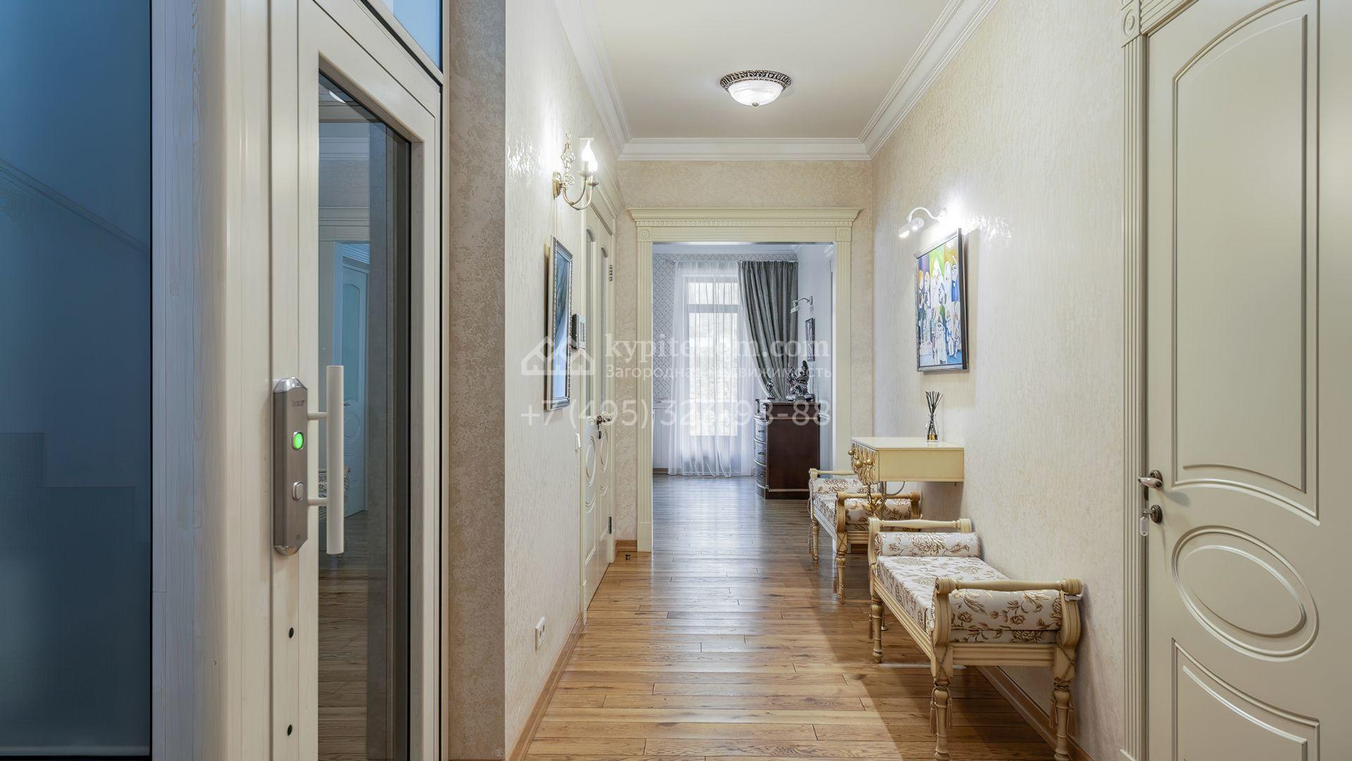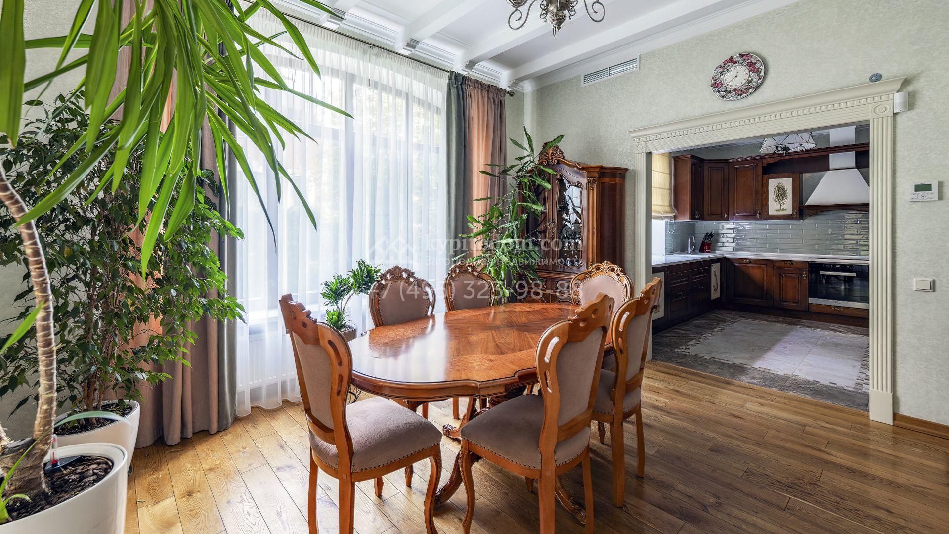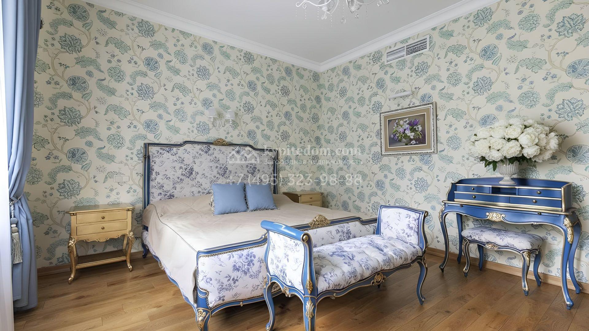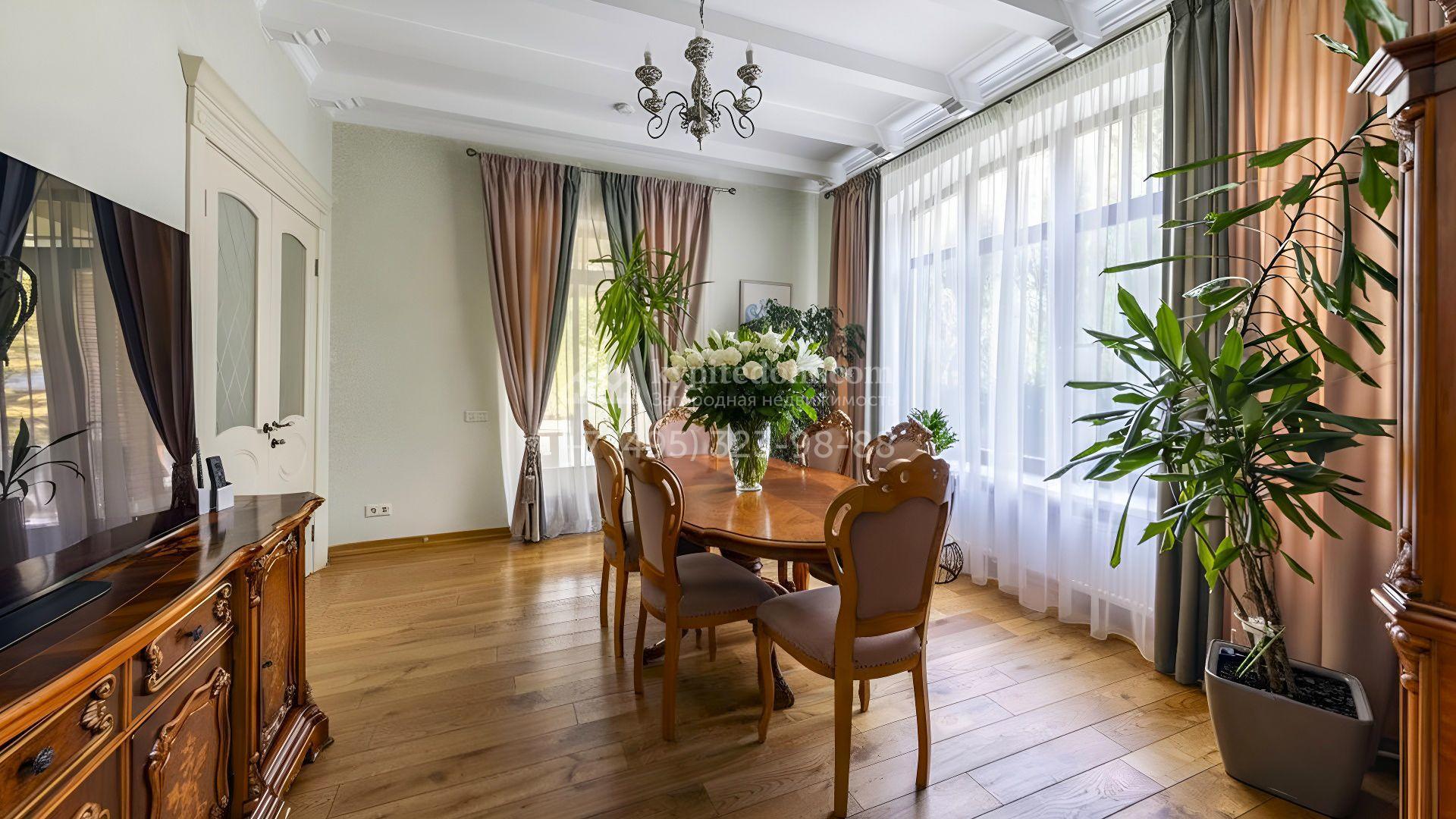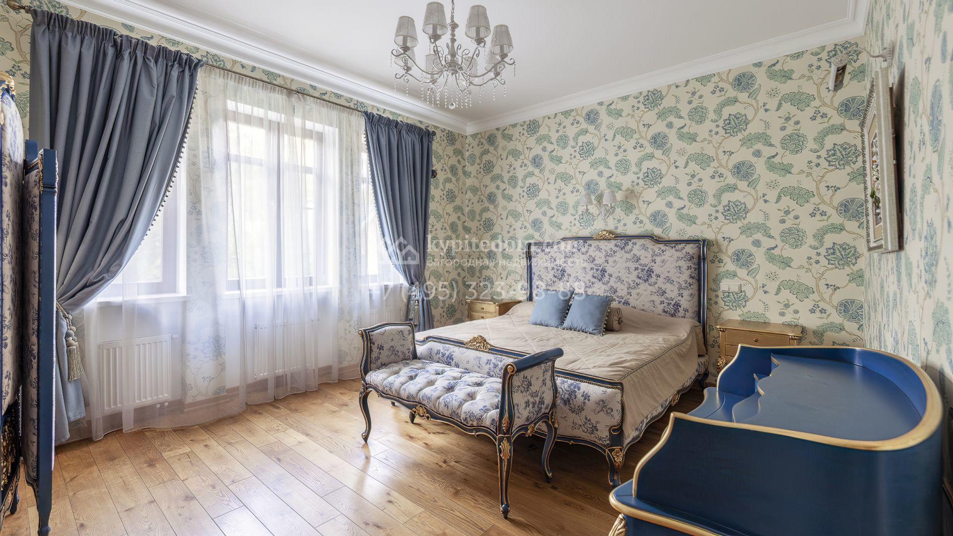 Интерьеры оформлены в европейской классике. Светлая палитра пастельных оттенков и тёплое дерево создают уютную атмосферу. Полы с фактурой древесины гармонируют со стенами, отделанными обоями с геометрическими и растительными мотивами. Потолки украшены молдингами и розетками, а в столовой использованы декоративные балки. Мебель из массива с резными элементами и витринные шкафы с изящными фасадами поддерживают единый ансамбль.