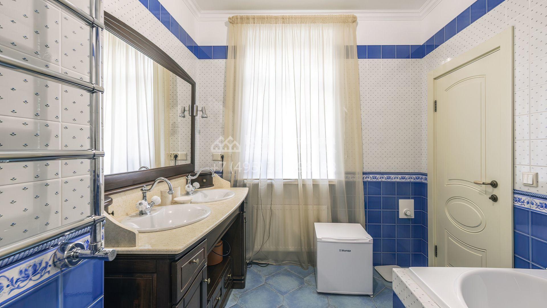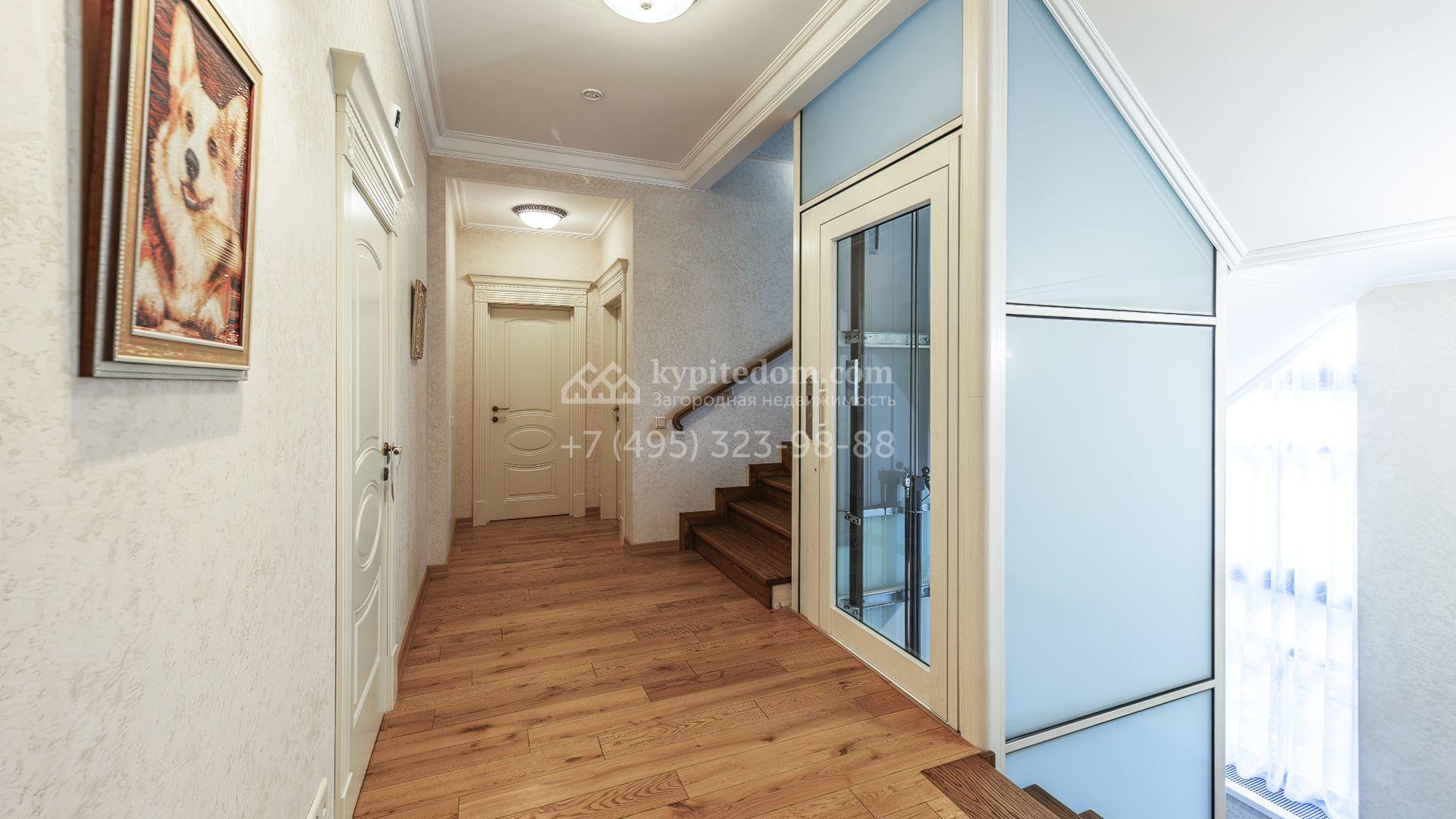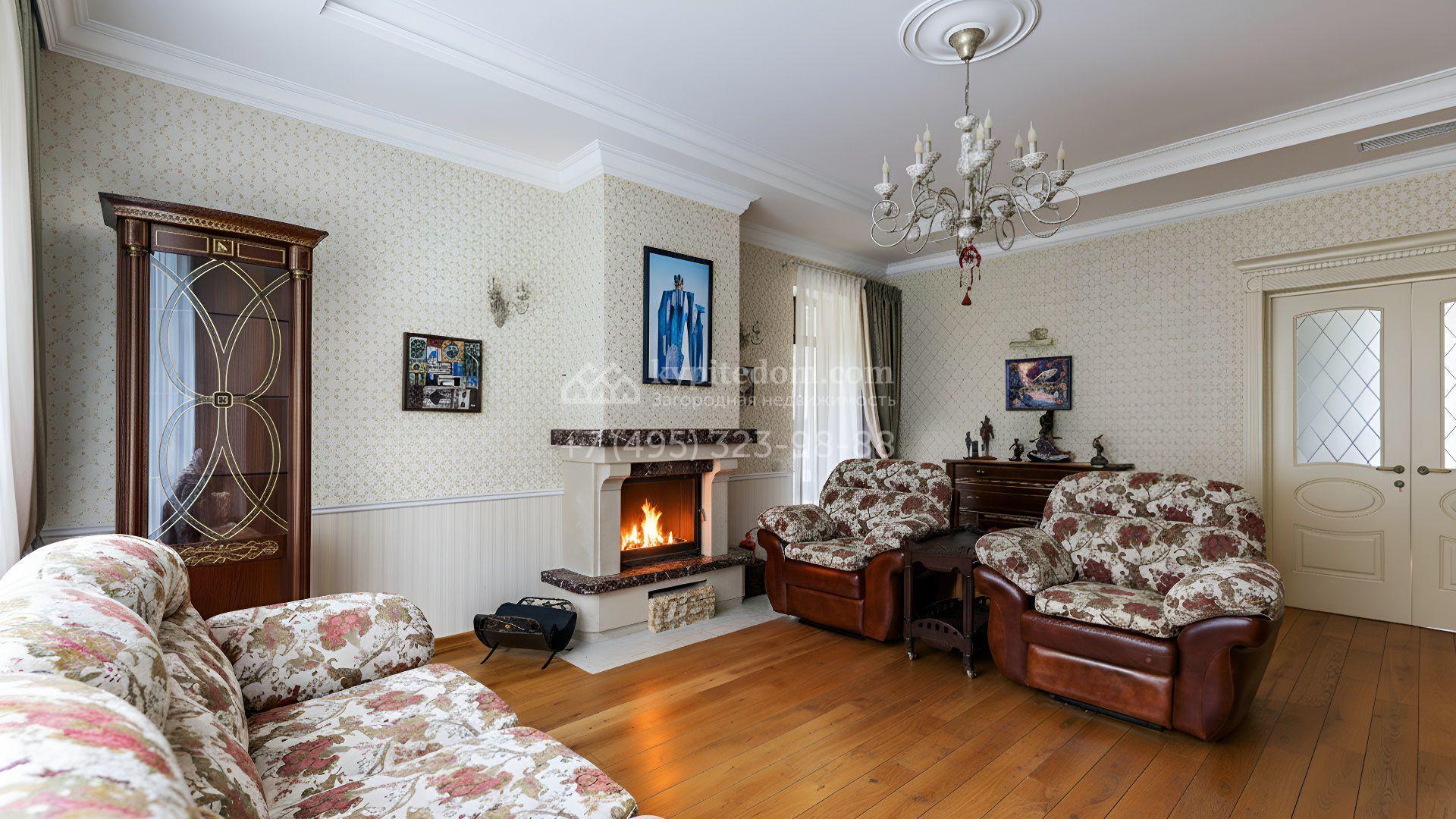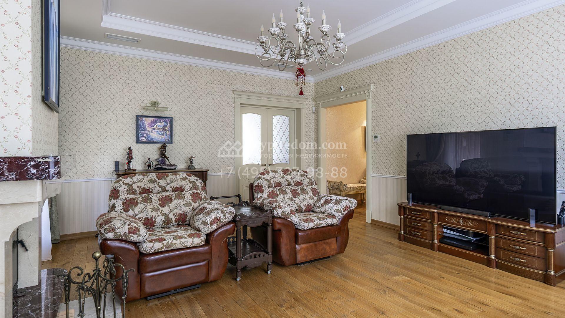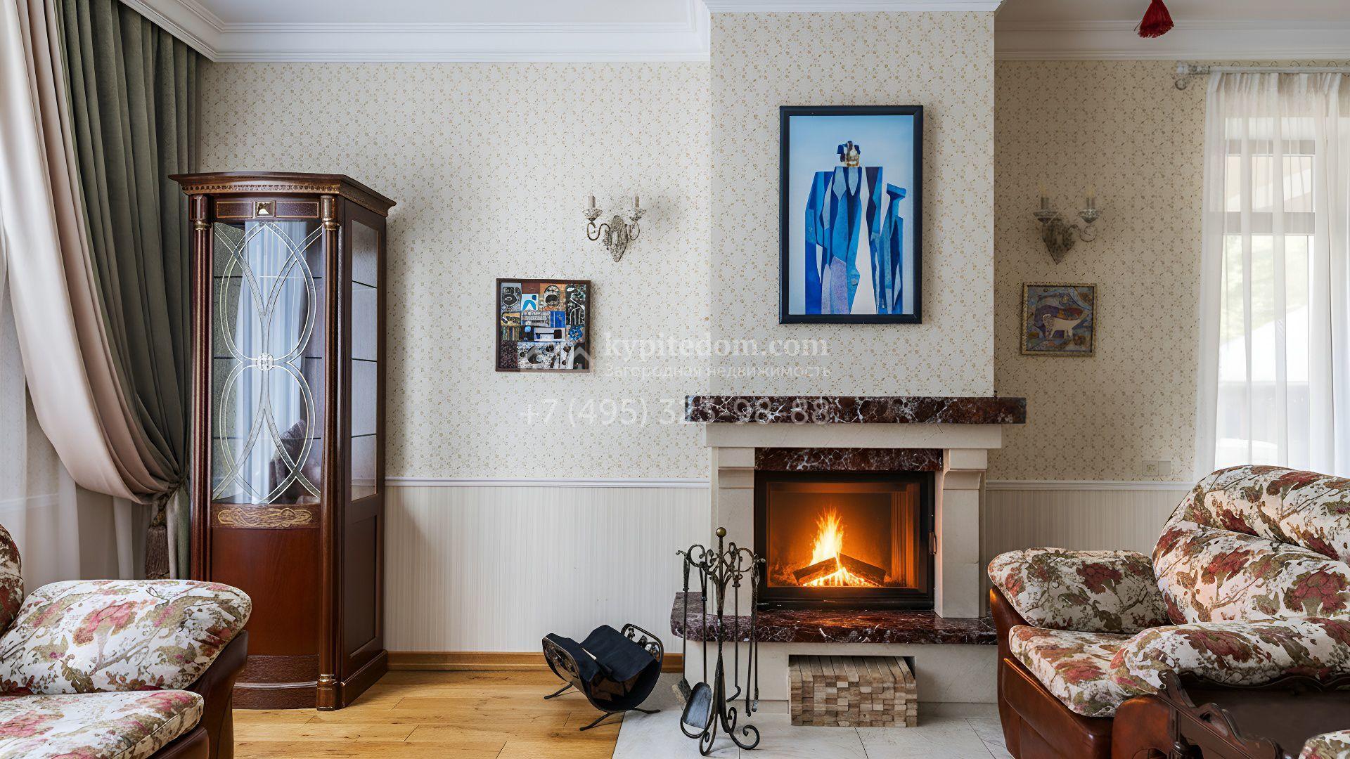 Интерьеры оформлены в европейской классике. Светлая палитра пастельных оттенков и тёплое дерево создают уютную атмосферу. Полы с фактурой древесины гармонируют со стенами, отделанными обоями с геометрическими и растительными мотивами. Потолки украшены молдингами и розетками, а в столовой использованы декоративные балки. Мебель из массива с резными элементами и витринные шкафы с изящными фасадами поддерживают единый ансамбль.