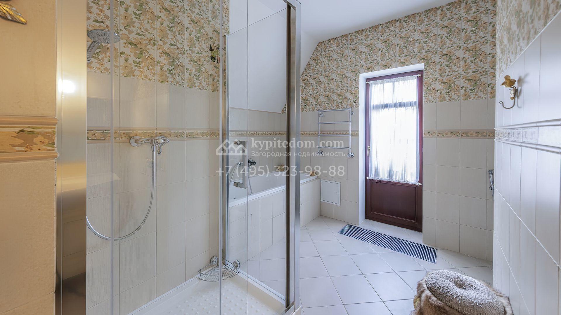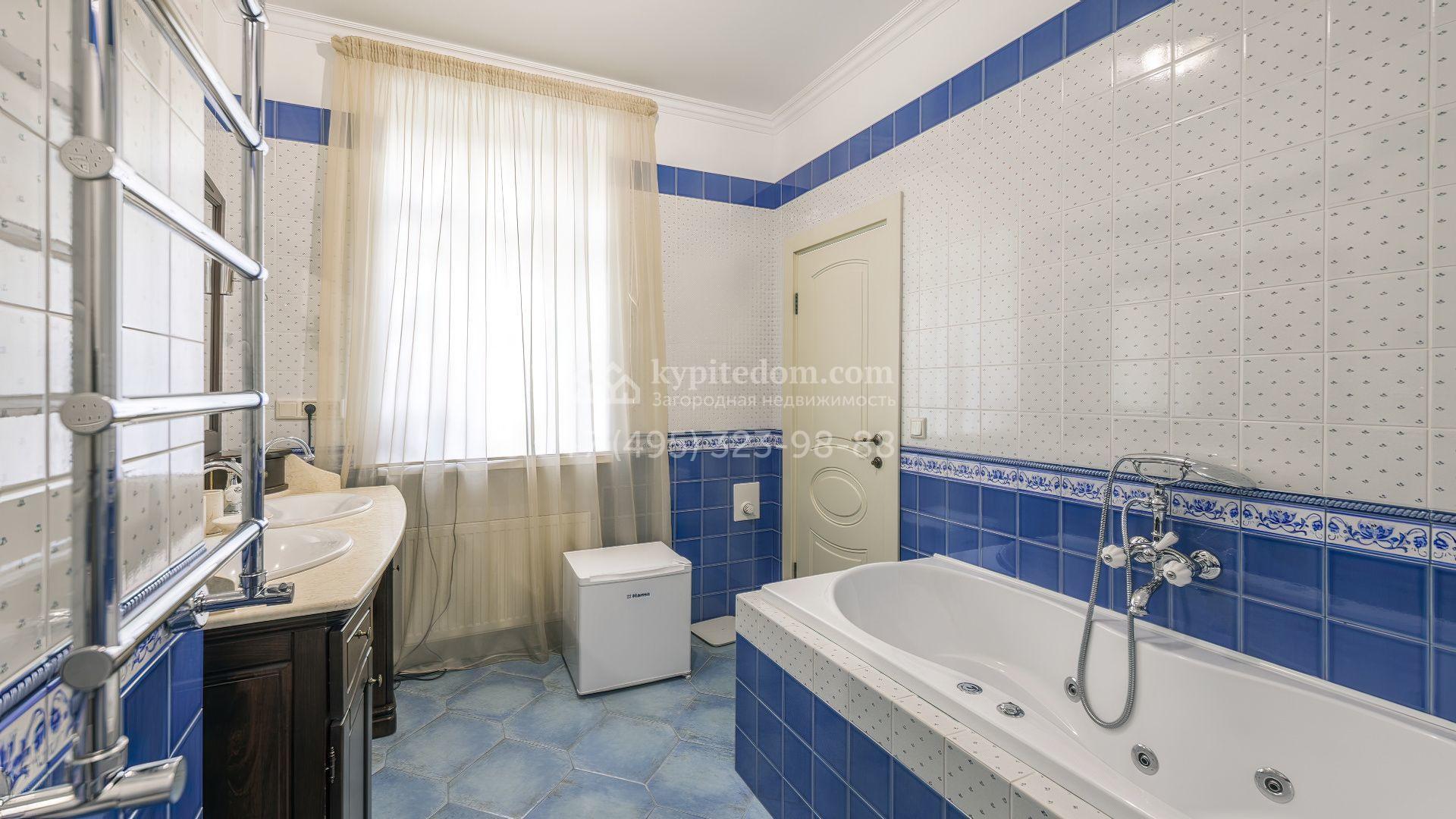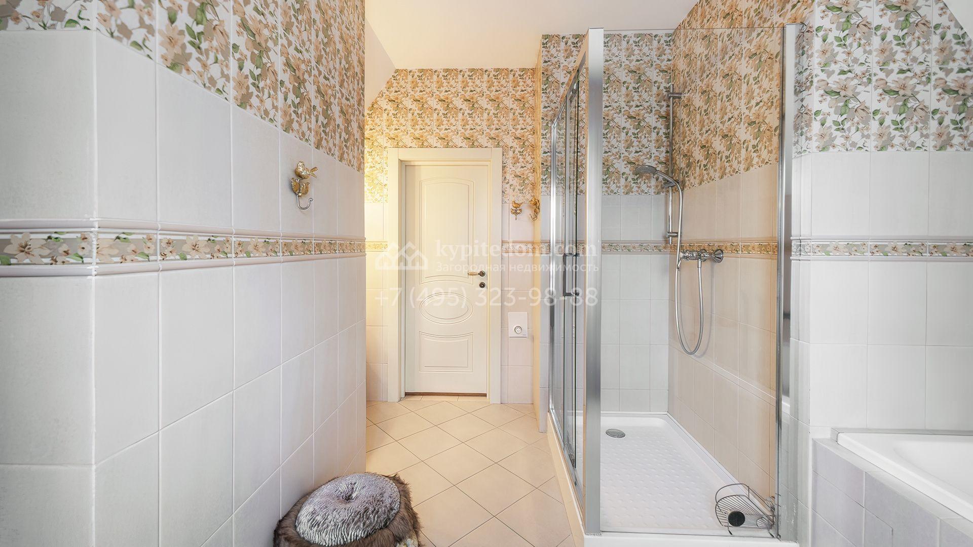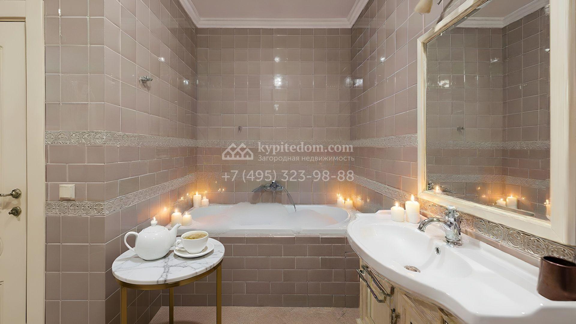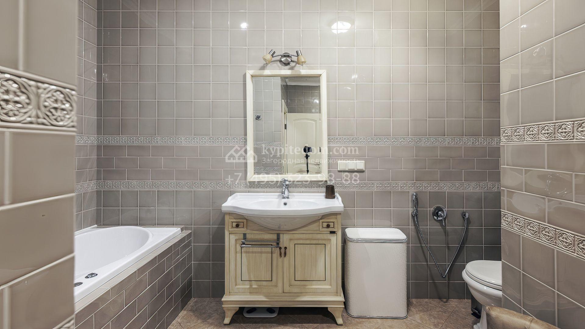 Интерьеры оформлены в европейской классике. Светлая палитра пастельных оттенков и тёплое дерево создают уютную атмосферу. Полы с фактурой древесины гармонируют со стенами, отделанными обоями с геометрическими и растительными мотивами. Потолки украшены молдингами и розетками, а в столовой использованы декоративные балки. Мебель из массива с резными элементами и витринные шкафы с изящными фасадами поддерживают единый ансамбль.
