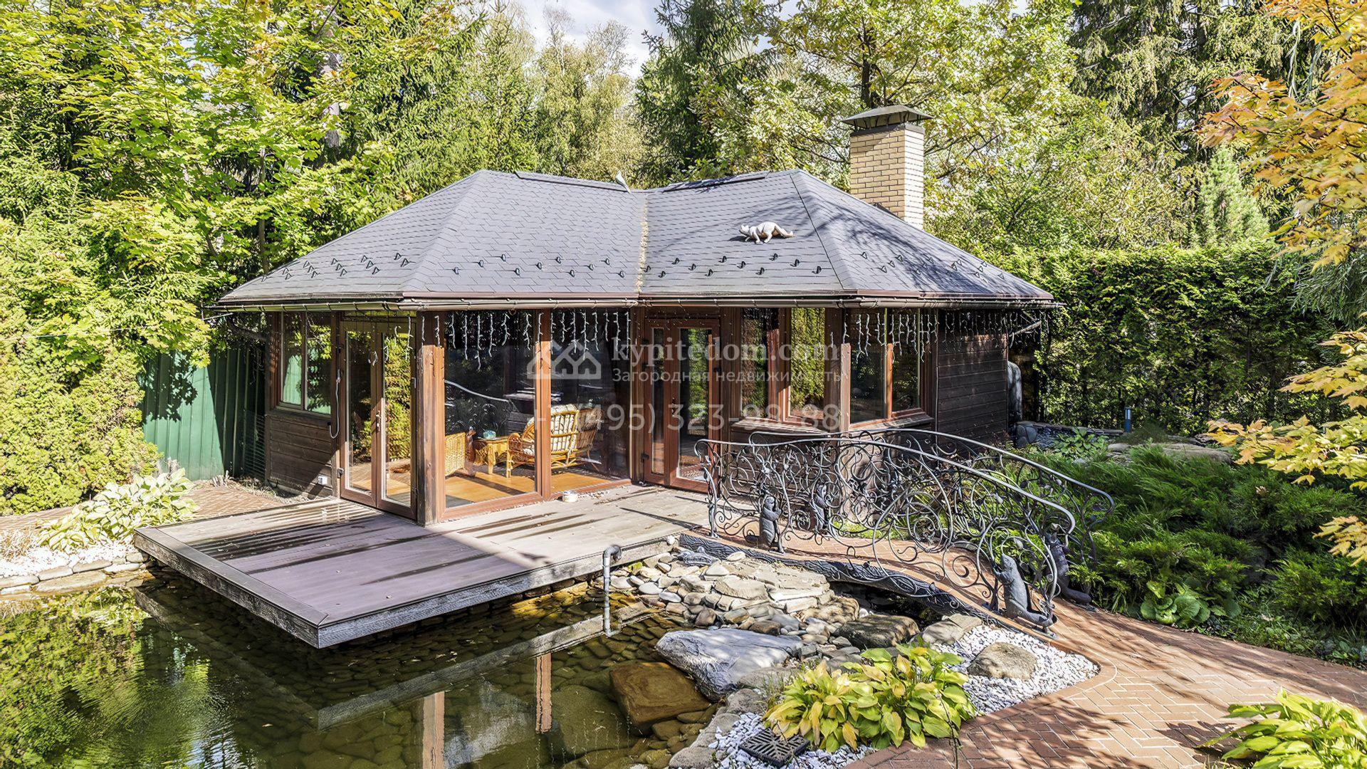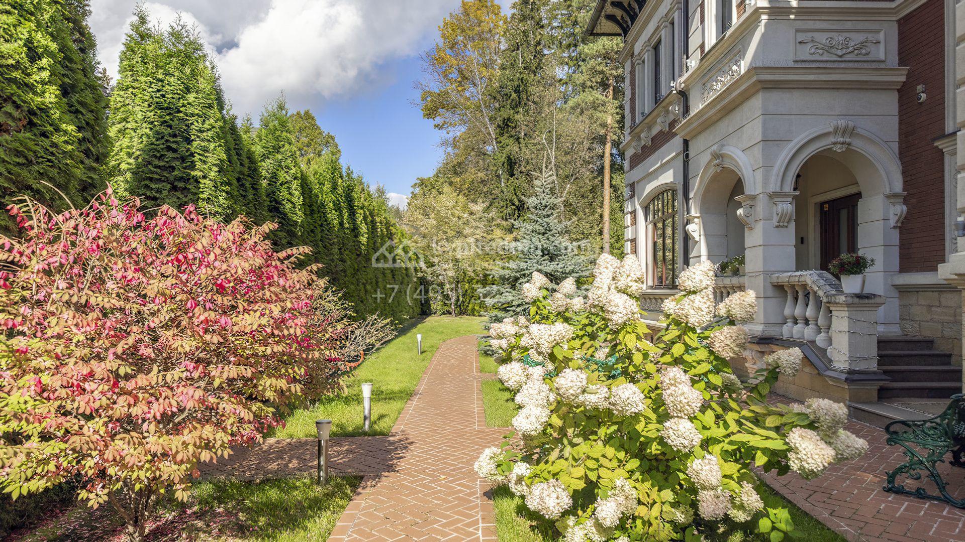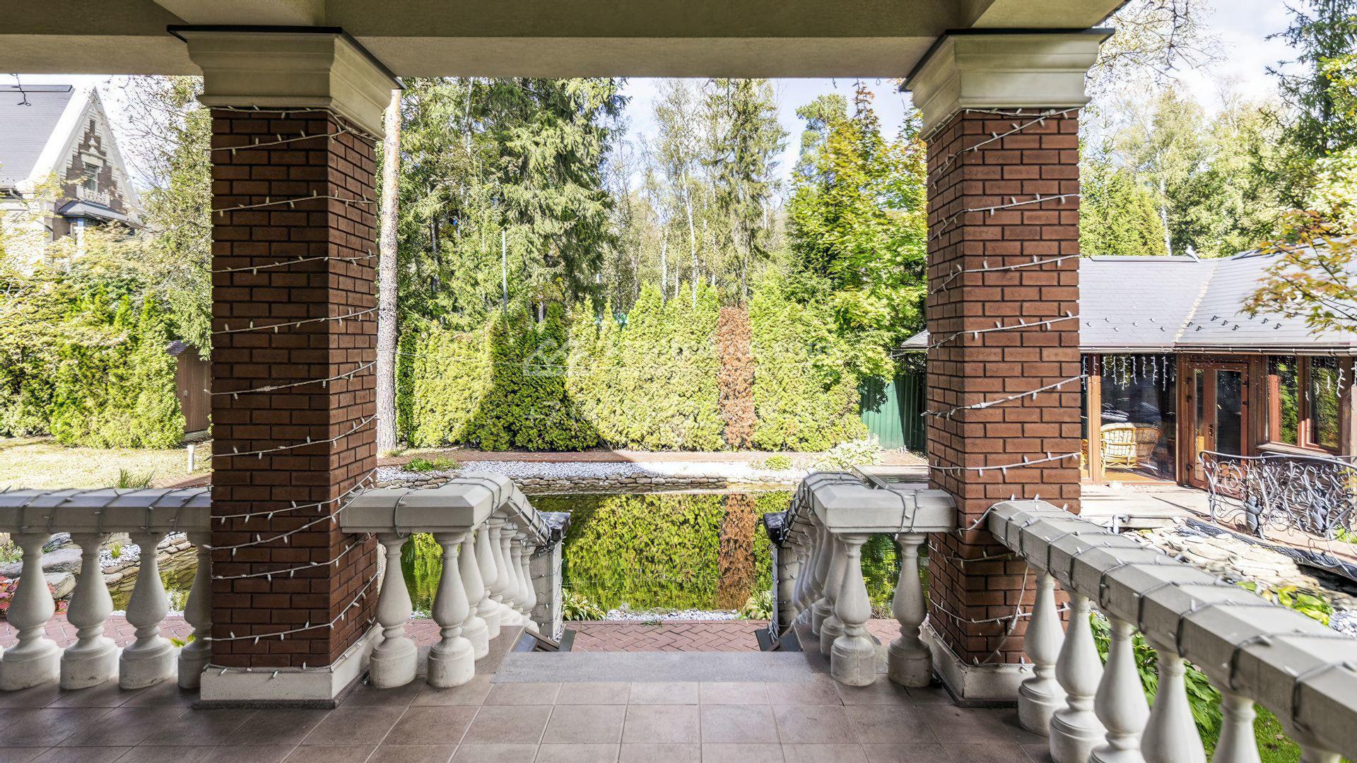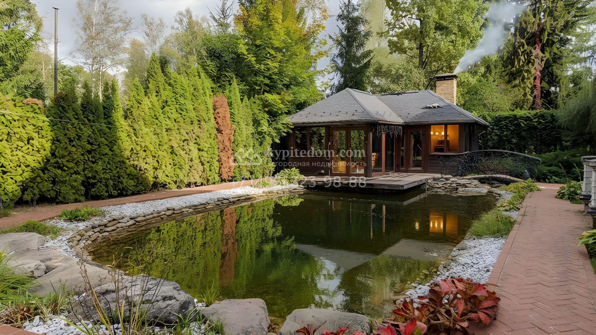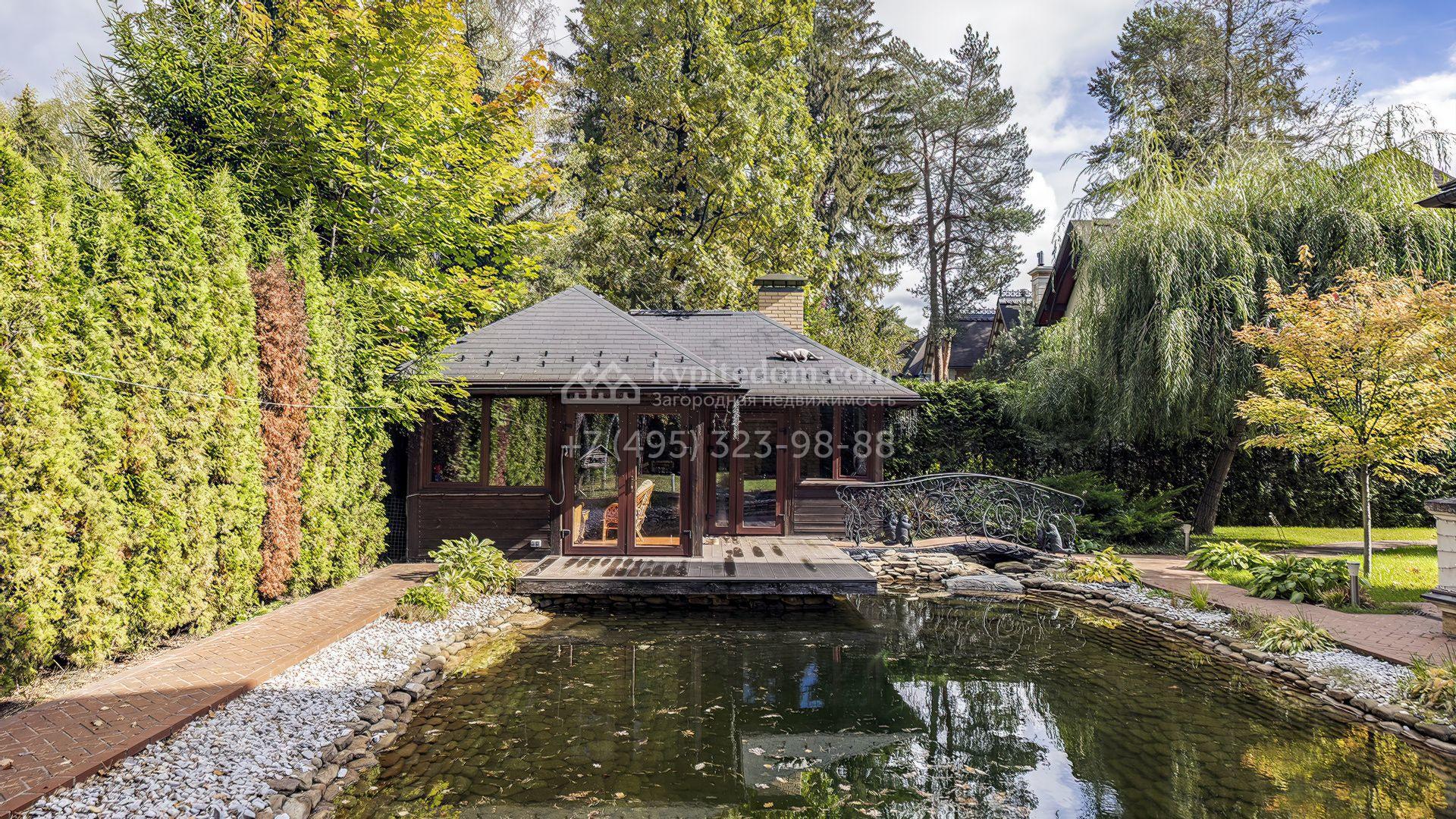Пространство участка продумано до мелочей: высажены зрелые деревья, кустарники и цветники, проложены аккуратные дорожки, установлено мягкое освещение. Центром ландшафтной композиции стал пруд с природным каменным обрамлением и беседкой у воды, где оборудована кухня и зона для барбекю. Дополняет инфраструктуру гараж на две машины с отдельной квартирой для персонала.