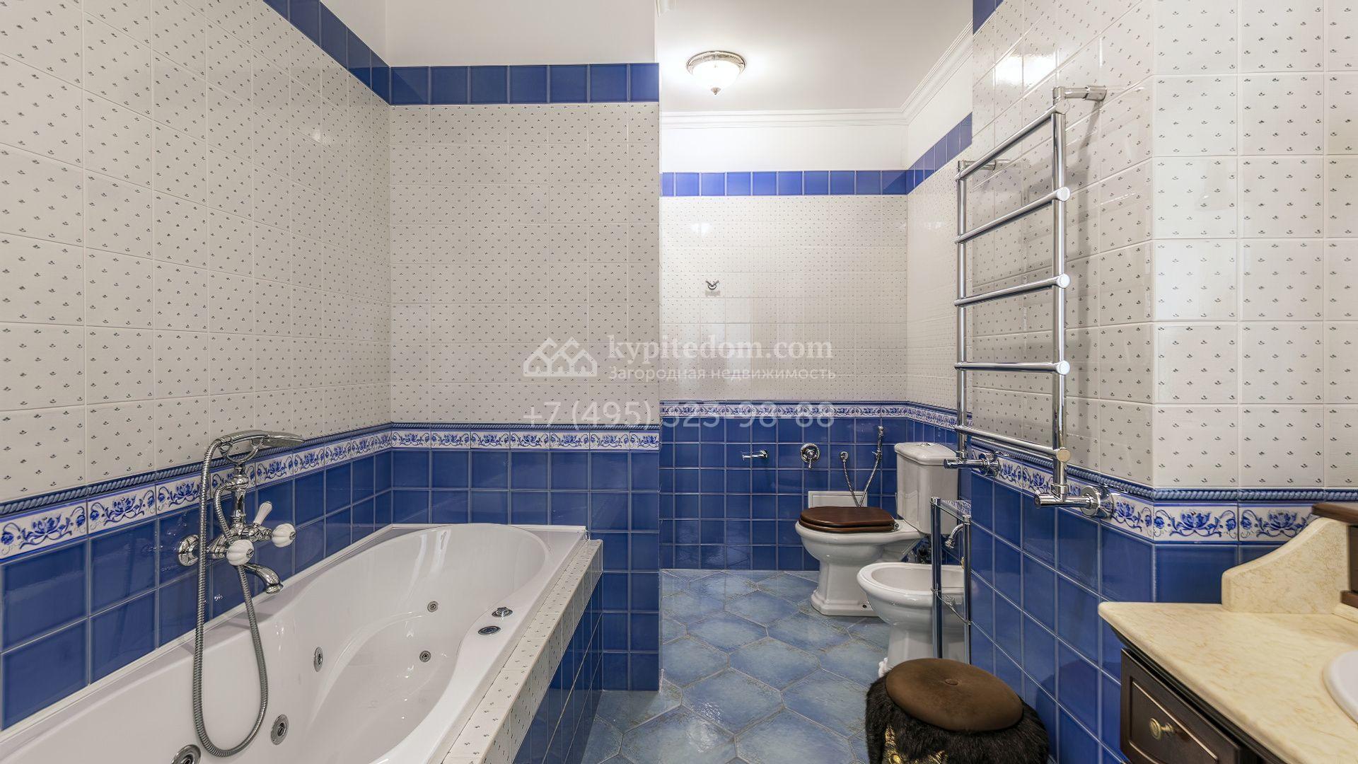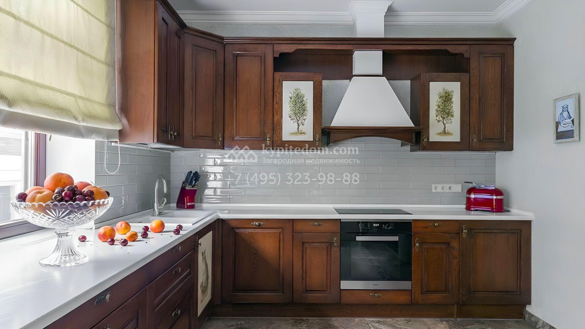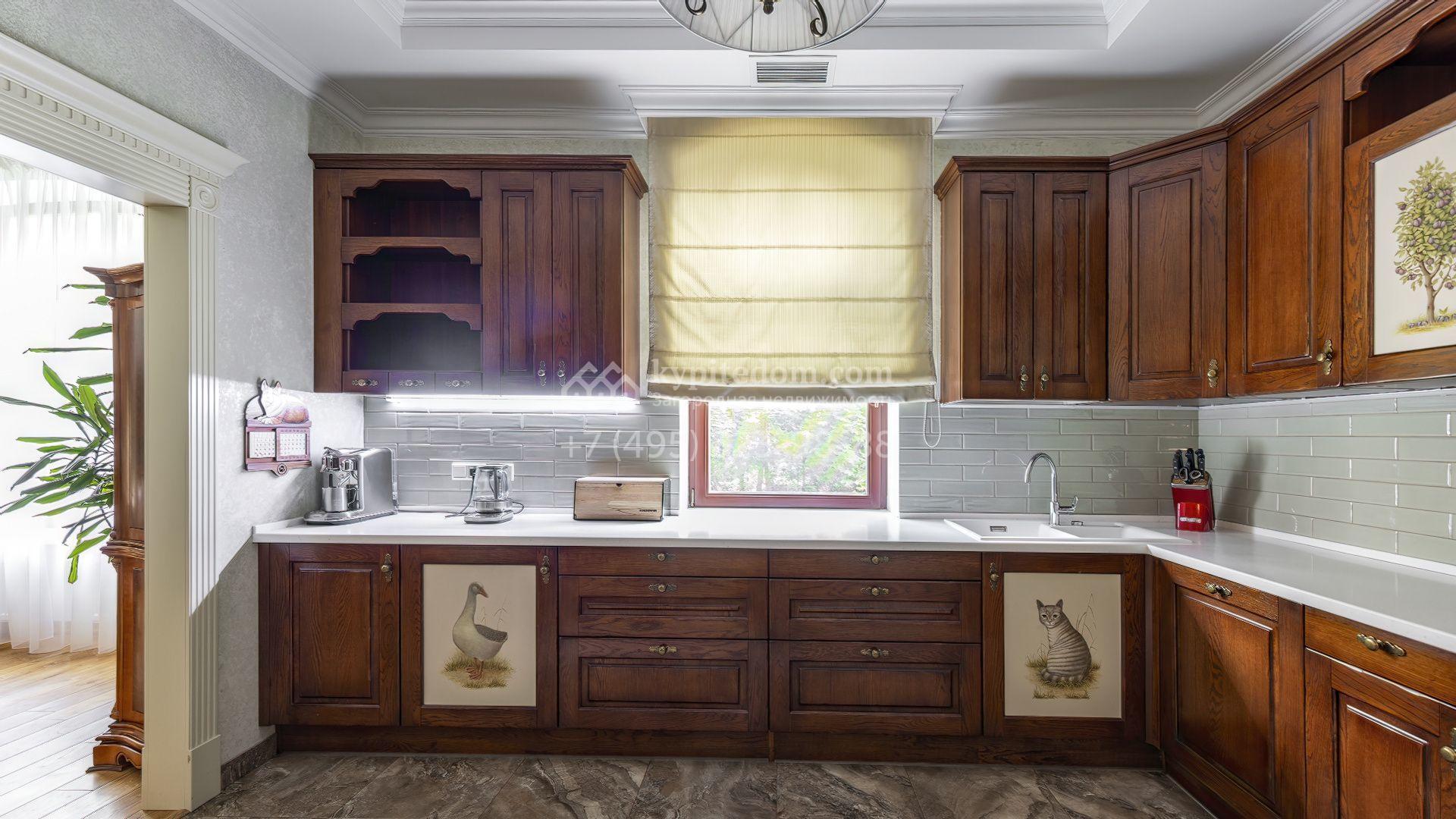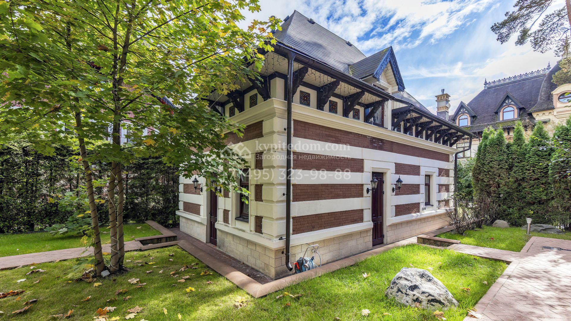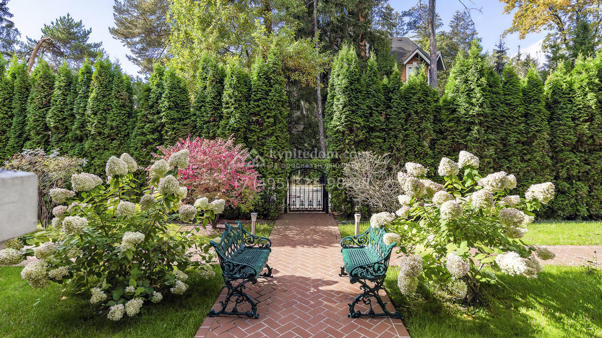 Пространство участка продумано до мелочей: высажены зрелые деревья, кустарники и цветники, проложены аккуратные дорожки, установлено мягкое освещение. Центром ландшафтной композиции стал пруд с природным каменным обрамлением и беседкой у воды, где оборудована кухня и зона для барбекю. Дополняет инфраструктуру гараж на две машины с отдельной квартирой для персонала.